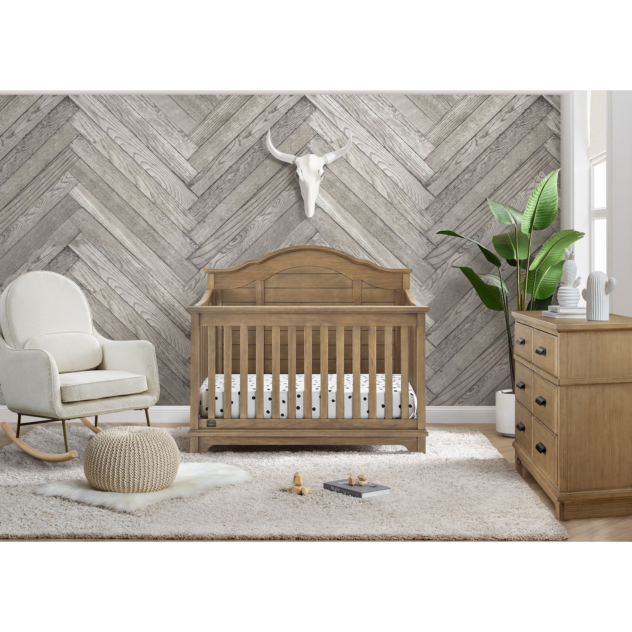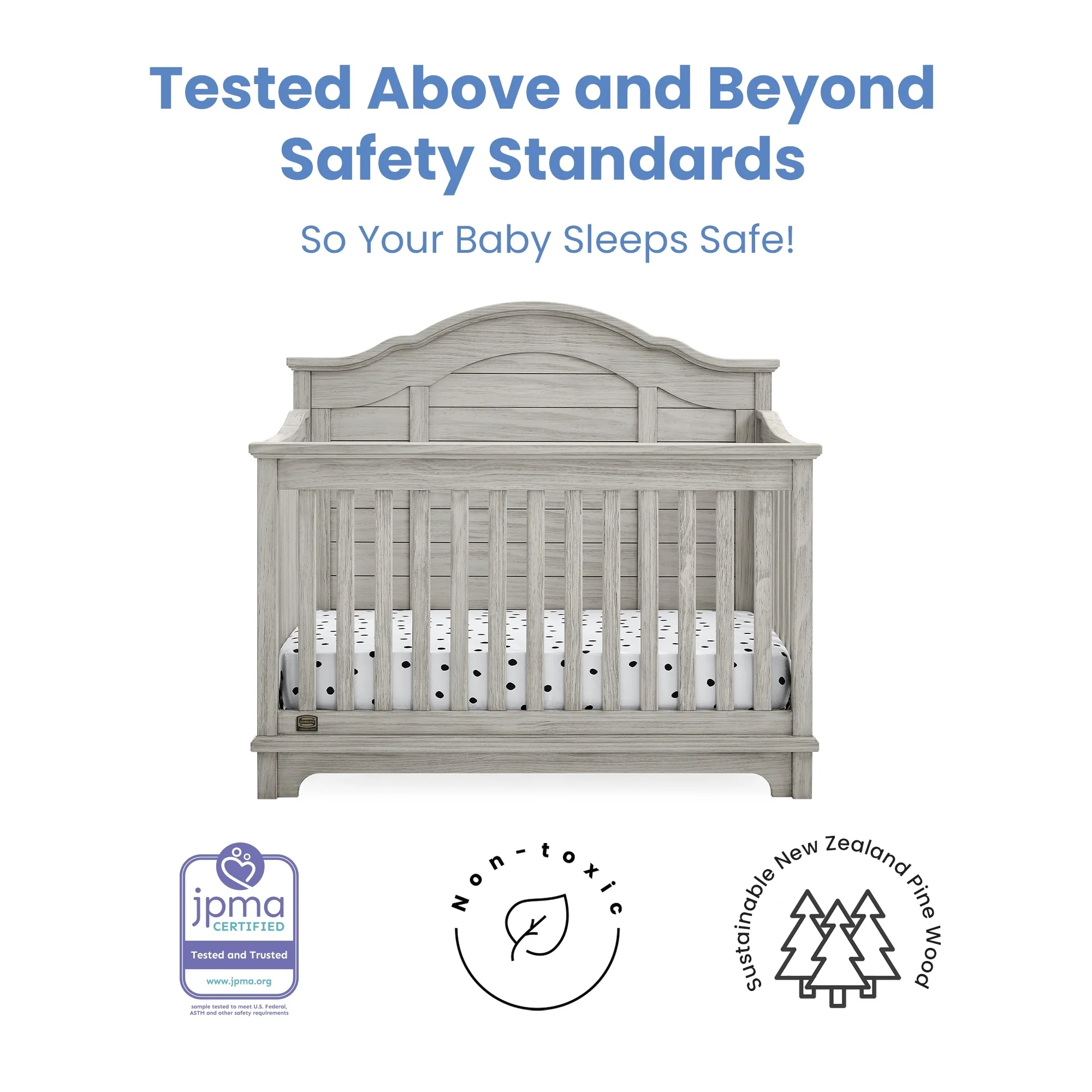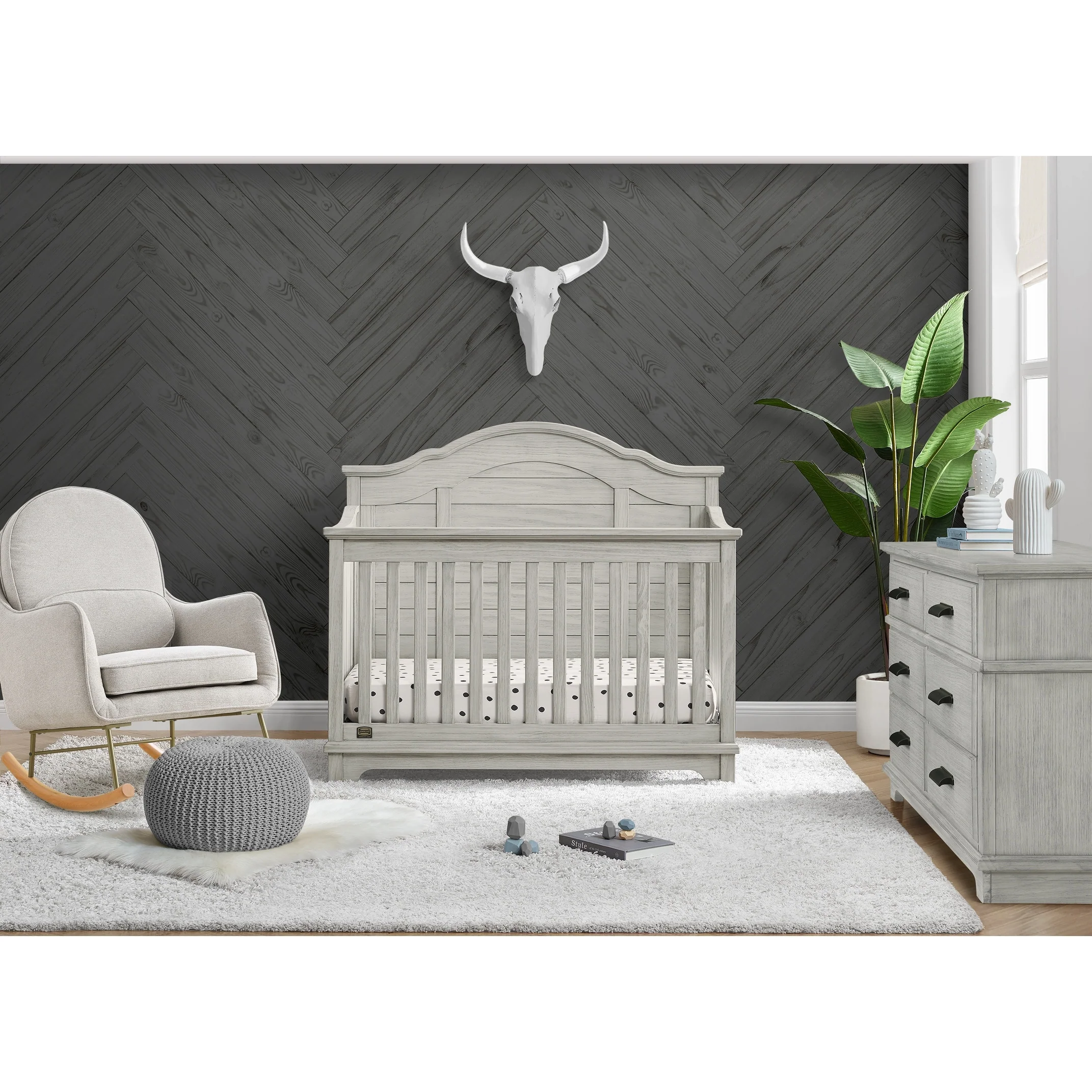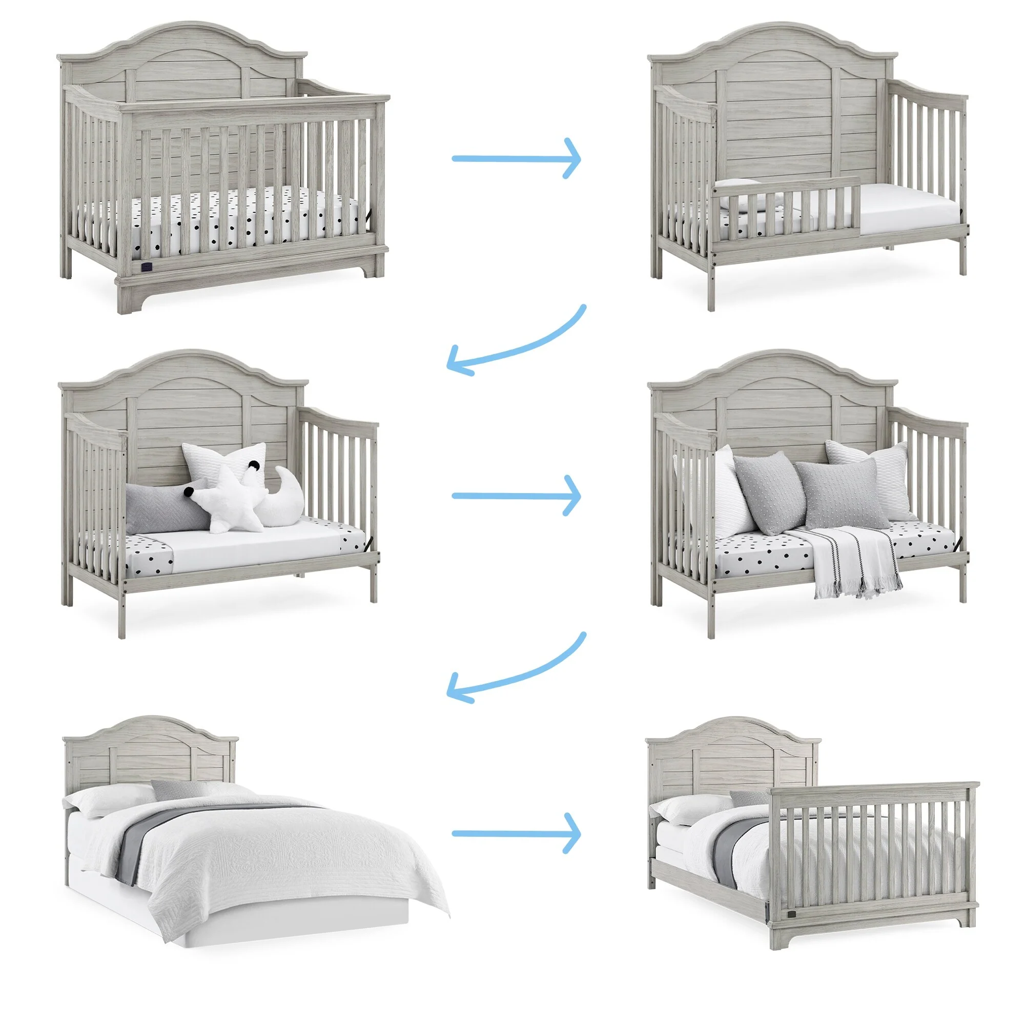 The elegant curves and shiplap-inspired headboard of the Asher 6-in-1 Convertible Baby Crib by Simmons Kids are brought to life with a lightly textured finish. A great option for your baby's nursery, this convertible crib features a dramatic silhouette that will make it the focal point of any bedroom for years to come. Its grow-with-me design features three adjustable height levels that allow the crib to be lowered as your child grows, plus it converts from a crib, to a toddler bed, sofa, daybed, full size bed with headboard or full size bed with headboard and footboard. The only bed your little one will ever need, this versatile crib will take you from the nursery to high school, and all the years in between. Toddler Guardrail included; Full Size Bed Rails sold separately. Given the hand applied nature of this baby crib's finish, variations in the wood are to be expected and celebrated.