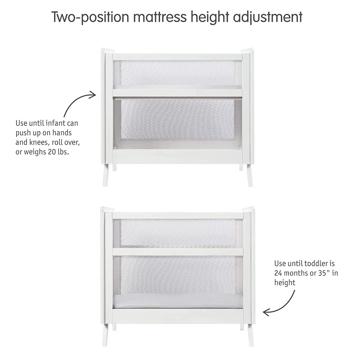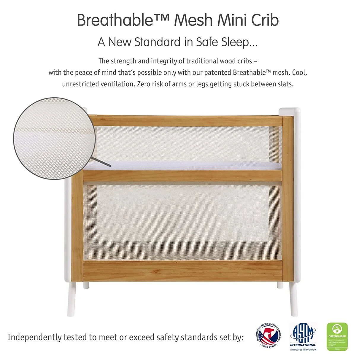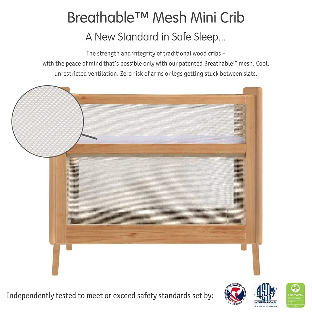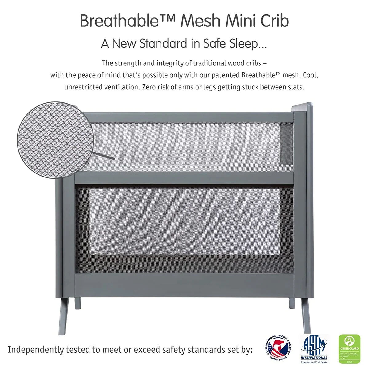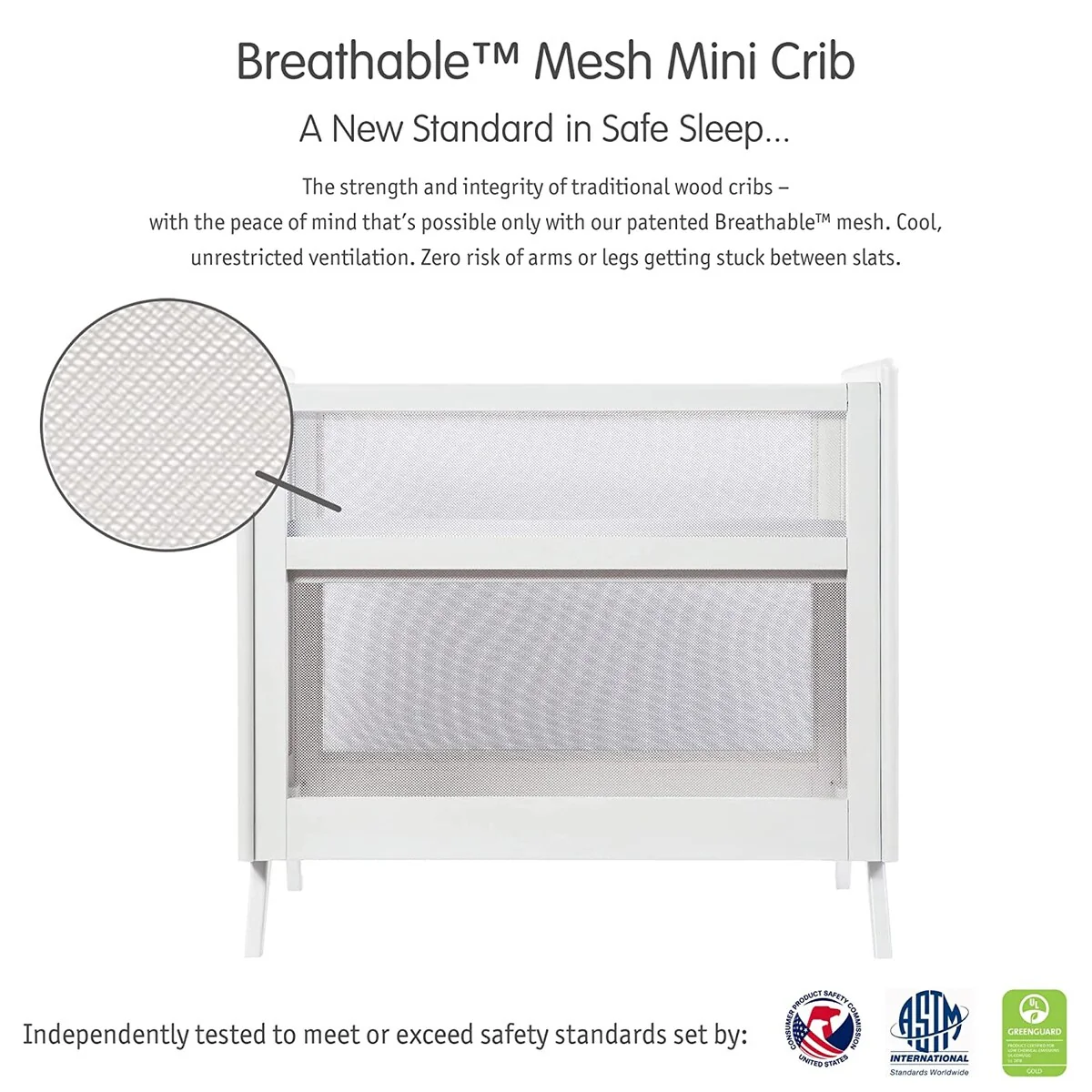 We set the bar in breathability with our patented mesh crib liners. So, we decided to tackle the crib itself. Say hello to the space saving Breathable Mesh 2-in-1 Mini Crib. It combines the strength and integrity of traditional wood cribs — with the peace of mind that's possible only with our patented breathable mesh. Cool, unrestricted ventilation. Zero risk of arms or legs getting stuck between slats. No pacifiers thrown out. No more cries.