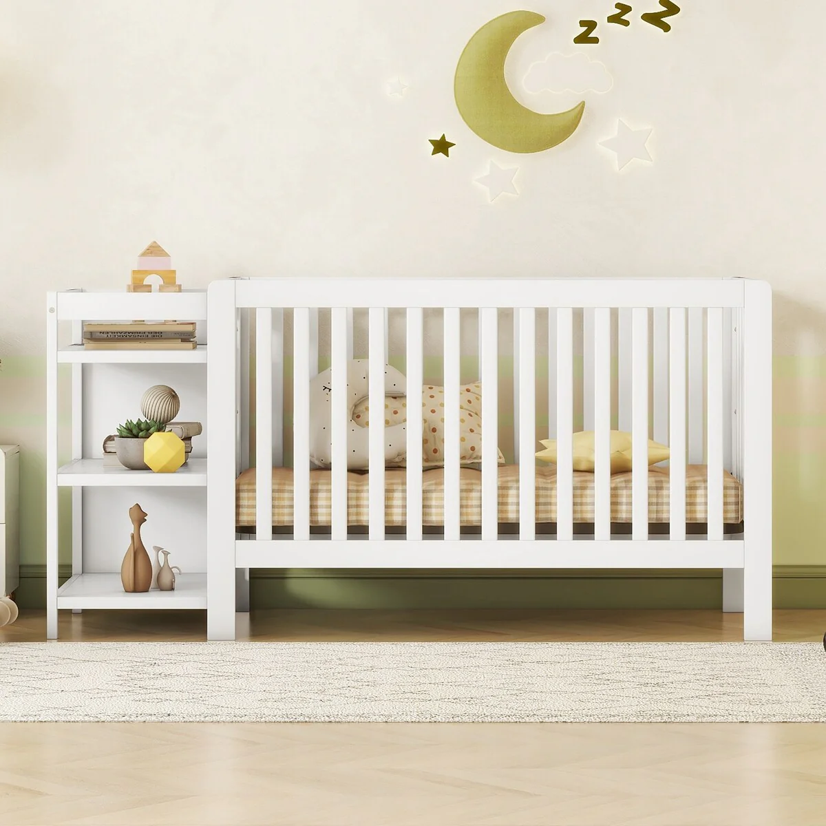 This convertible crib/full-size bed with changing table is a convenient and practical choice for parents. The changing table provides a safe and convenient space for diaper changes and other necessary tasks. As your child grows, the changing table can be easily removed, transforming the bed into a full-size bed that will last through their teenage years. The sturdy construction and classic design make this bed an excellent addition to any nursery or bedroom.