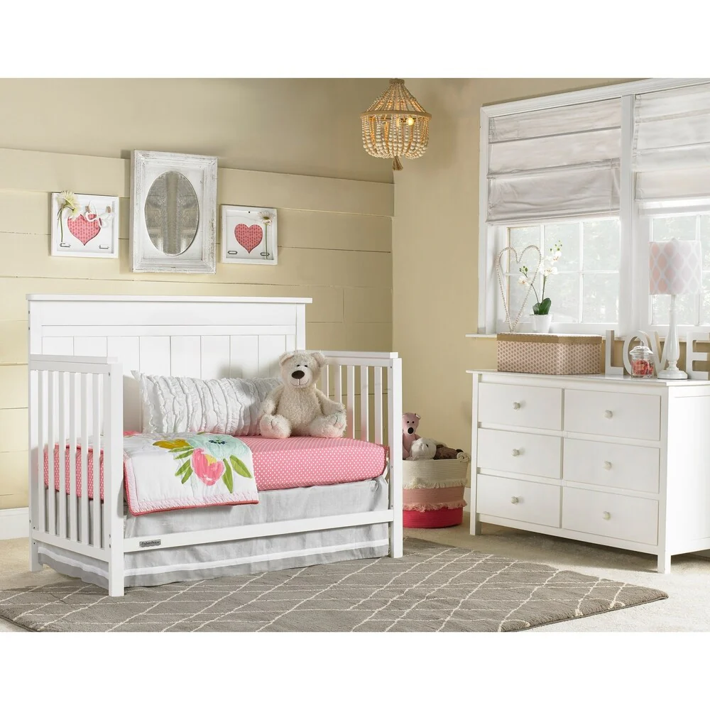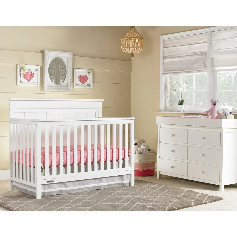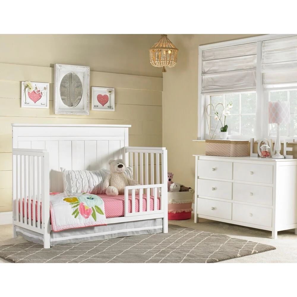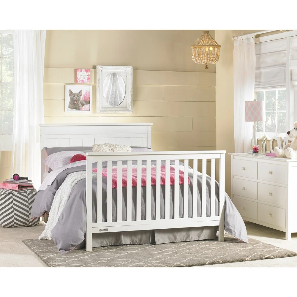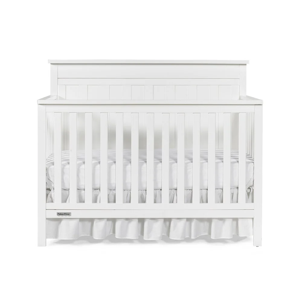 Fisher-Price Clayton Convertible Crib. This is the perfect transitional style crib that can go totally Farmhouse Chic or stay in the transitional lane. Decorating options are endless with the full panel headboard adorned in a batten and board style giving a very high-end look in the nursery and beyond. Made of New Zealand Pine, a sustainable and renewable resource. Available in Snow White or Stormy Grey finish. Toddler Guard Rail and Full Bed Conversion Rail sold separately.