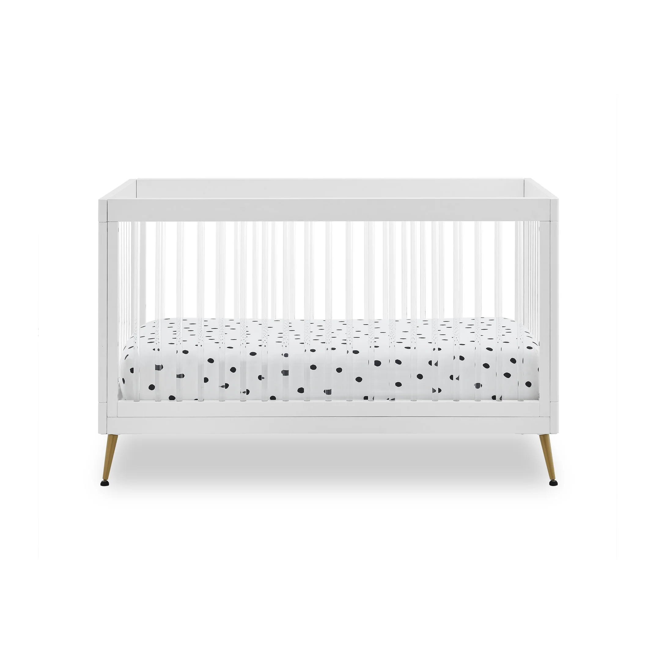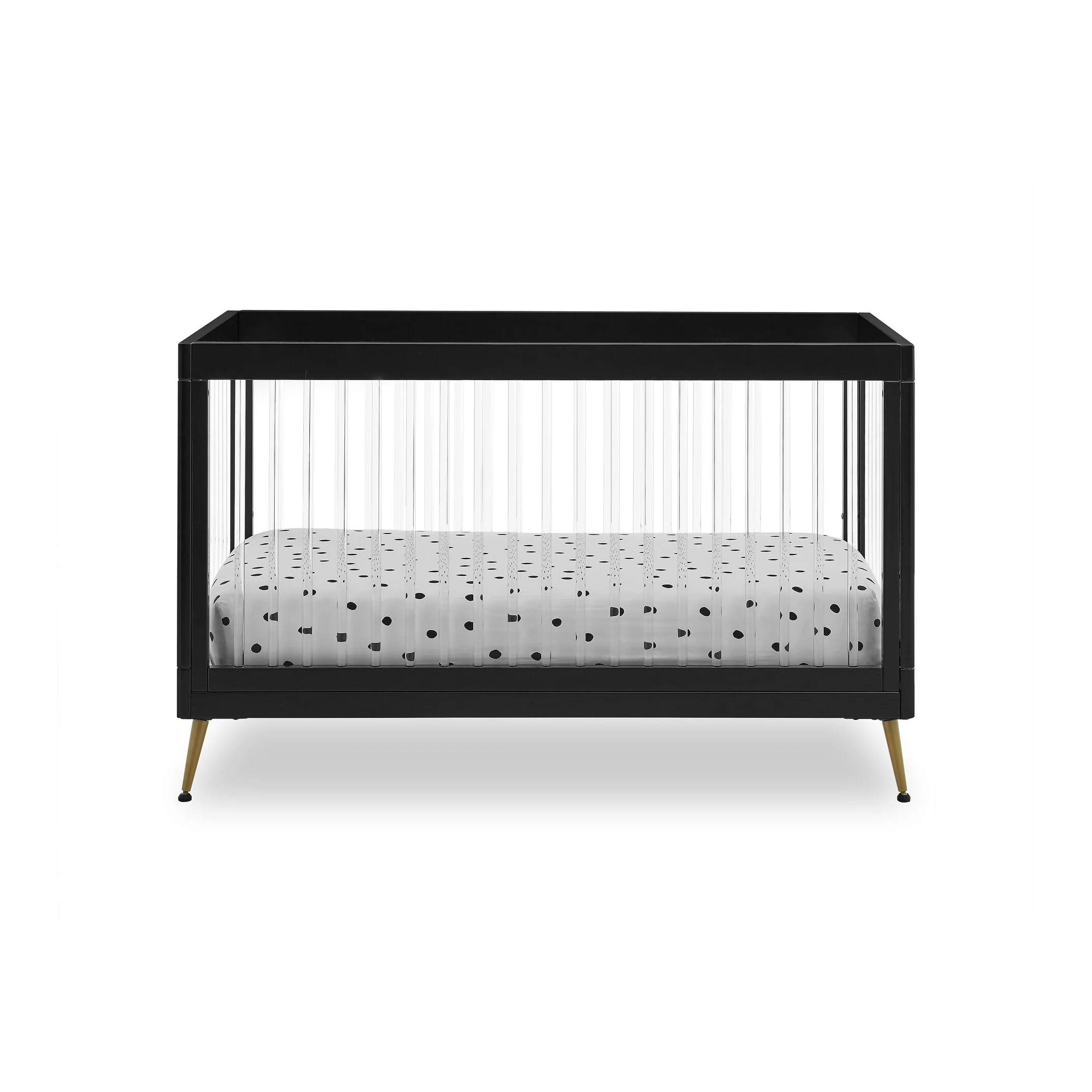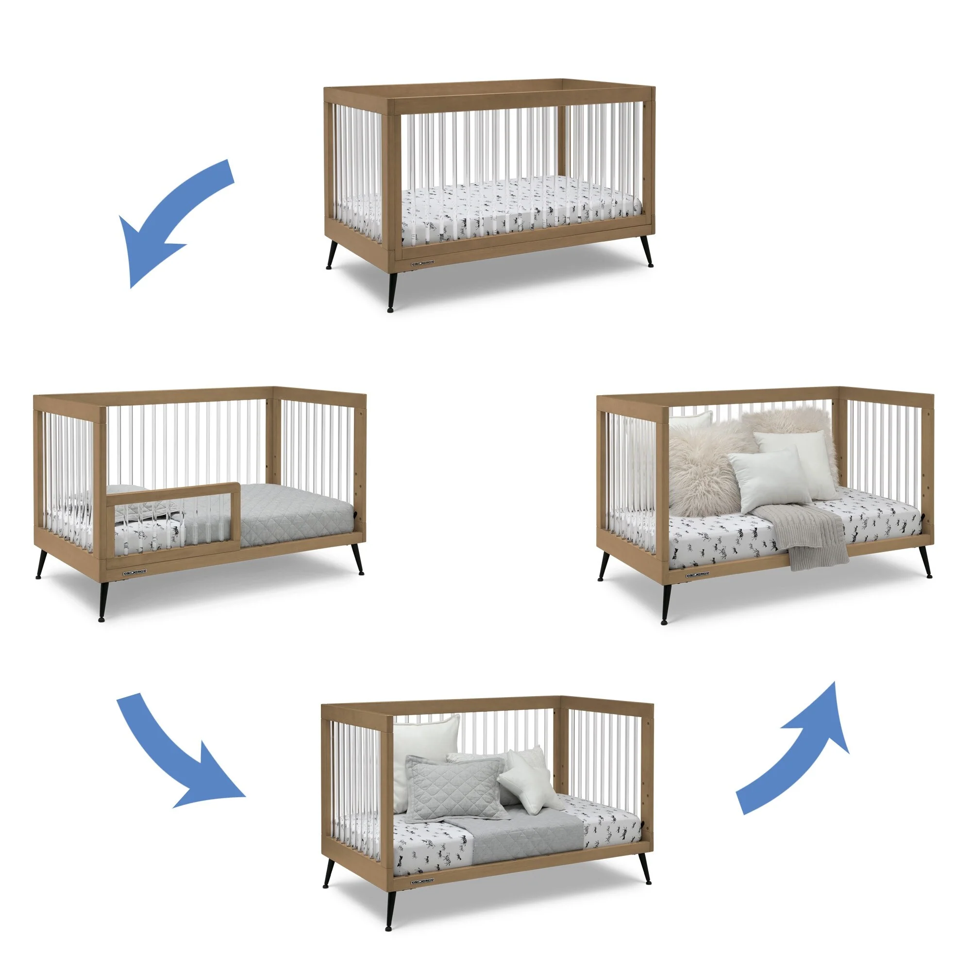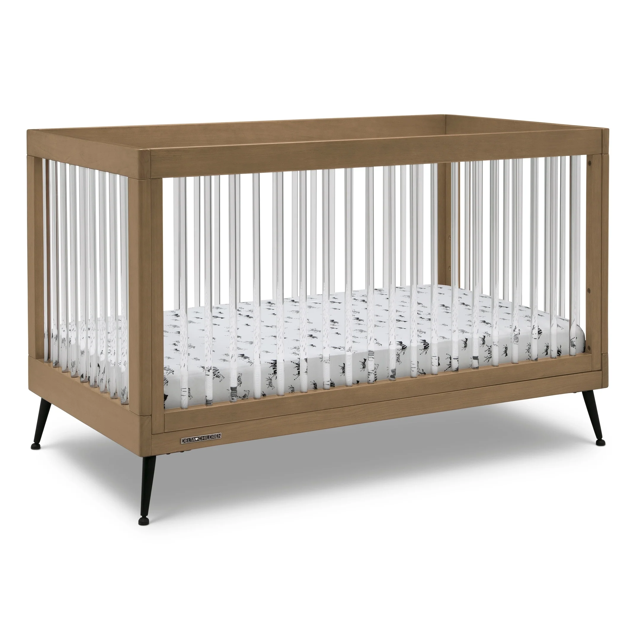 The Sloane 4-in-1 Acrylic Convertible Crib by Delta Children is the clear choice for your baby's modern nursery! Its unique design features clear acrylic spindles that provide an open, airy feel while the splayed feet add some polish to the clean lines. And if that's not enough, it even converts from crib to a toddler bed, sofa and daybed, making this a versatile bed that grows with your child (conversion rail included). To complete your nursery, pair with the coordinating Sloane 4 Drawer Dresser. This crib is available in Bianca White, Black and Acorn, The Acorn finish is crafted with a special hand-applied glaze for added depth and dimension.