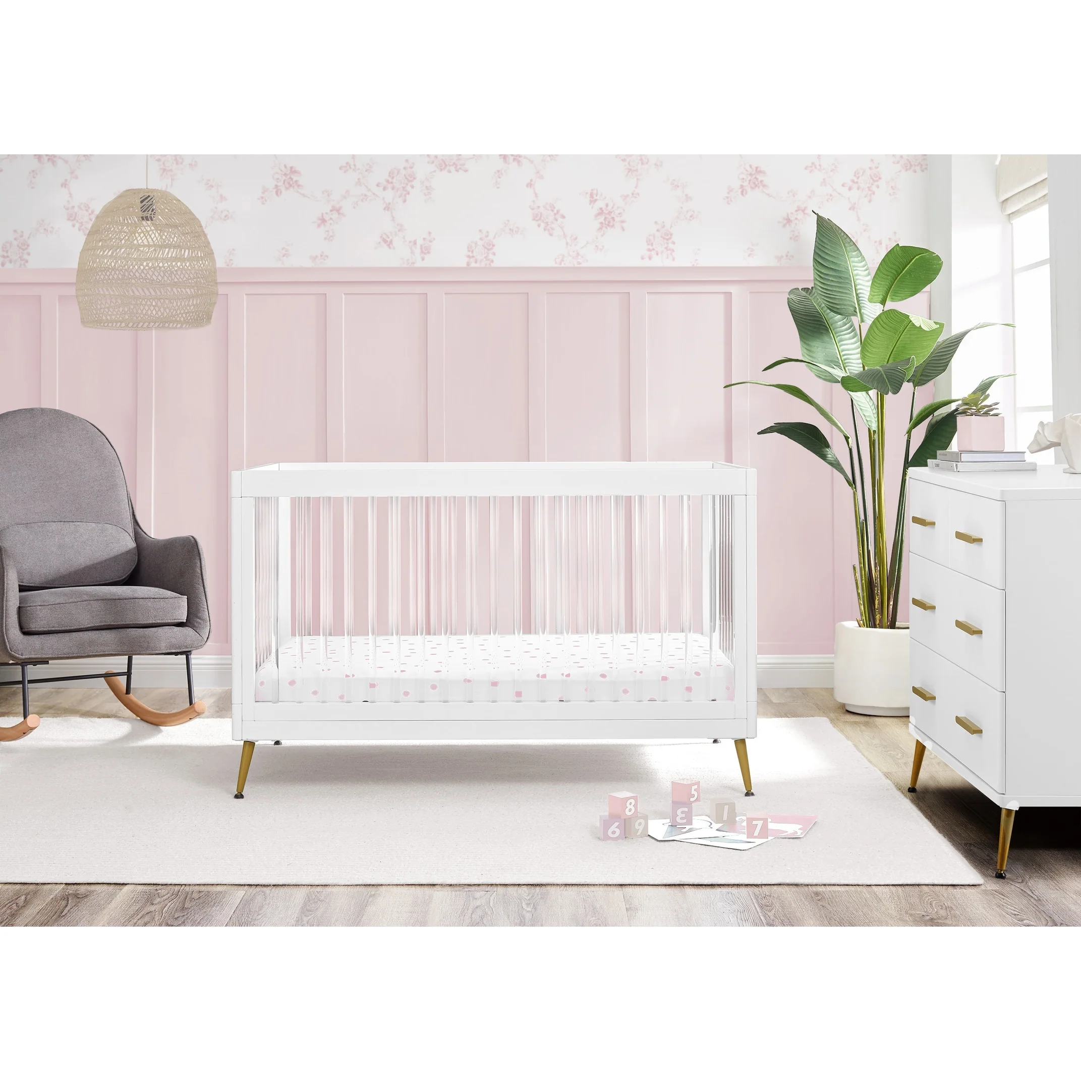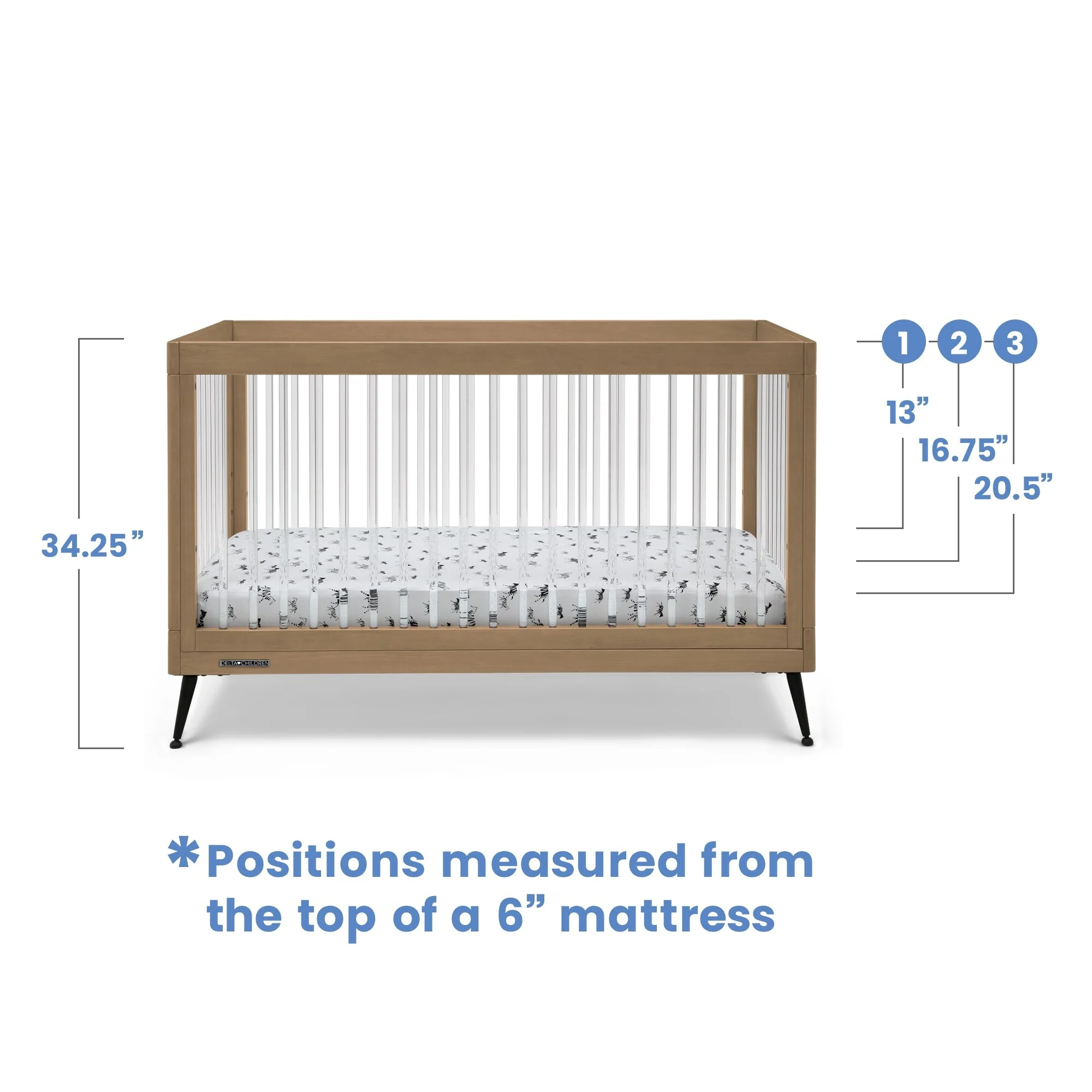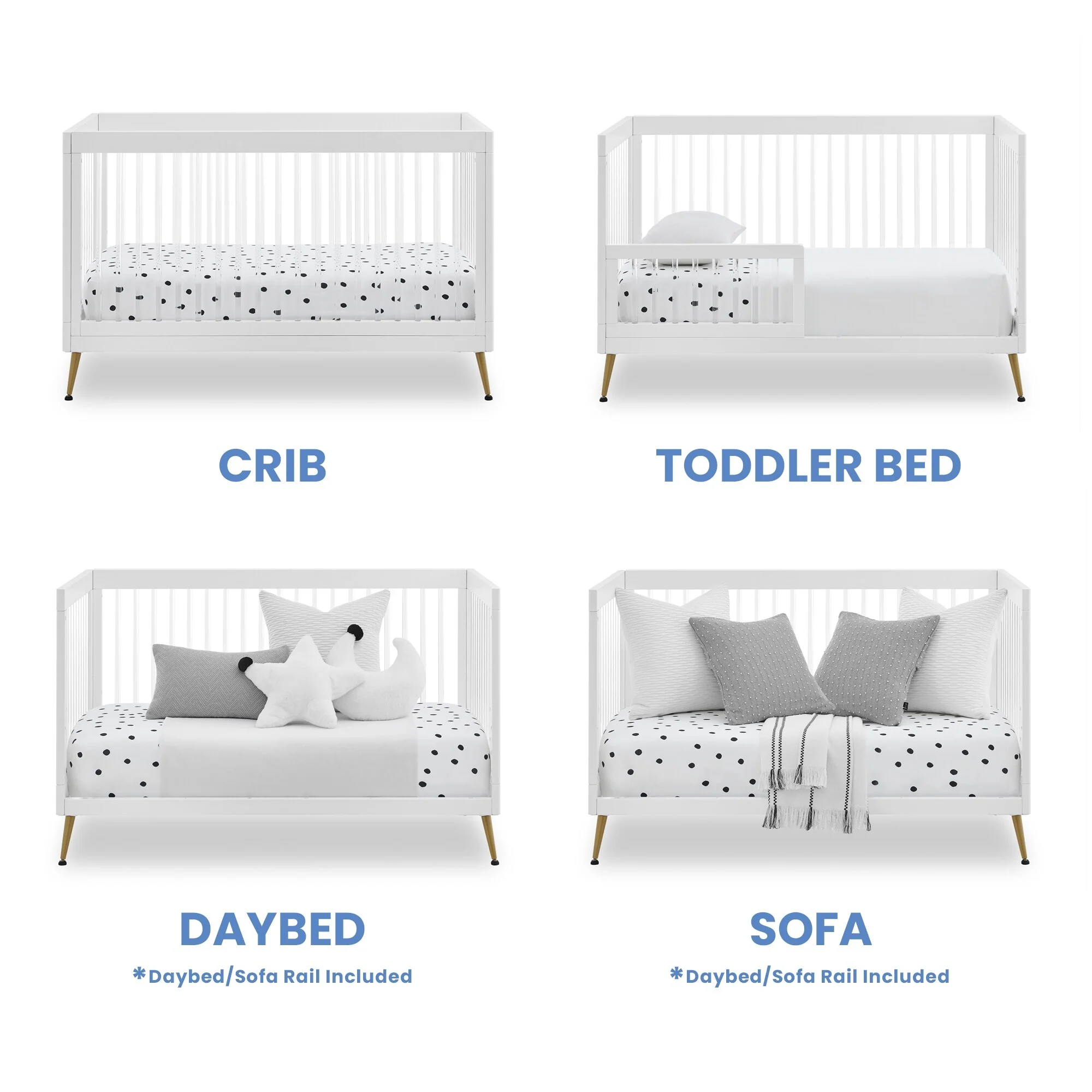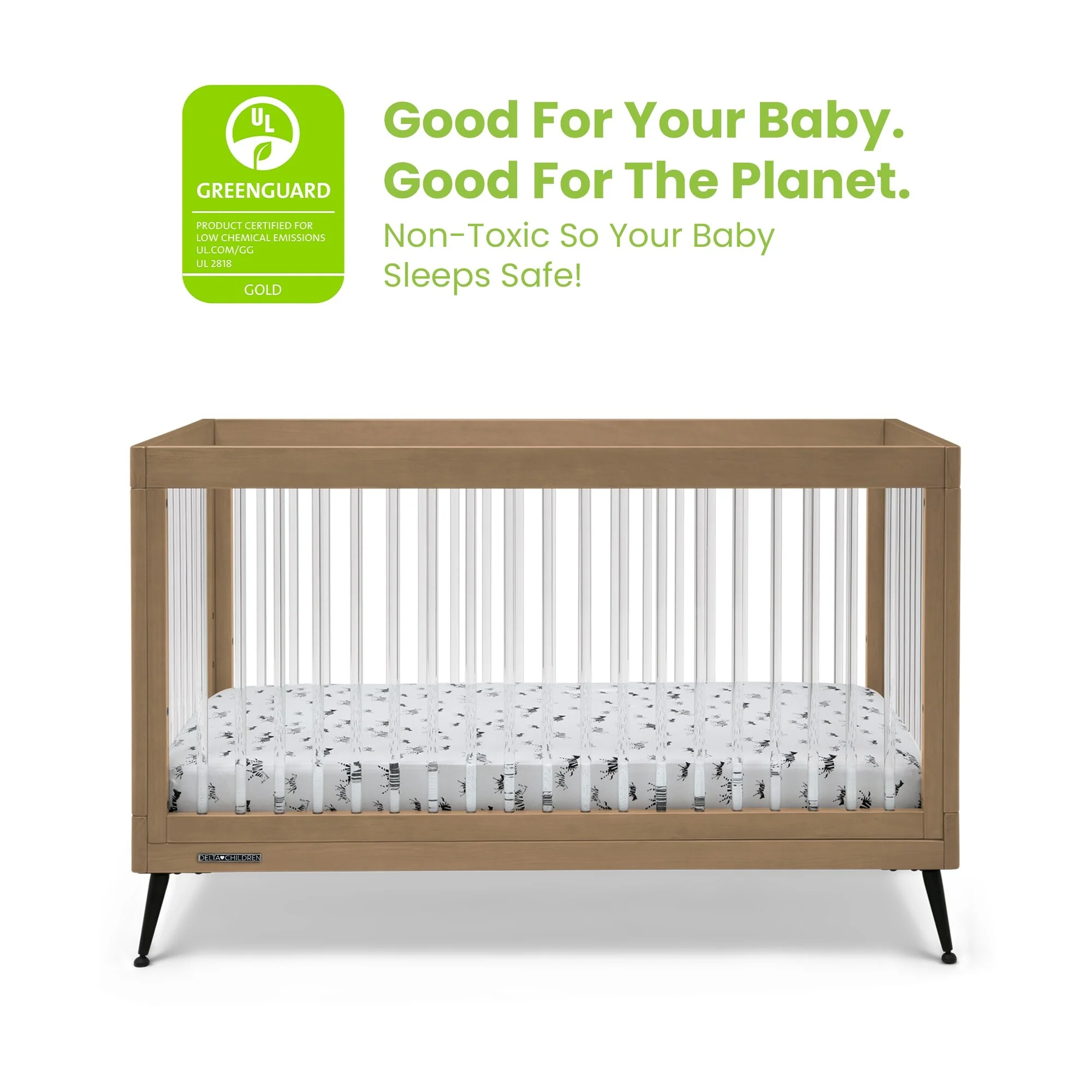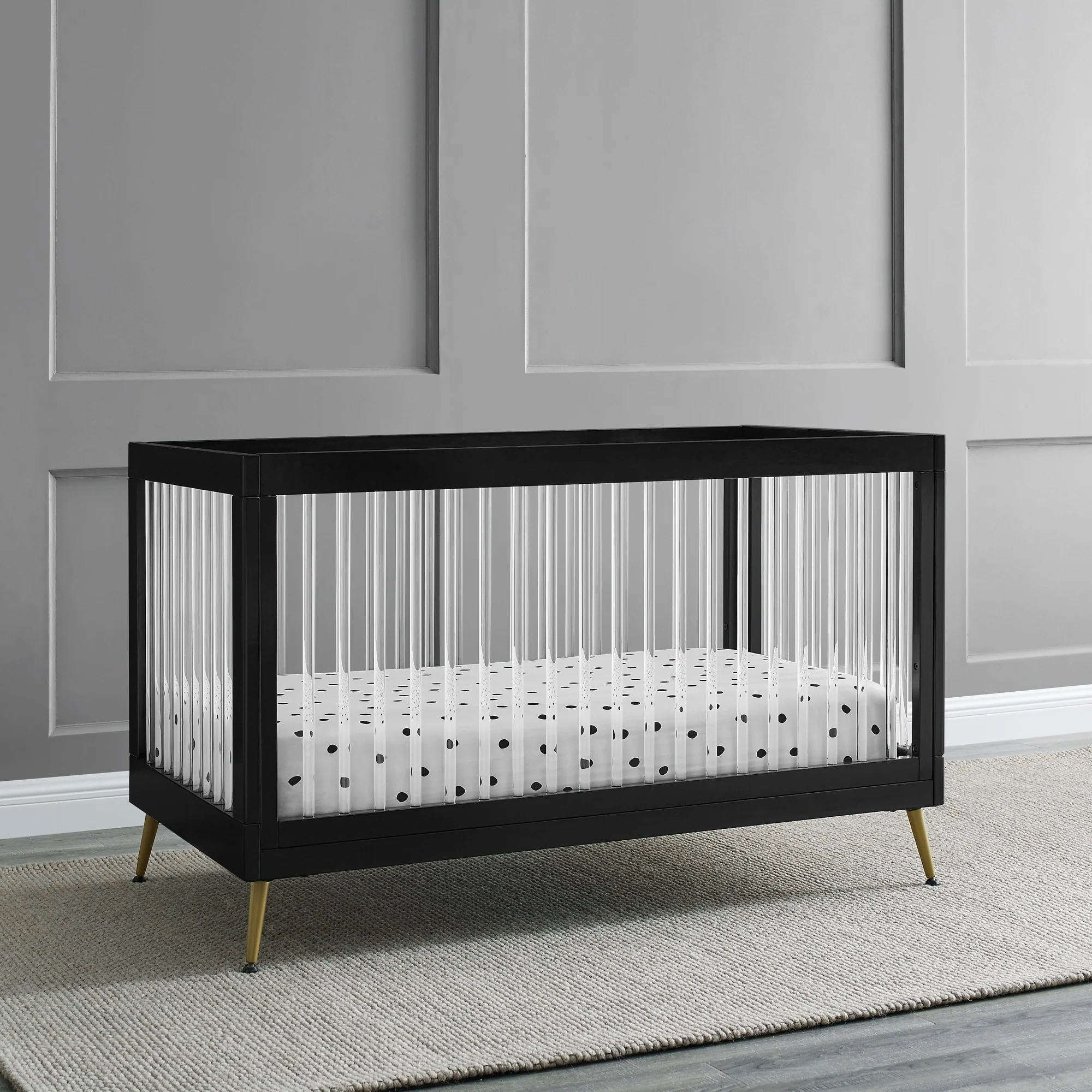 The Sloane 4-in-1 Acrylic Convertible Crib by Delta Children is the clear choice for your baby's modern nursery! Its unique design features clear acrylic spindles that provide an open, airy feel while the splayed feet add some polish to the clean lines. And if that's not enough, it even converts from crib to a toddler bed, sofa and daybed, making this a versatile bed that grows with your child (conversion rail included). To complete your nursery, pair with the coordinating Sloane 4 Drawer Dresser. This crib is available in Bianca White, Black and Acorn, The Acorn finish is crafted with a special hand-applied glaze for added depth and dimension.