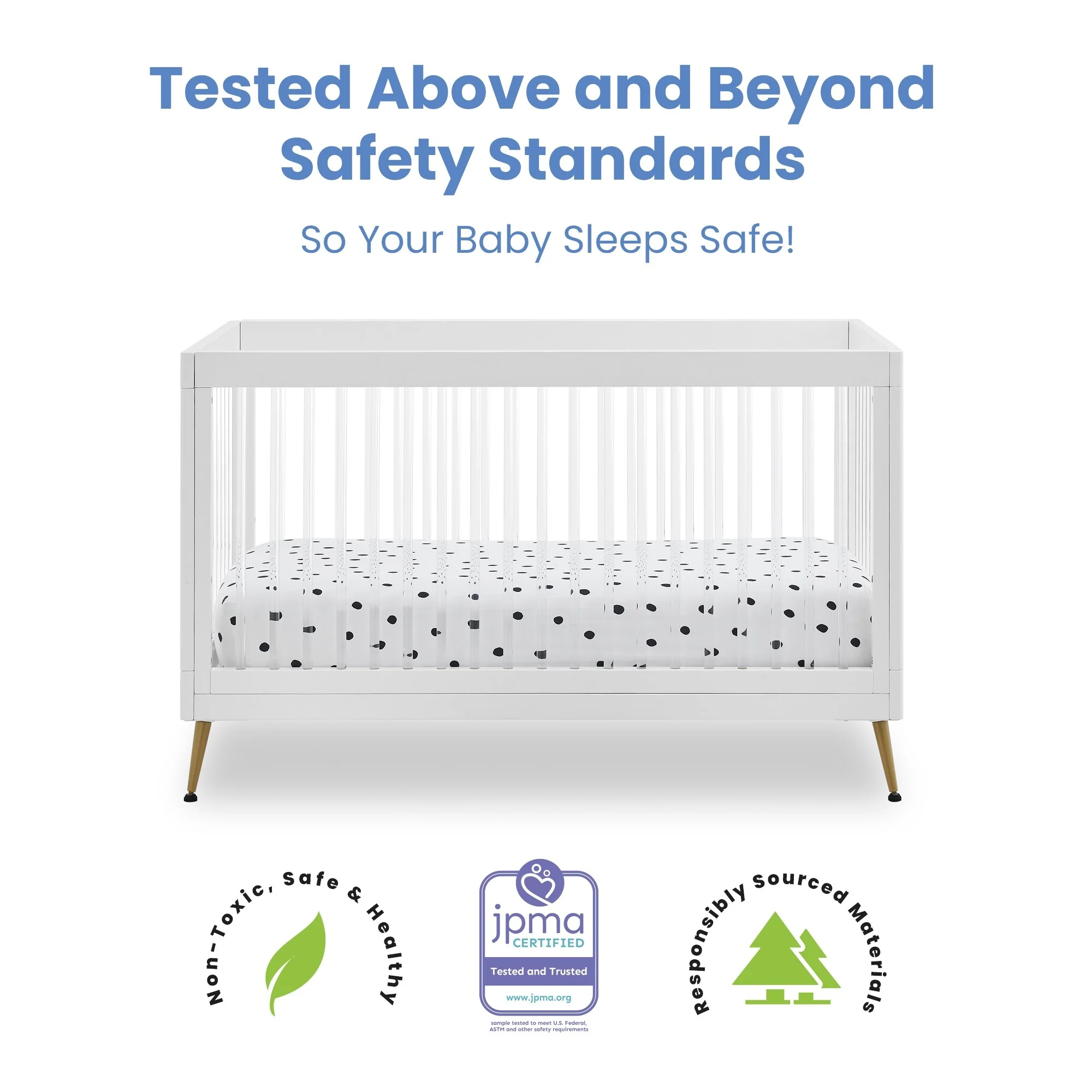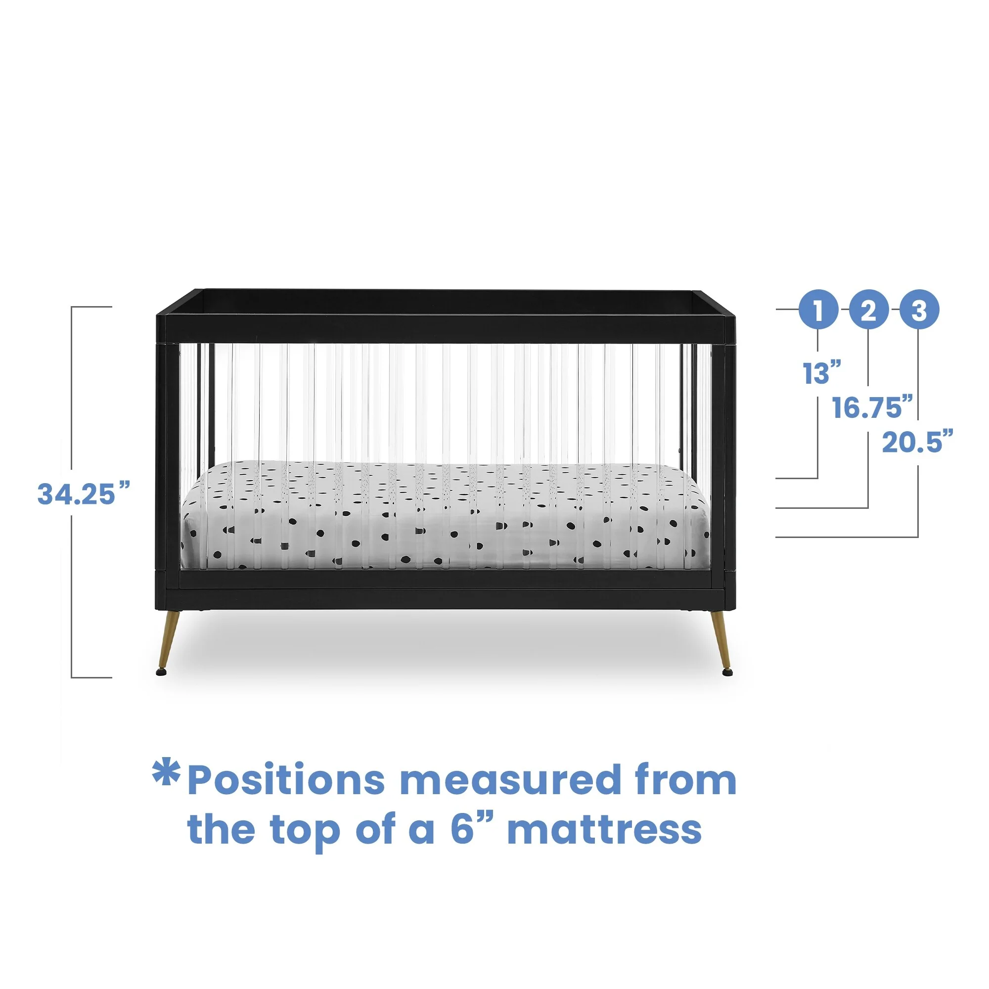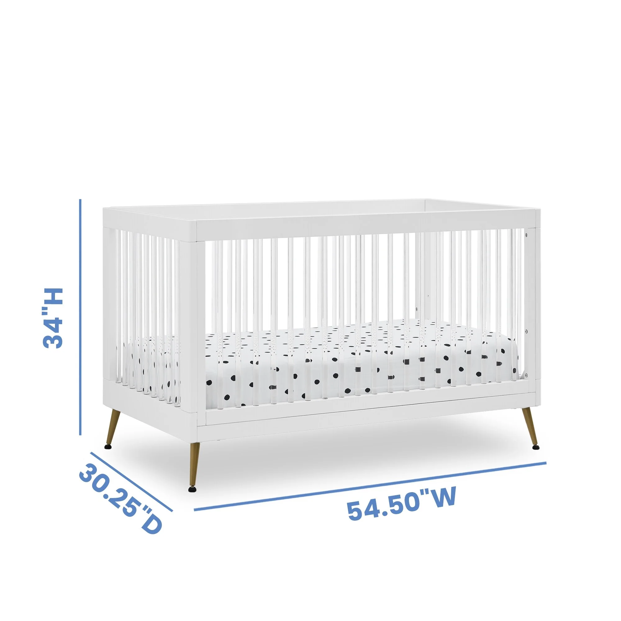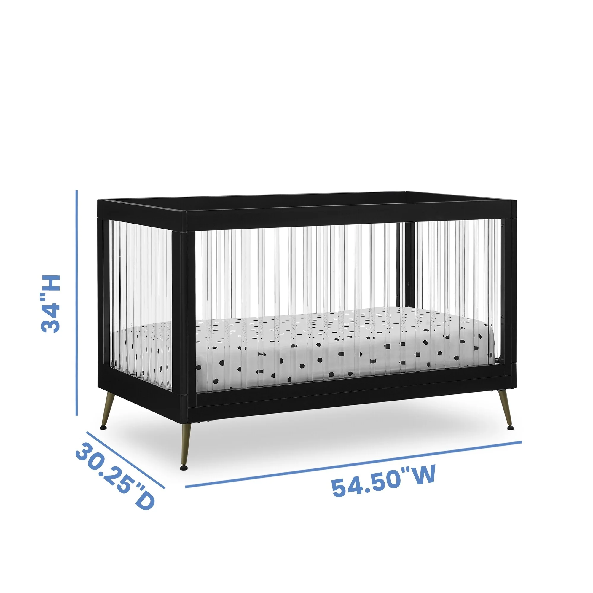 The Sloane 4-in-1 Acrylic Convertible Crib by Delta Children is the clear choice for your baby's modern nursery! Its unique design features clear acrylic spindles that provide an open, airy feel while the splayed feet add some polish to the clean lines. And if that's not enough, it even converts from crib to a toddler bed, sofa and daybed, making this a versatile bed that grows with your child (conversion rail included). To complete your nursery, pair with the coordinating Sloane 4 Drawer Dresser. This crib is available in Bianca White, Black and Acorn, The Acorn finish is crafted with a special hand-applied glaze for added depth and dimension.