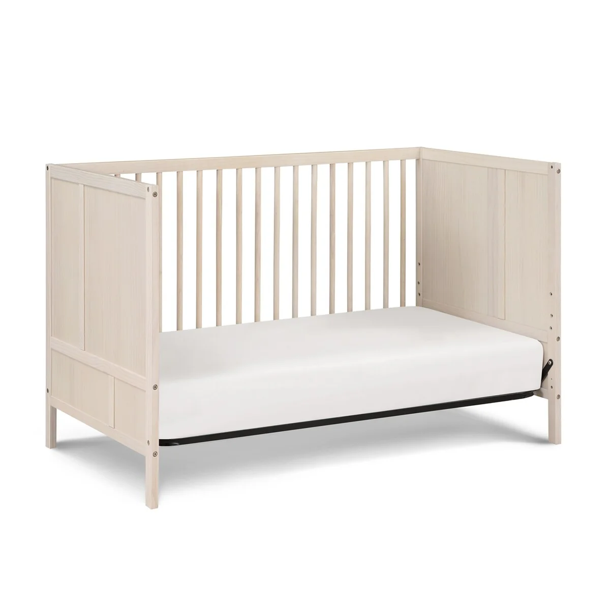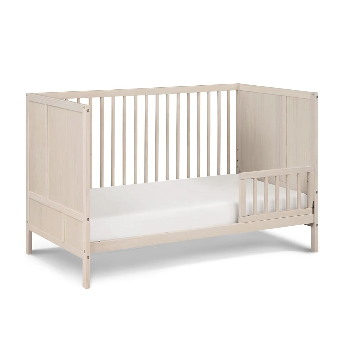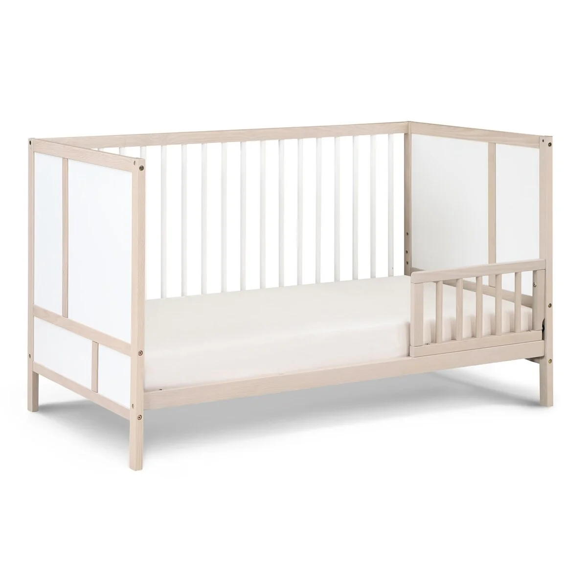 The Pixie Finn Crib is the perfect mid-century modern center piece of your nursery. Solid end panels, designed with straight geometric lines set the scene. Featuring two tone finishes or a soft washed natural finish, Finn creates an updated mid-century feel. 3 position mattress heights offer the safest sleeping space for your baby as they grow and with a lower profile height, you can easily lift the baby in and out of the crib no matter the position of the mattress. The Finn is a 3-in-1 crib that converts to a Daybed and Toddler bed with the additional purchase of the Toddler Guardrail and stabilizer kit. With the island crib design, Finn can be displayed in the middle of the room or in smaller room spaces. Made with solid woods and veneer and beautiful multi-step finishes, the Finn Crib is the haven of the room.