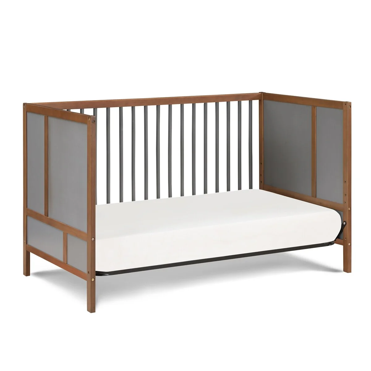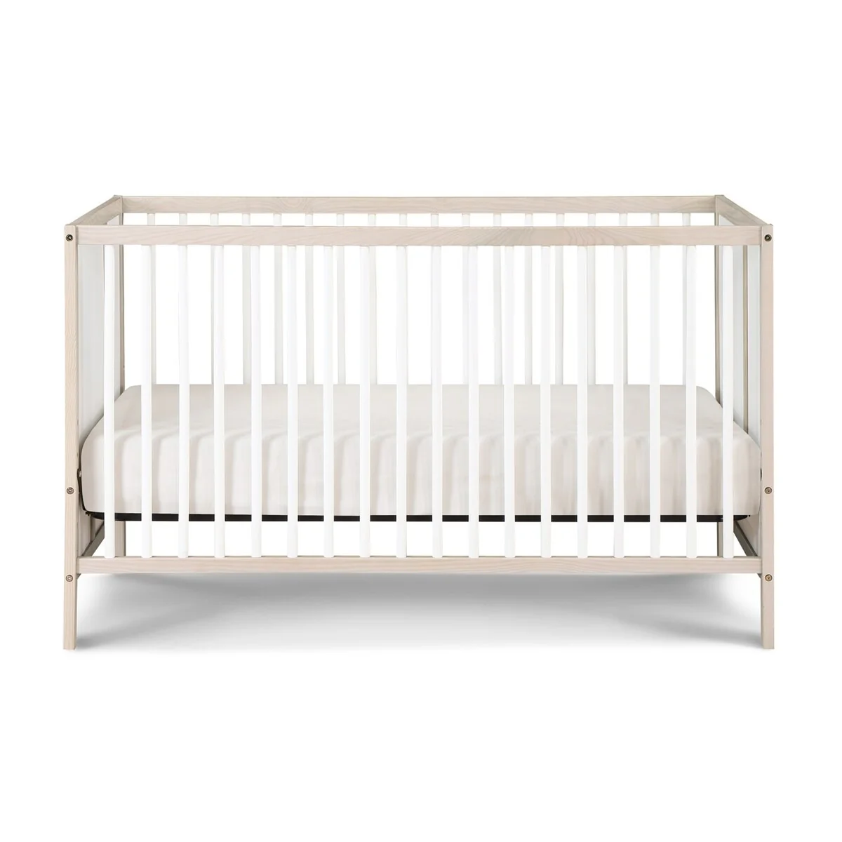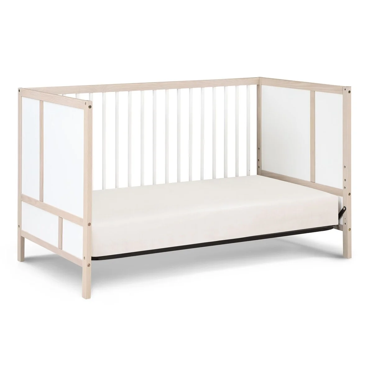 The Pixie Finn Crib is the perfect mid-century modern center piece of your nursery. Solid end panels, designed with straight geometric lines set the scene. Featuring two tone finishes or a soft washed natural finish, Finn creates an updated mid-century feel. 3 position mattress heights offer the safest sleeping space for your baby as they grow and with a lower profile height, you can easily lift the baby in and out of the crib no matter the position of the mattress. The Finn is a 3-in-1 crib that converts to a Daybed and Toddler bed with the additional purchase of the Toddler Guardrail and stabilizer kit. With the island crib design, Finn can be displayed in the middle of the room or in smaller room spaces. Made with solid woods and veneer and beautiful multi-step finishes, the Finn Crib is the haven of the room.