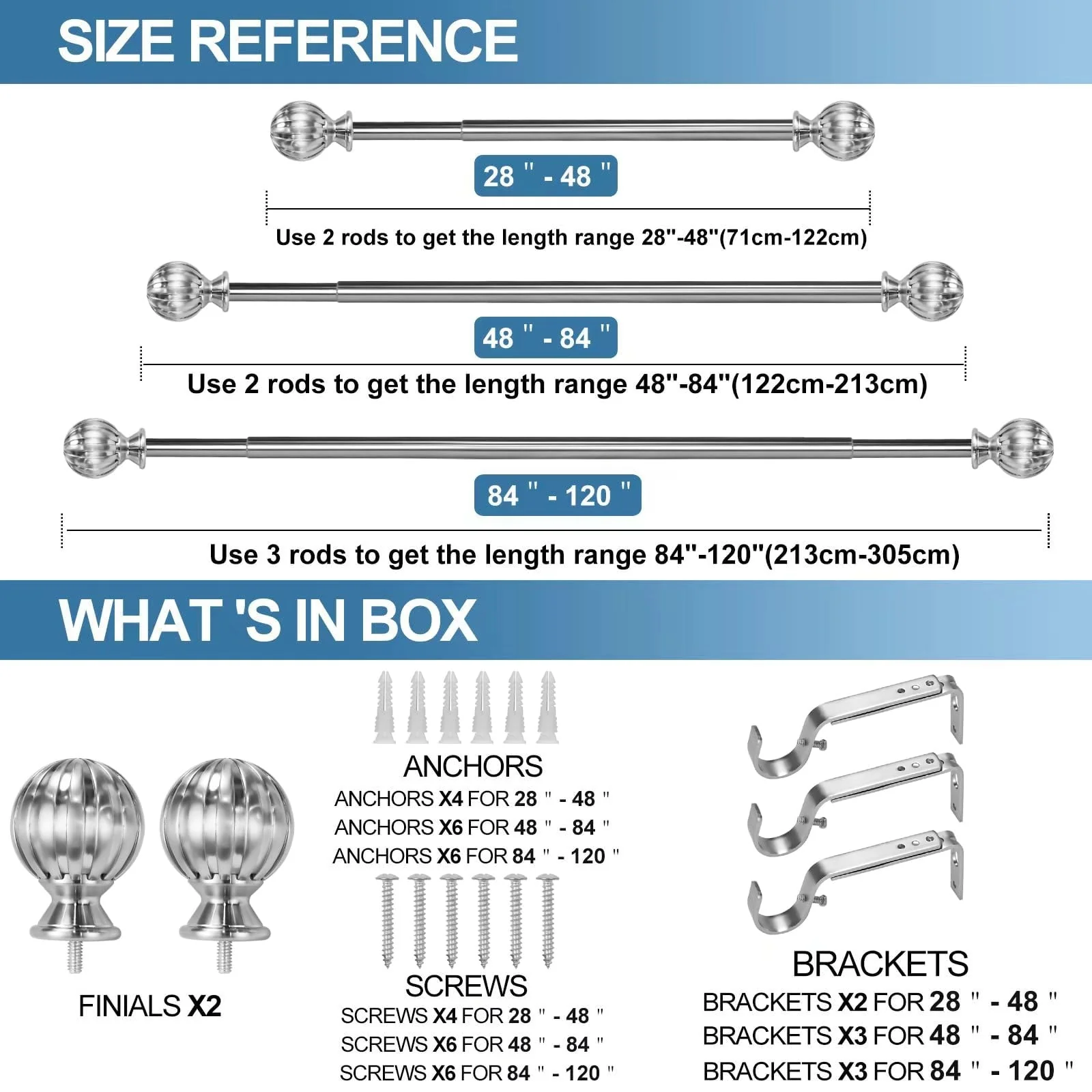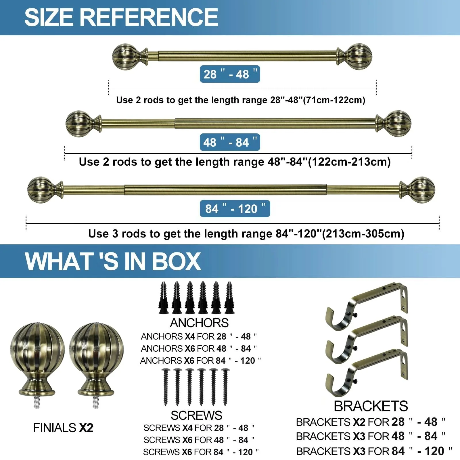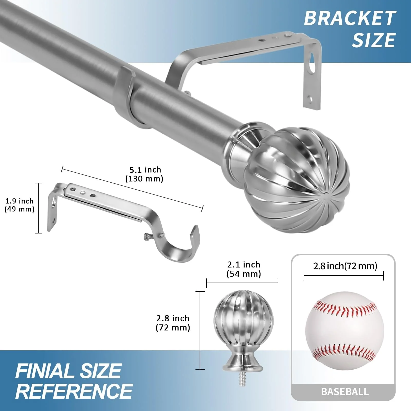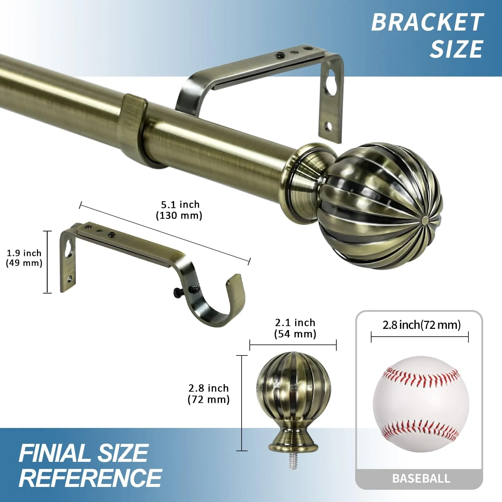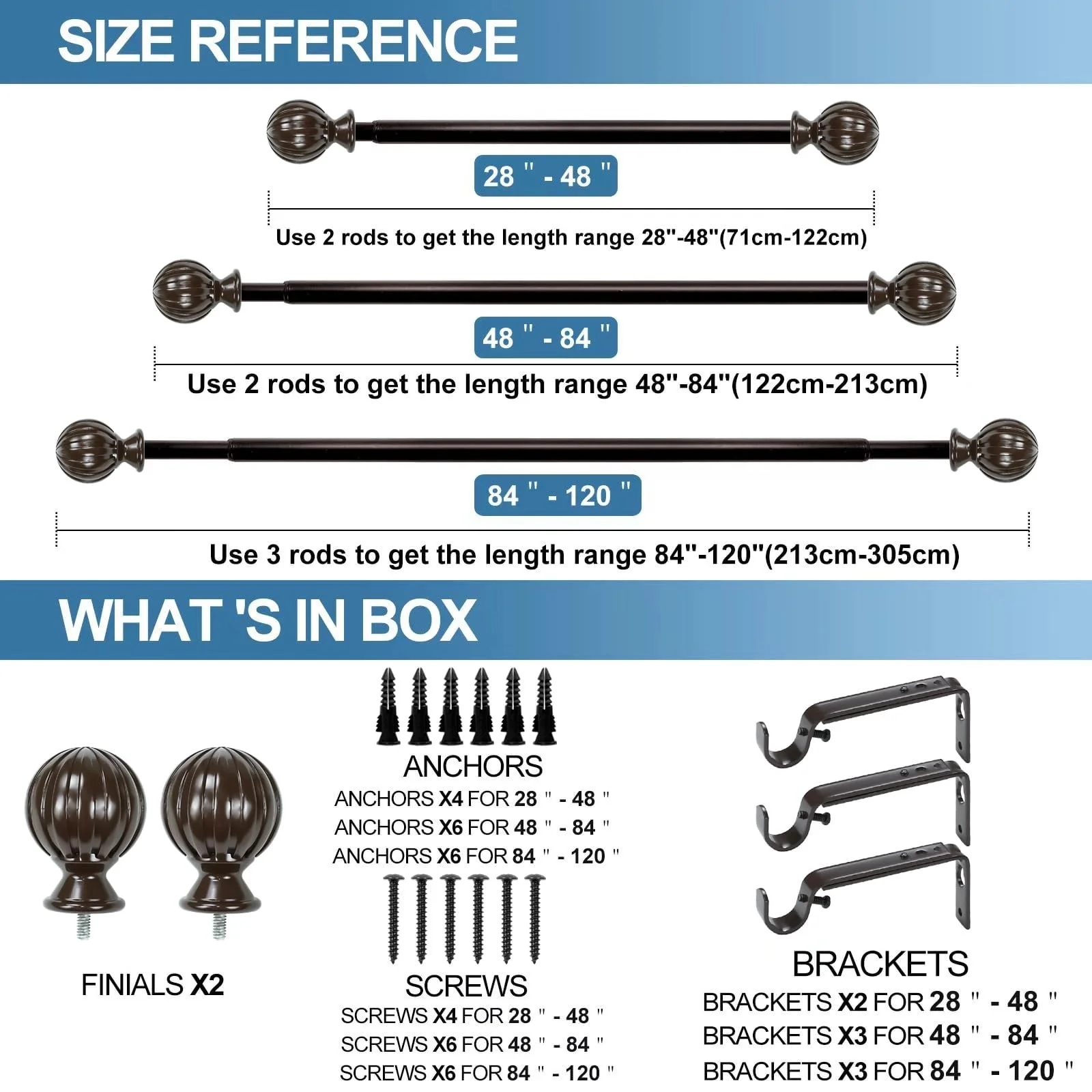 - The adjustable curtain rod measures 1' diameter and comes with round decorative finials.