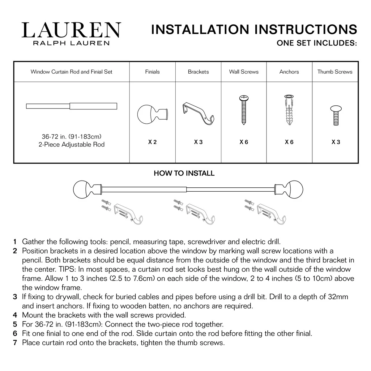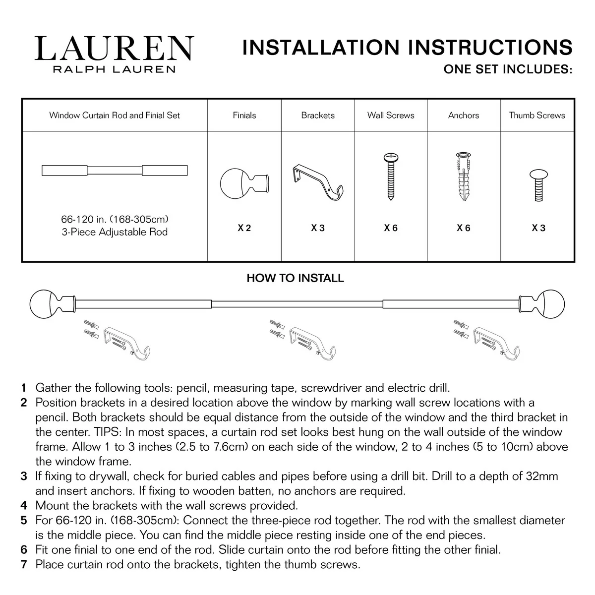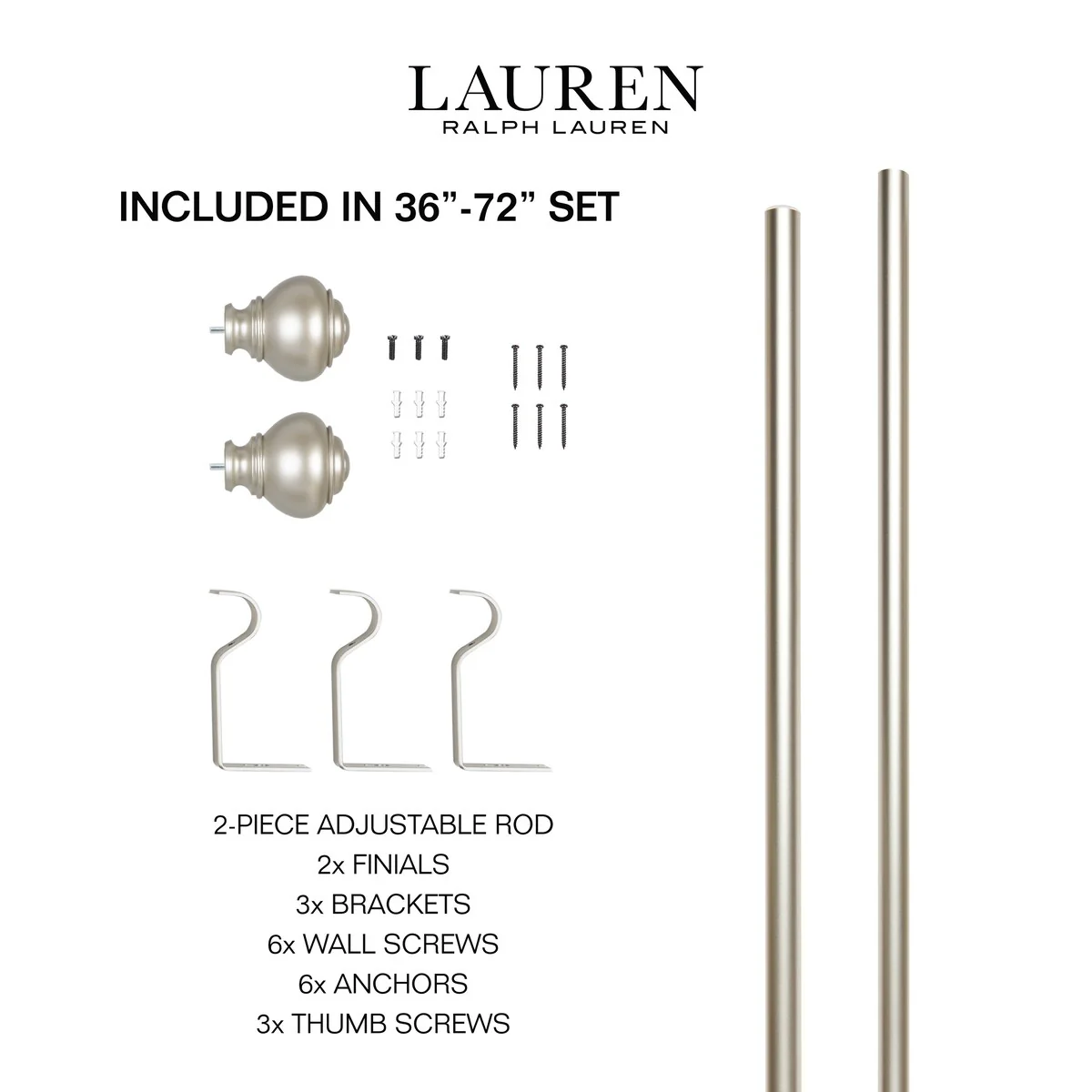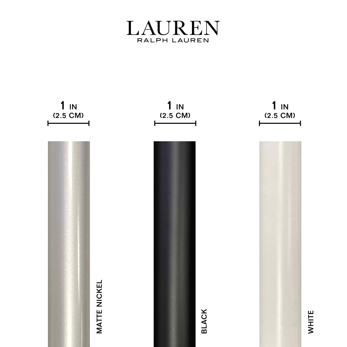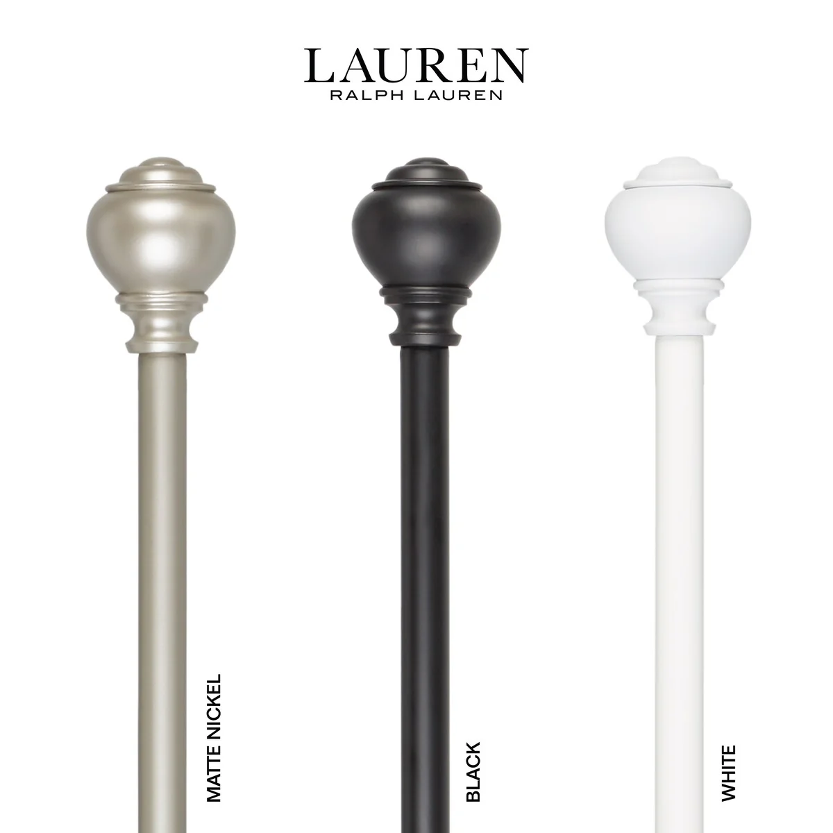 The Lauren Ralph Lauren Markel Window Curtain Rod and Finial Set offers a classic addition to your window decor. The 1' diameter adjustable iron rod in a matte nickel finish accommodates most window sizes. This durable rod will support most curtain panels, from airy sheers to heavier blackout curtain panels with various tops. The 3' diameter round resin decorative finials will keep your window curtain panels secure on the rod while providing an upscale finishing accent.