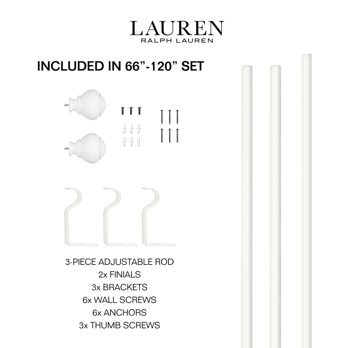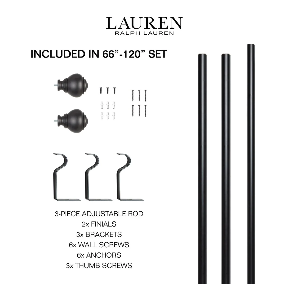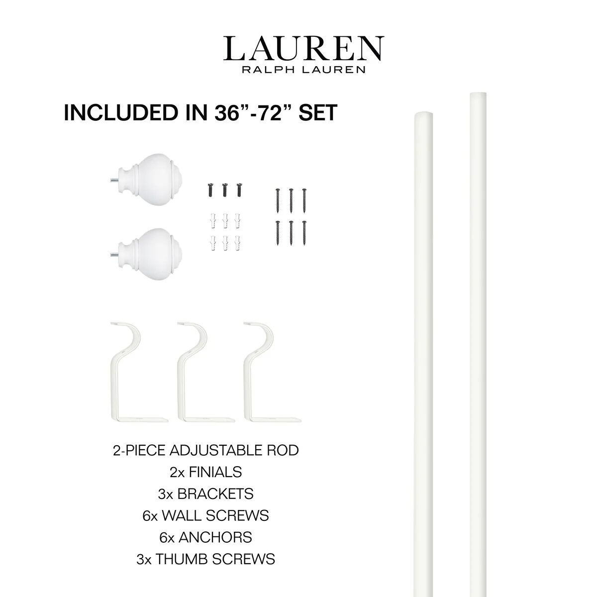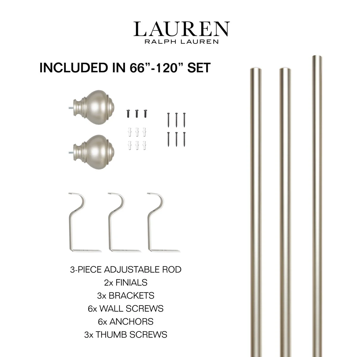 The Lauren Ralph Lauren Markel Window Curtain Rod and Finial Set offers a classic addition to your window decor. The 1' diameter adjustable iron rod in a matte nickel finish accommodates most window sizes. This durable rod will support most curtain panels, from airy sheers to heavier blackout curtain panels with various tops. The 3' diameter round resin decorative finials will keep your window curtain panels secure on the rod while providing an upscale finishing accent.