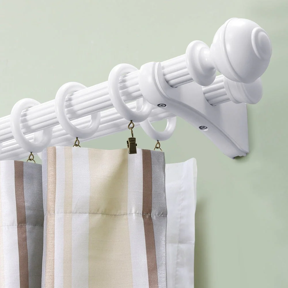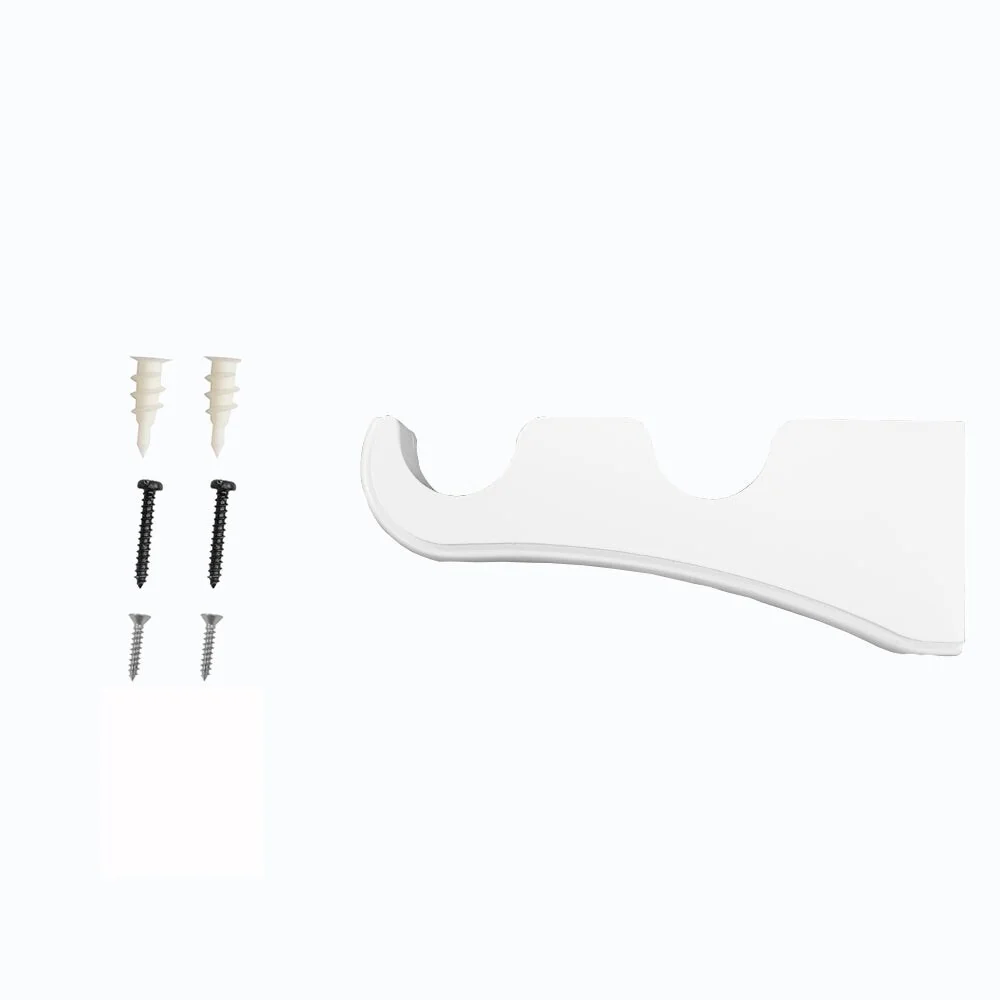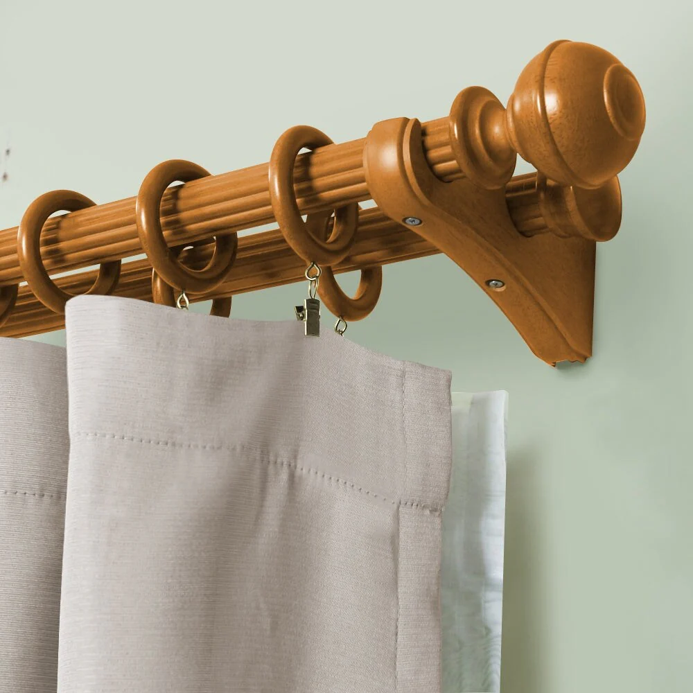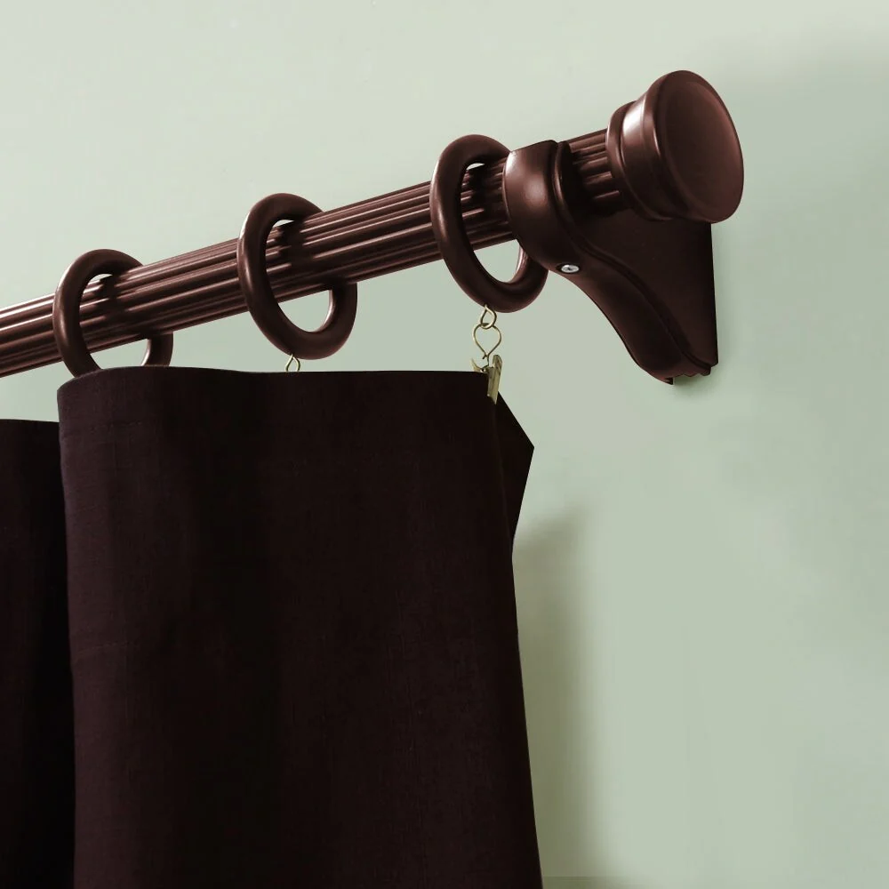 Lumi Home Furnishings Single Curtain Rod Bracket for 1-3/8' dia. wood rod decorate your window with the inherent beauty of natural wood. The natural beauty of wood brackets add style to any décor. The brackets screw into a wall to securely attach a wood pole to the surface for hanging window treatments. Available colors in: White, Heritage Oak, Ant. Mahogany. Single Curtain Rod Bracket projection 4.37 in.; Double Curtain Rod Bracket projection 7.2 in. Number of brackets required for each rod length. 4FT = 2 Brackets; 6FT & 8FT = 3 Brackets for supporting at joint