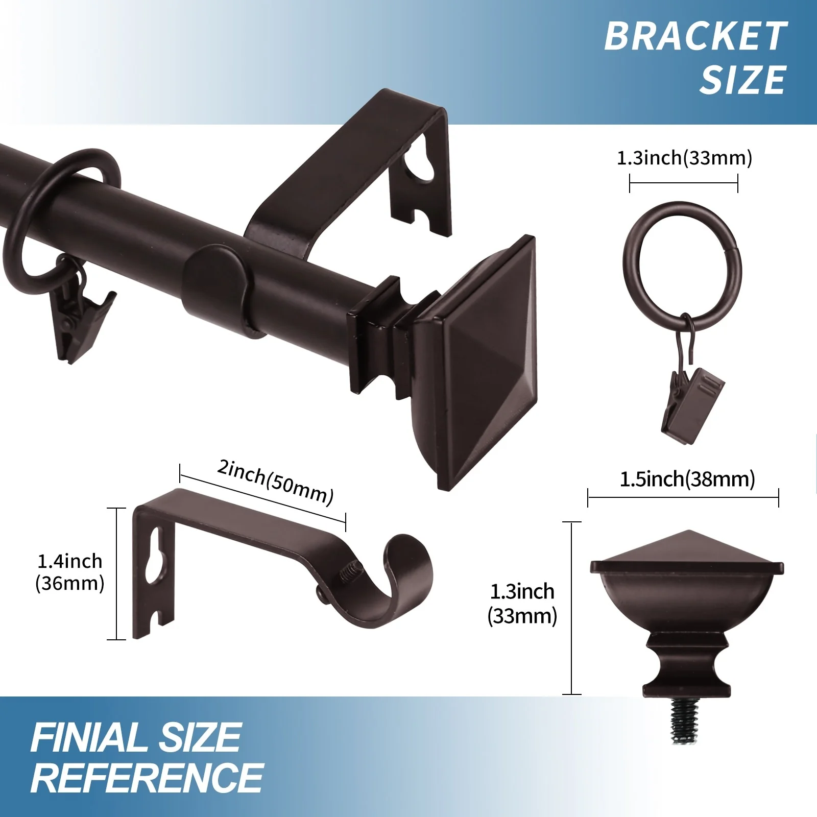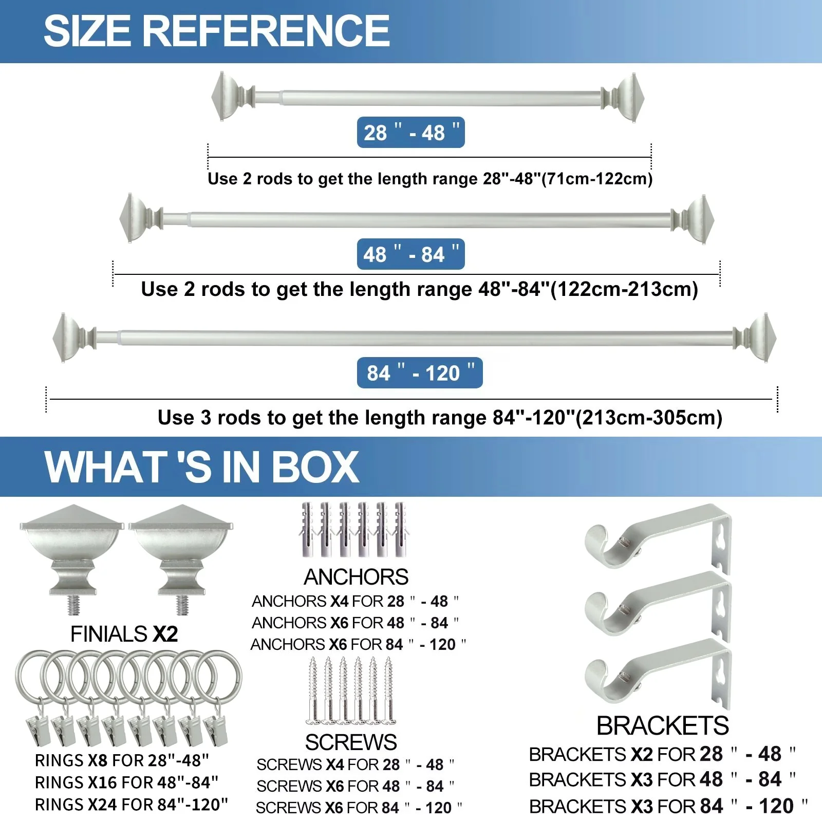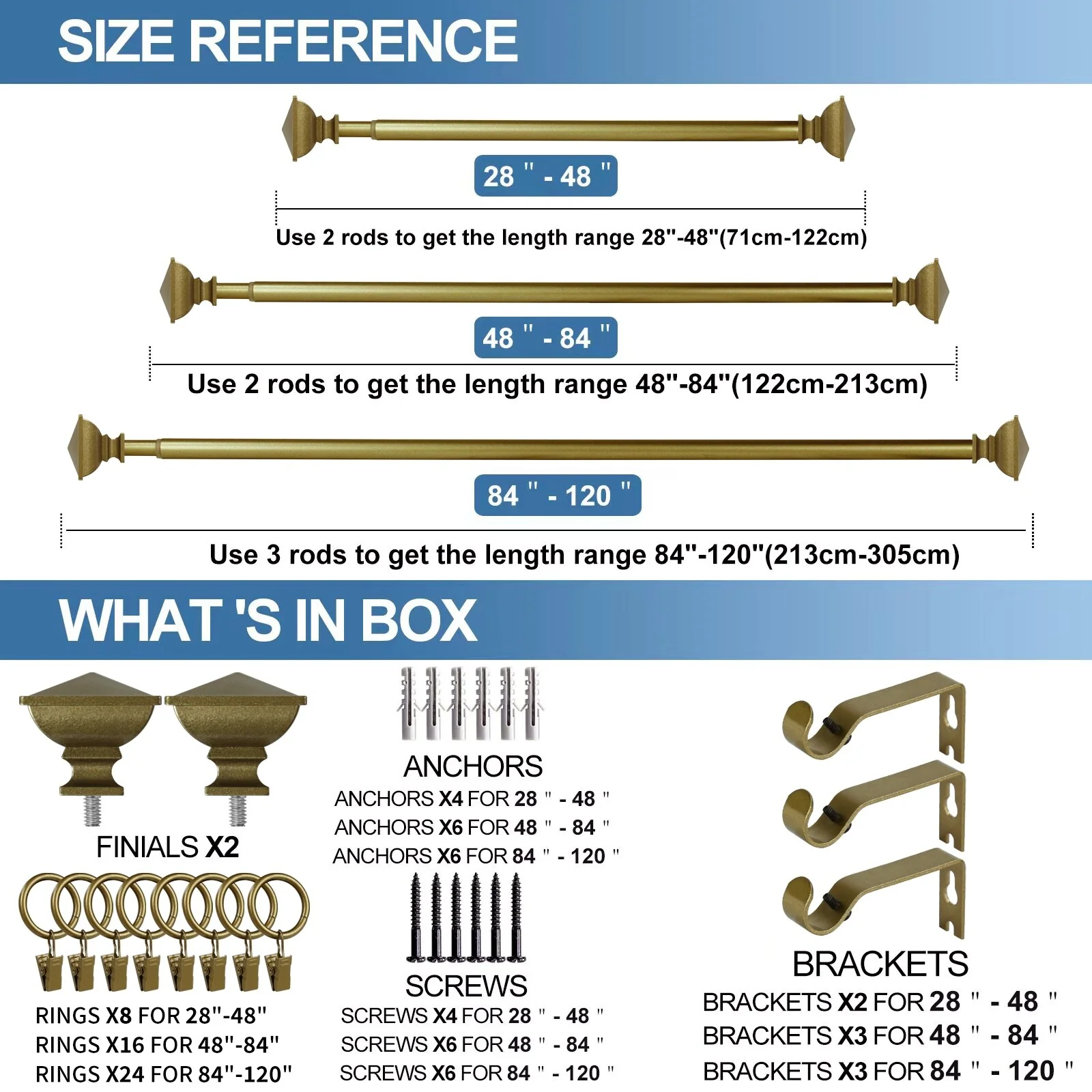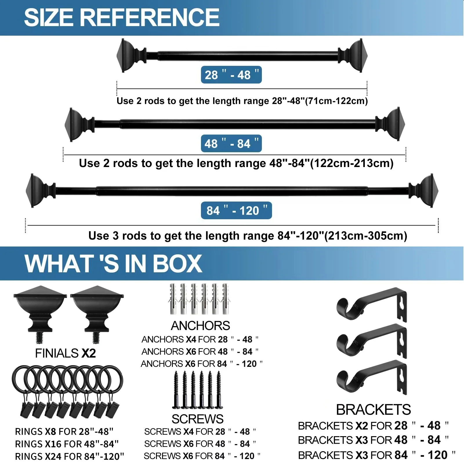 - EASY TO SET UP: Your adjustable curtain rod comes complete with everything you need to get set up quickly including 2 cast metal finials, 2 brackets for 28'-48' Rod, 3 wall-mounted curtain rod brackets for 48' to 84' and 84' to 120' Rod, screws, drywall anchors and easy to follow installation instructions