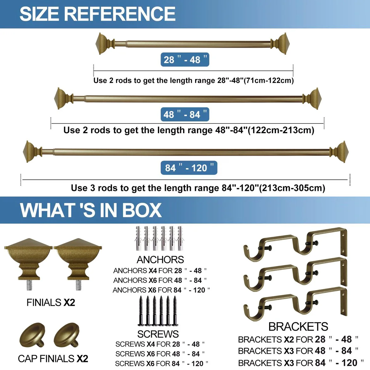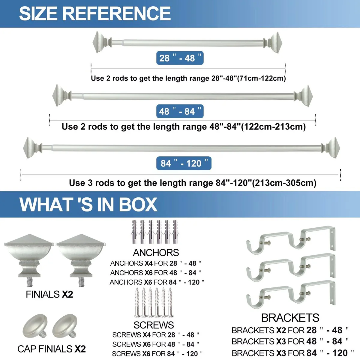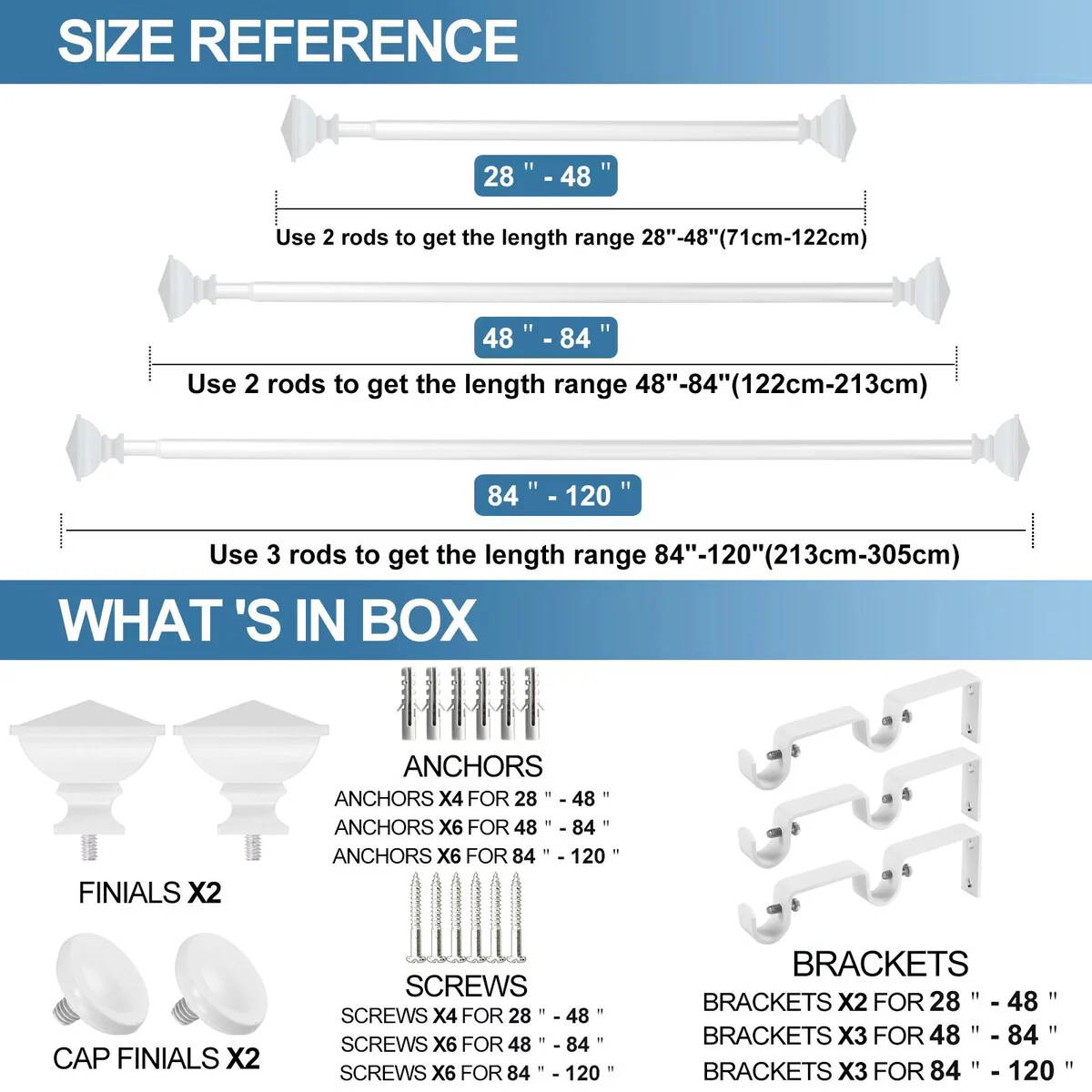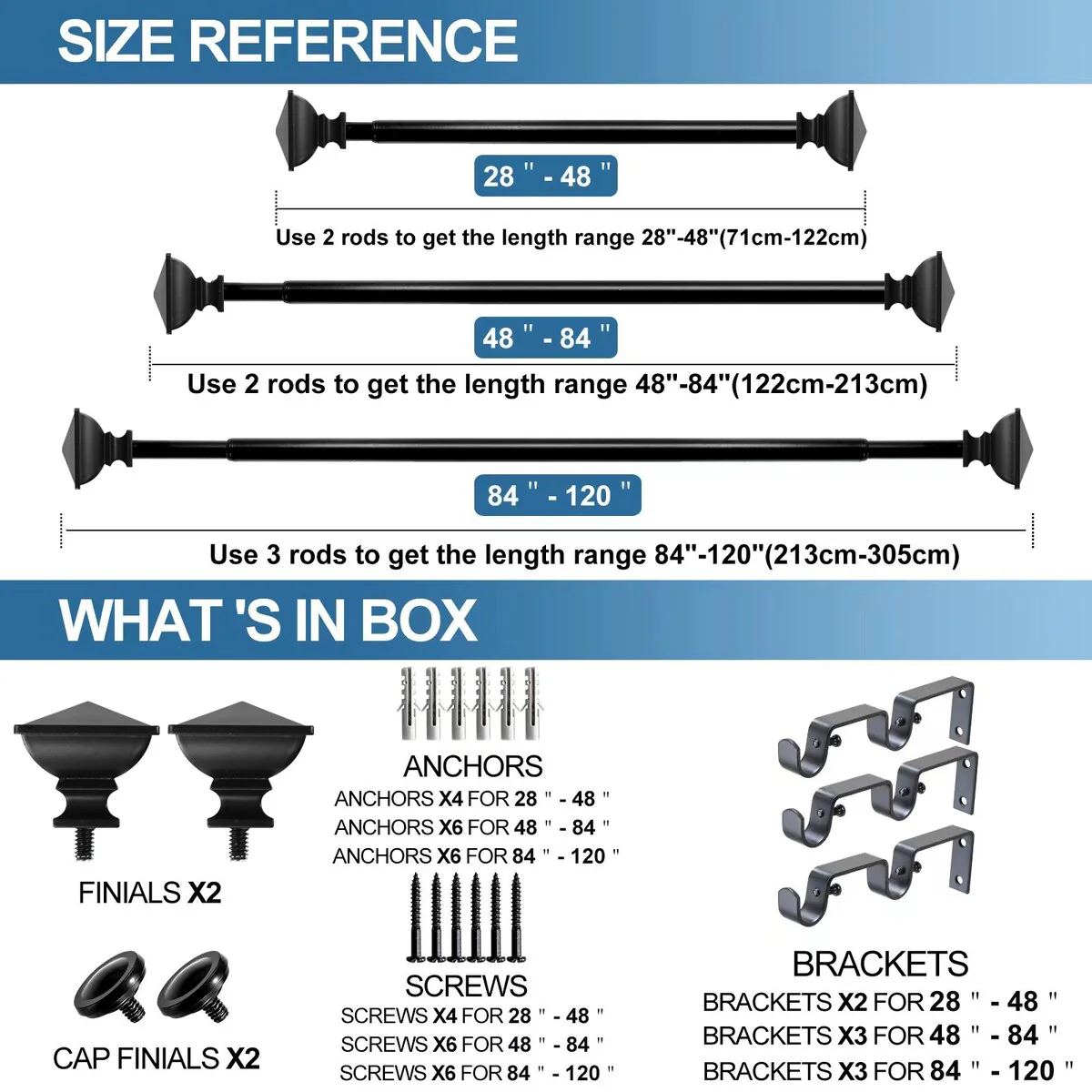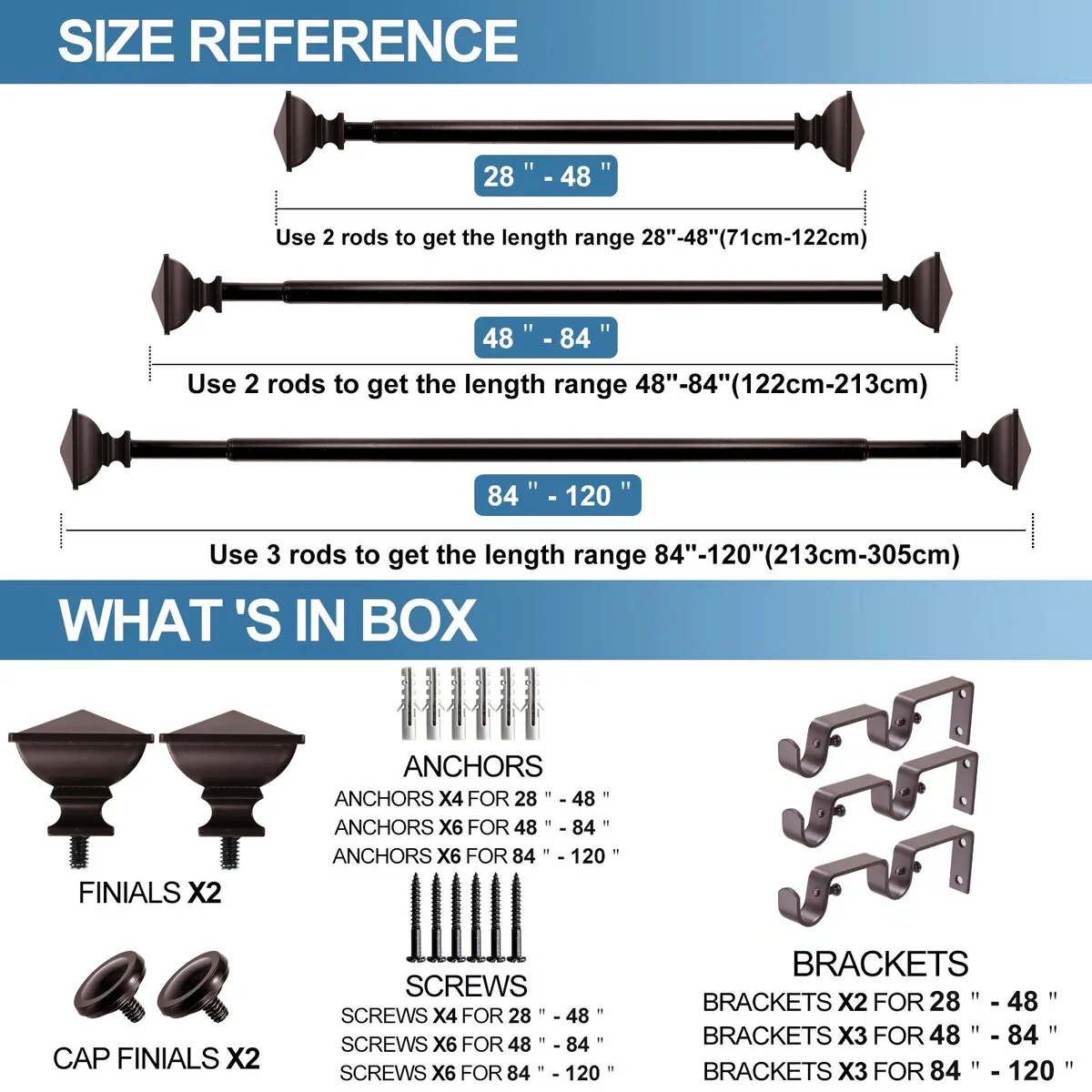 - EASY TO SET UP: Your adjustable curtain rod comes complete with everything you need to get set up quickly including 2 cast metal finials, 2 brackets for 28'-48' Rod, 3 wall-mounted curtain rod brackets for 48' to 84' and 84' to 120' Rod, screws, drywall anchors and easy to follow installation instructions