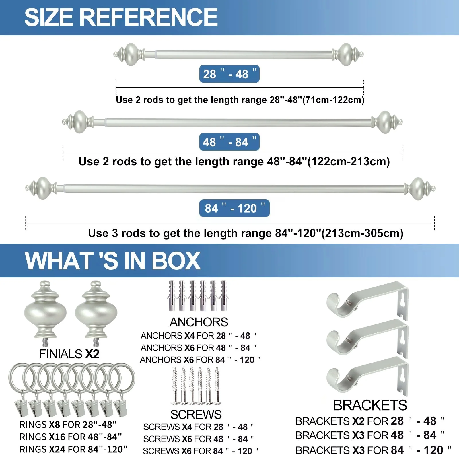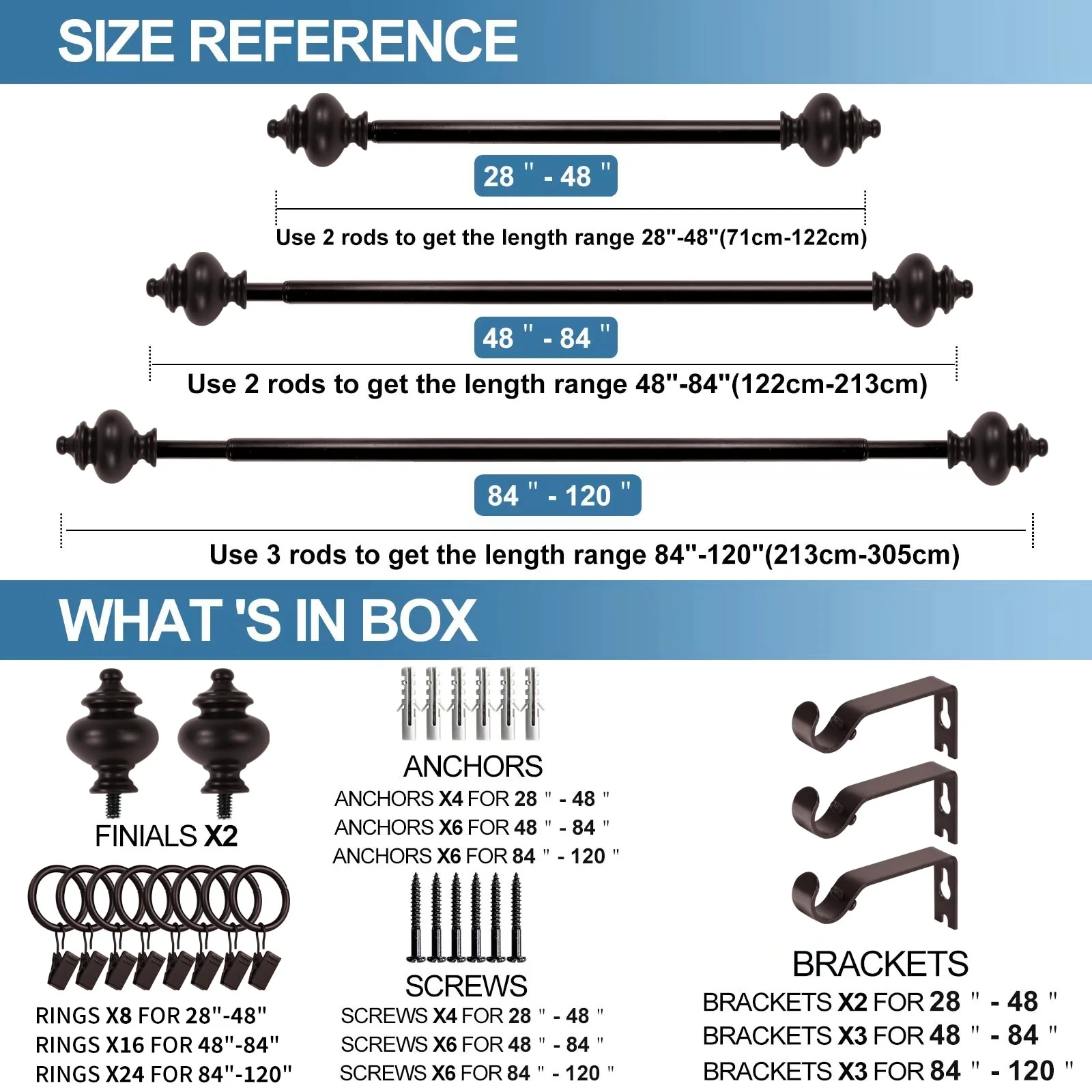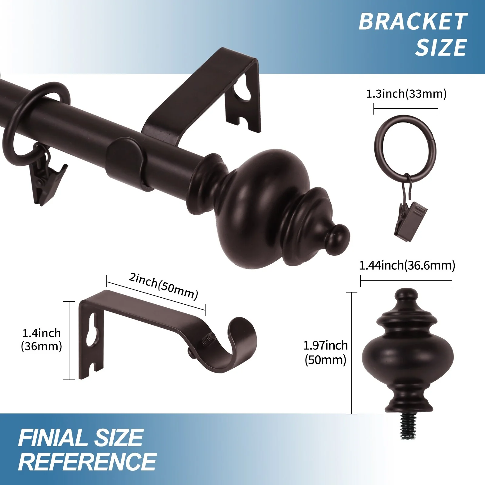 Elevate the look of your windows with this Modern Window Drapery Curtain Rod Set. Crafted with quality materials, this adjustable curtain rod set comes with two finials and multiple rings to fit your window size. The mounting brackets and clips are included for easy installation. Choose from three different length options to fit your needs.