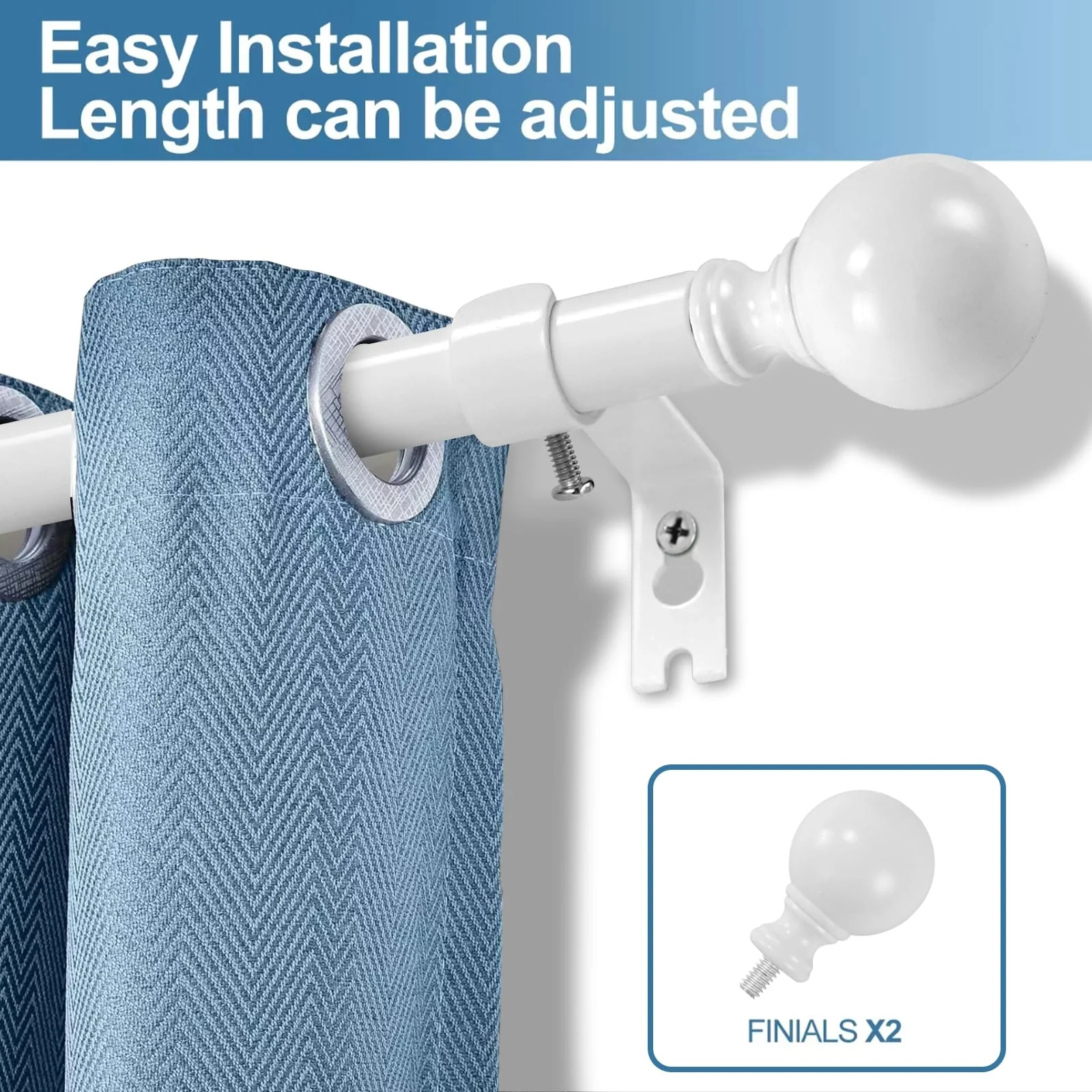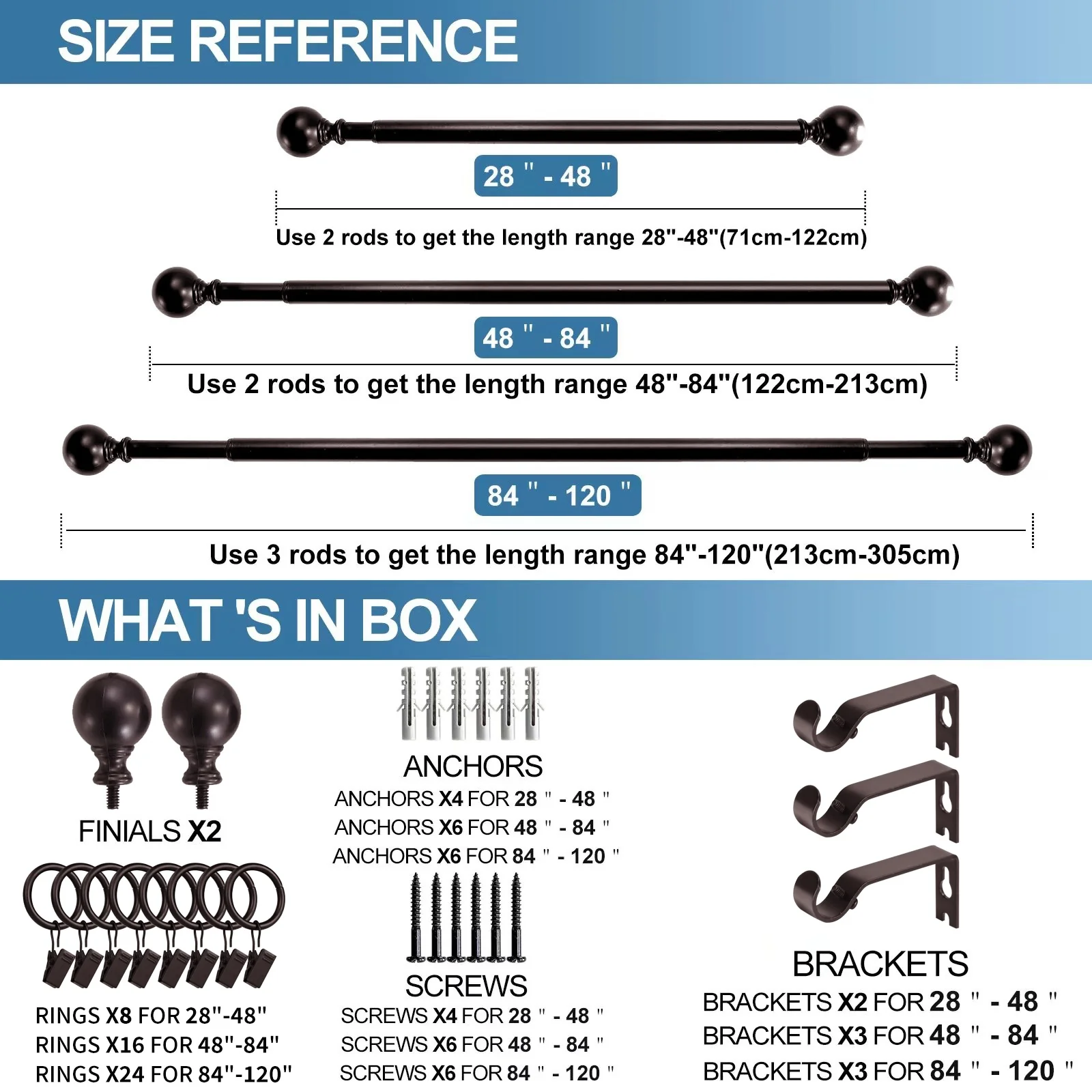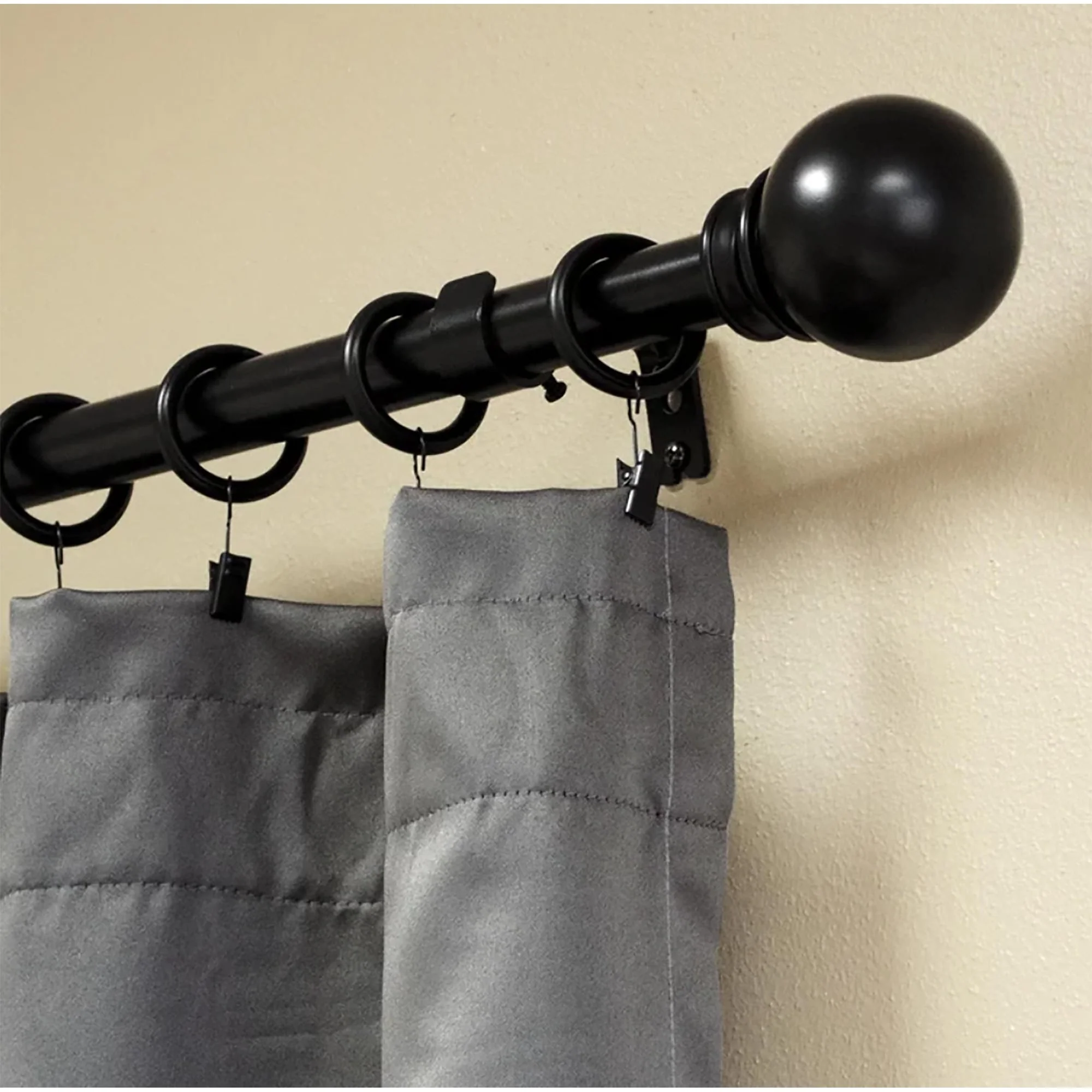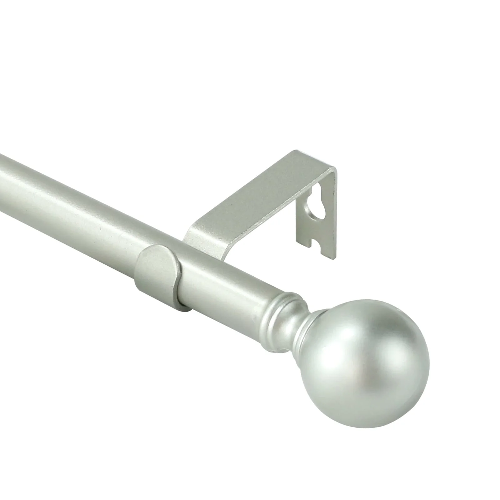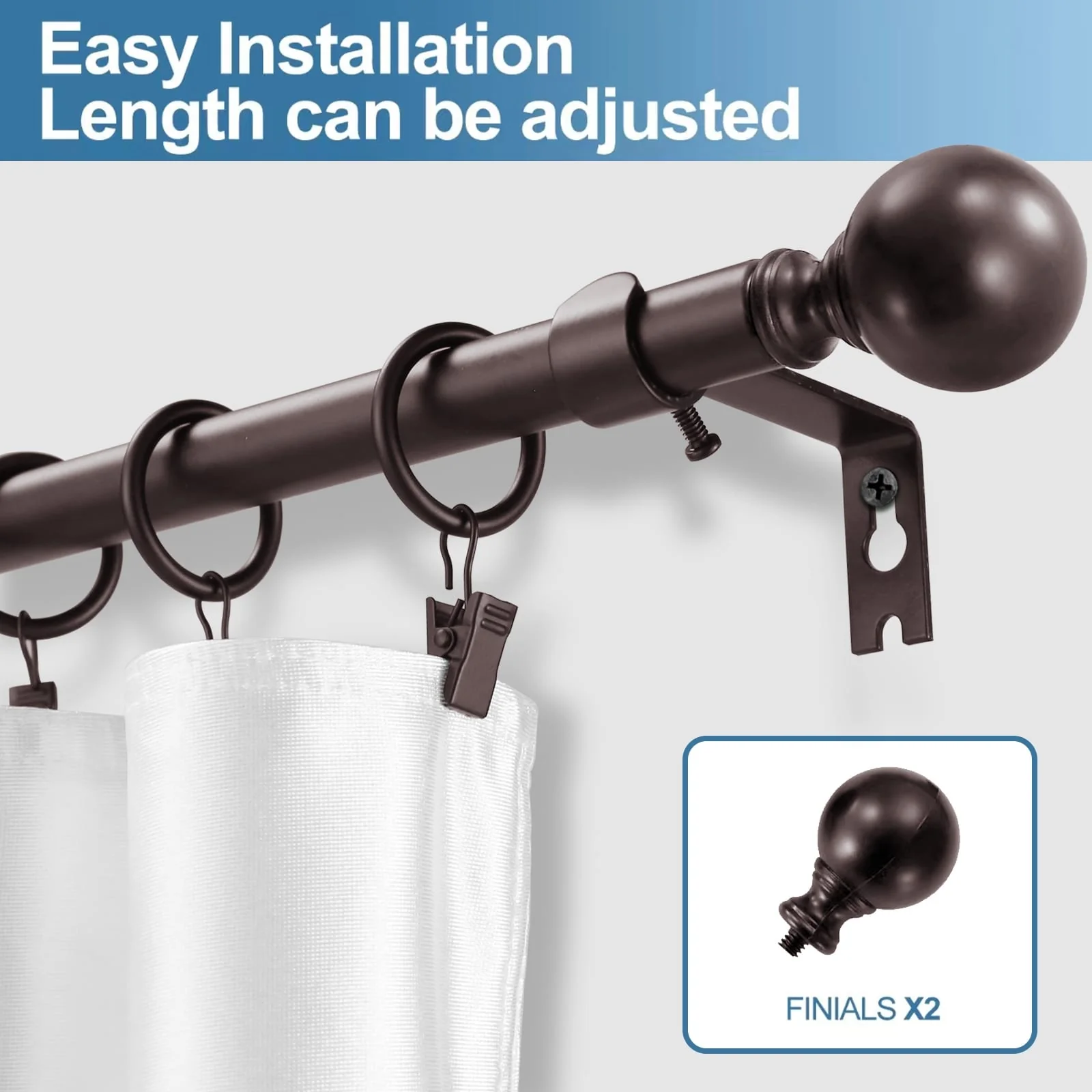 Put the focus on finish with this adjustable curtain rod set with Ball finials. The understated styling with rich finish color will complement a variety of home decor. Metal construction one inch diameter drapery rods and matching metal mounting brackets provide durability and support for your drapery panels. Adjustable telescoping rod design allows for a custom fit, available in sizes 28'-48', 48-84', 84'-120'