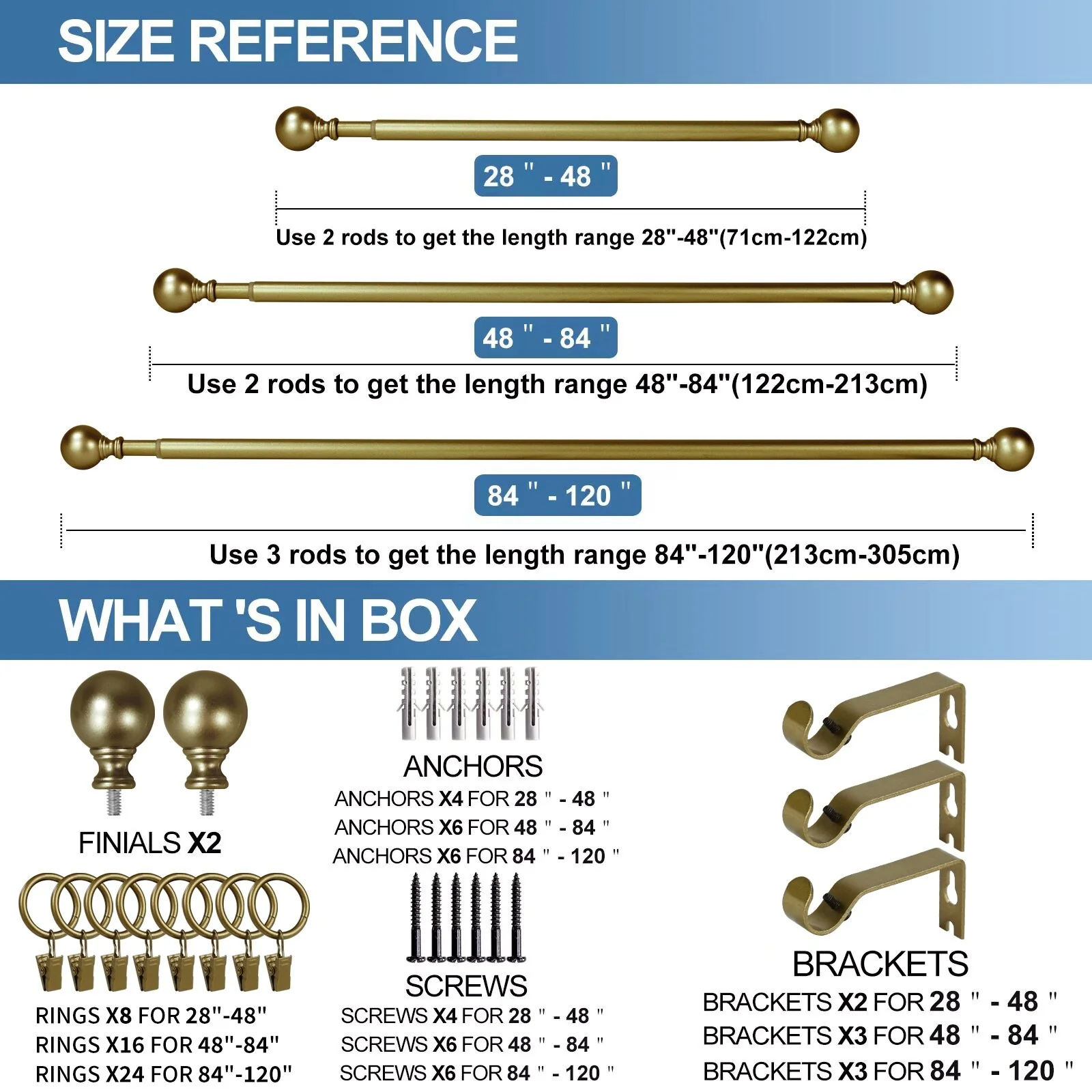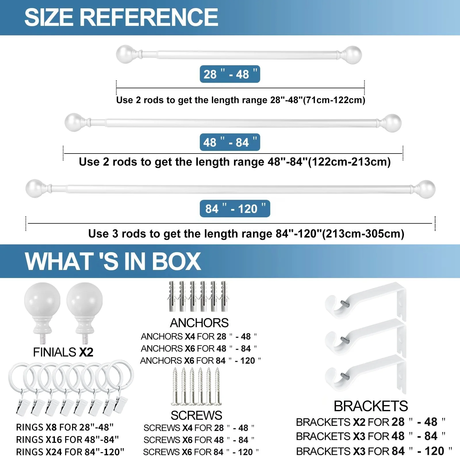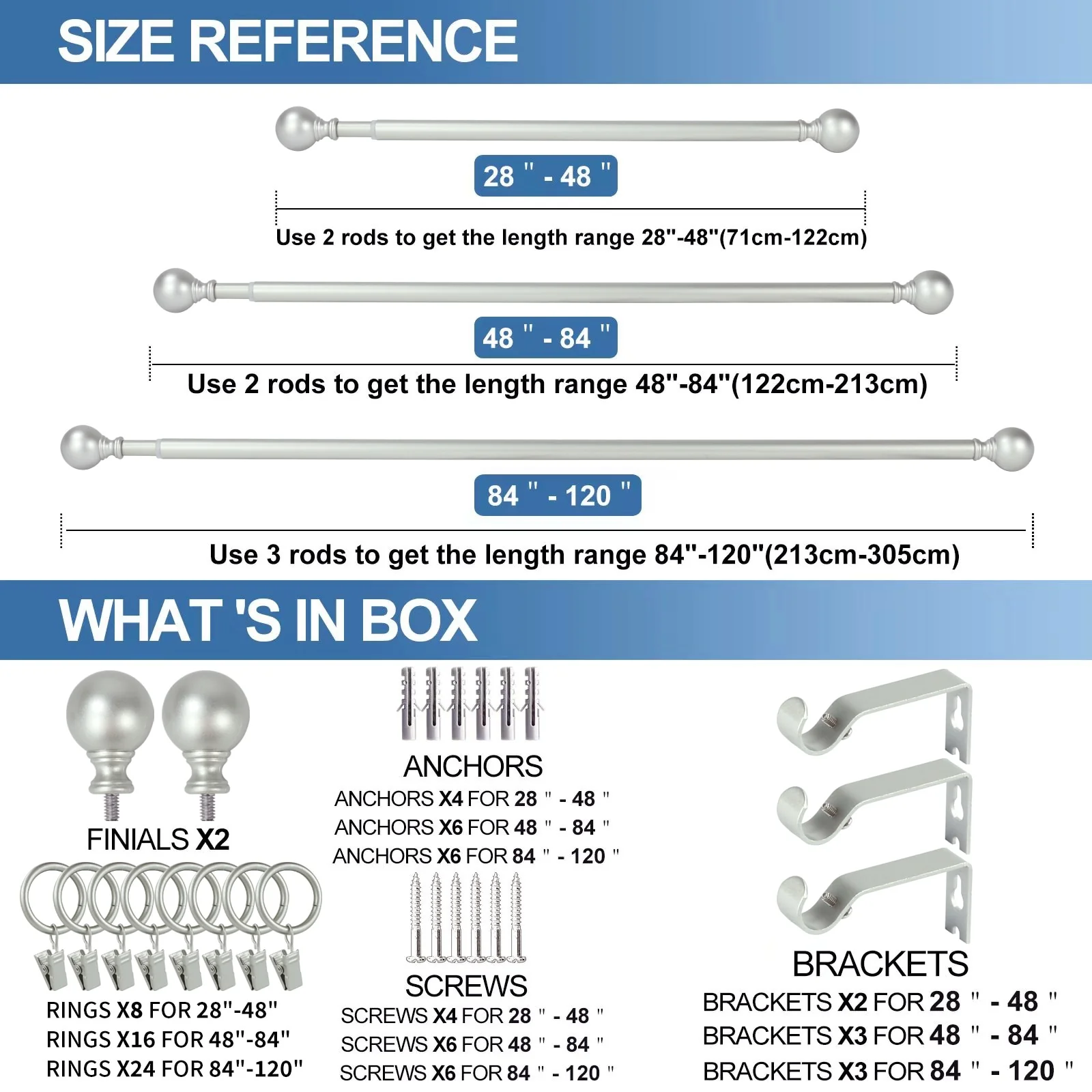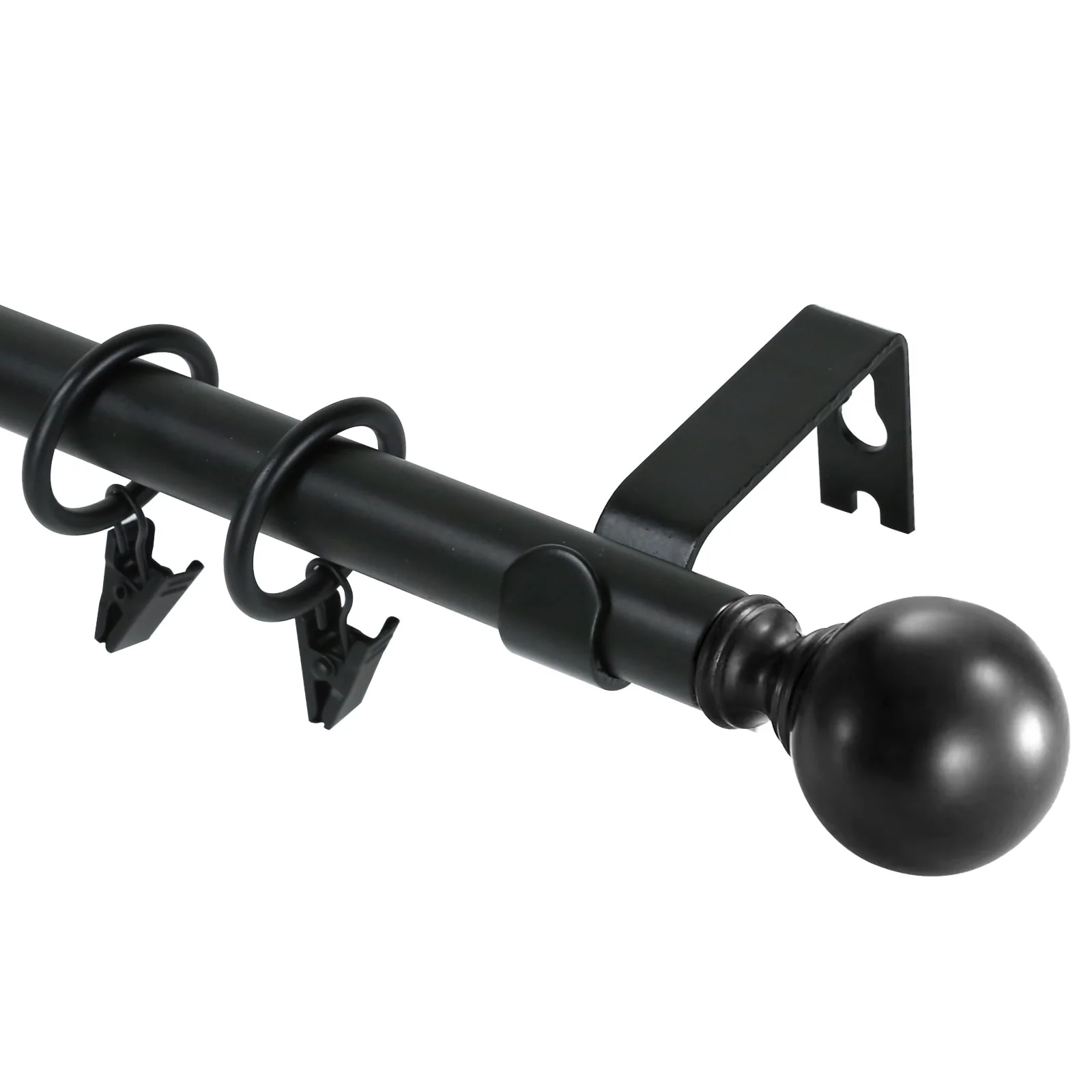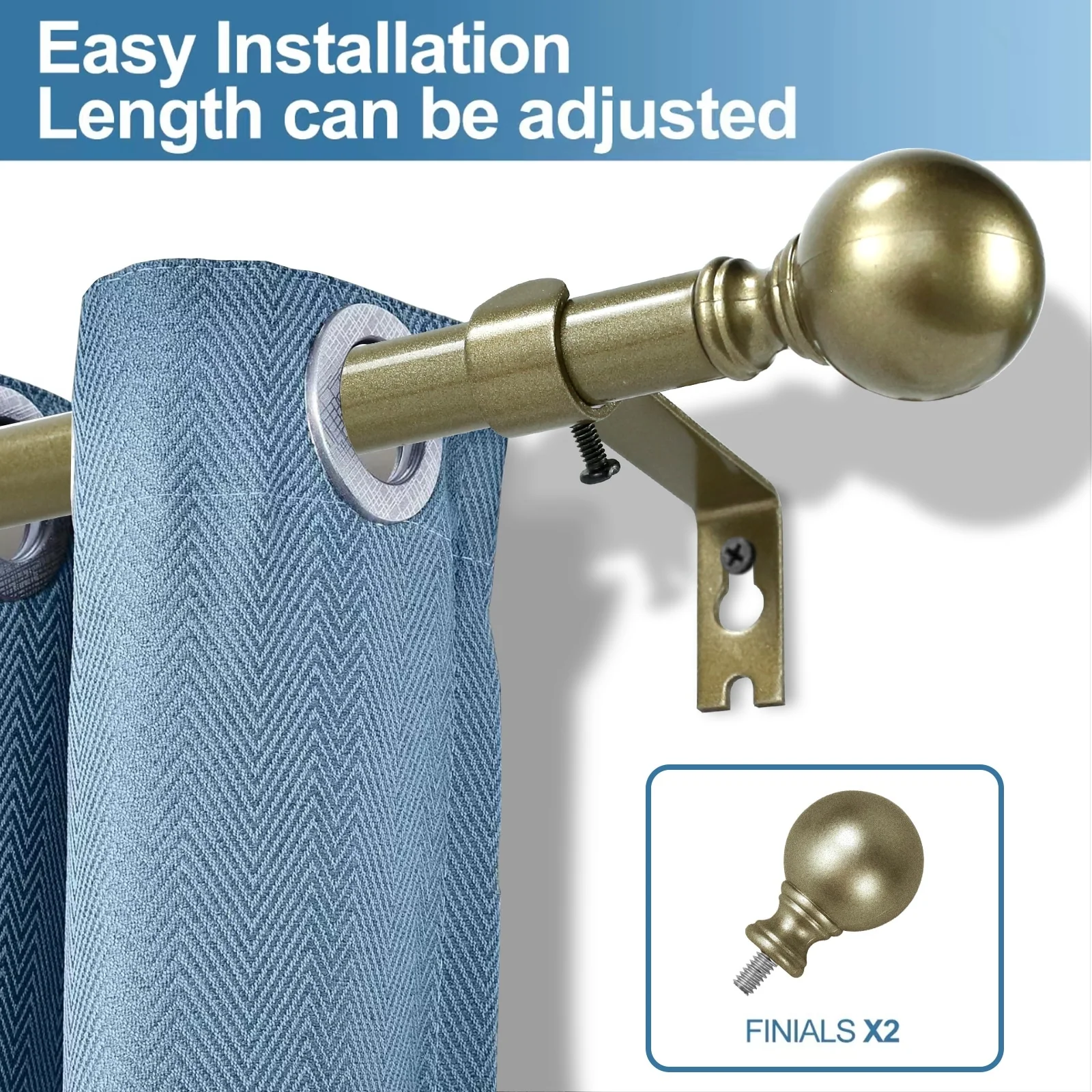 Put the focus on finish with this adjustable curtain rod set with Ball finials. The understated styling with rich finish color will complement a variety of home decor. Metal construction one inch diameter drapery rods and matching metal mounting brackets provide durability and support for your drapery panels. Adjustable telescoping rod design allows for a custom fit, available in sizes 28'-48', 48-84', 84'-120'