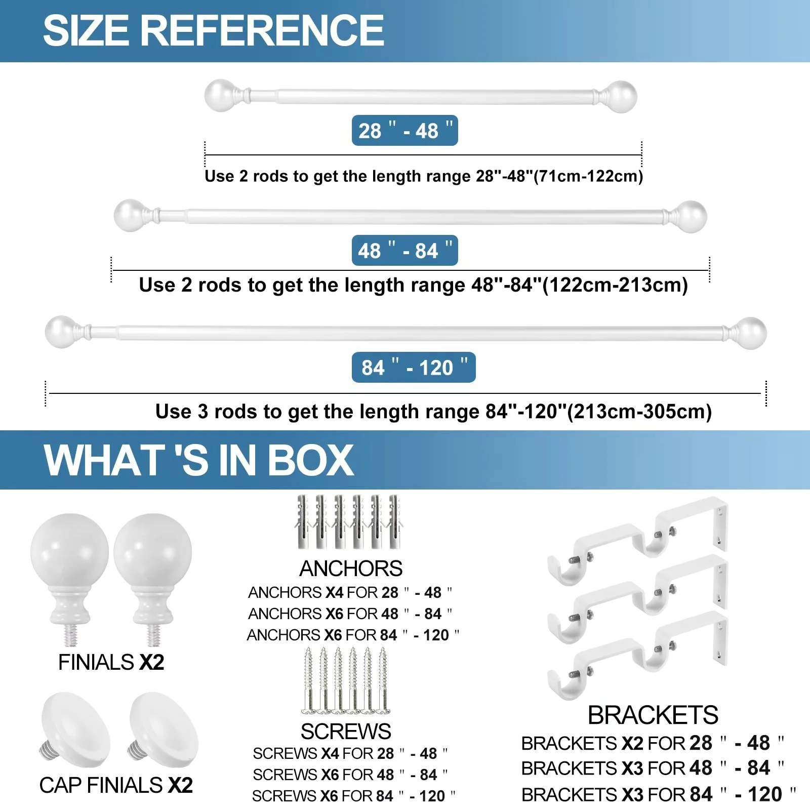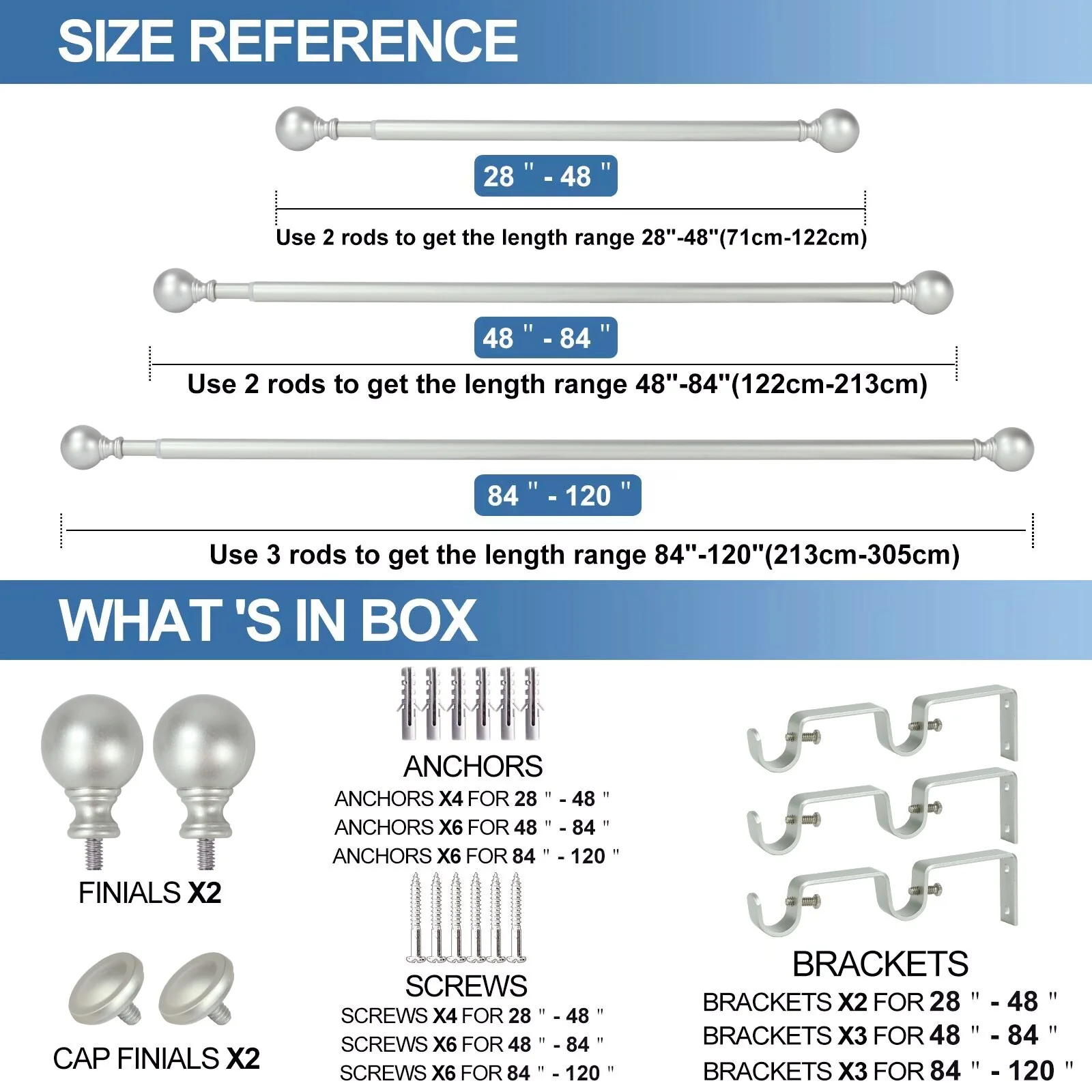 • EASY TO SET UP: Your adjustable curtain rod comes complete with everything you need to get set up quickly including 2 cast metal finials, 2 brackets for 28'-48' Rod, 3 wall-mounted curtain rod brackets for 48' to 84' and 84' to 120' Rod, screws, drywall anchors and easy to follow installation instructions