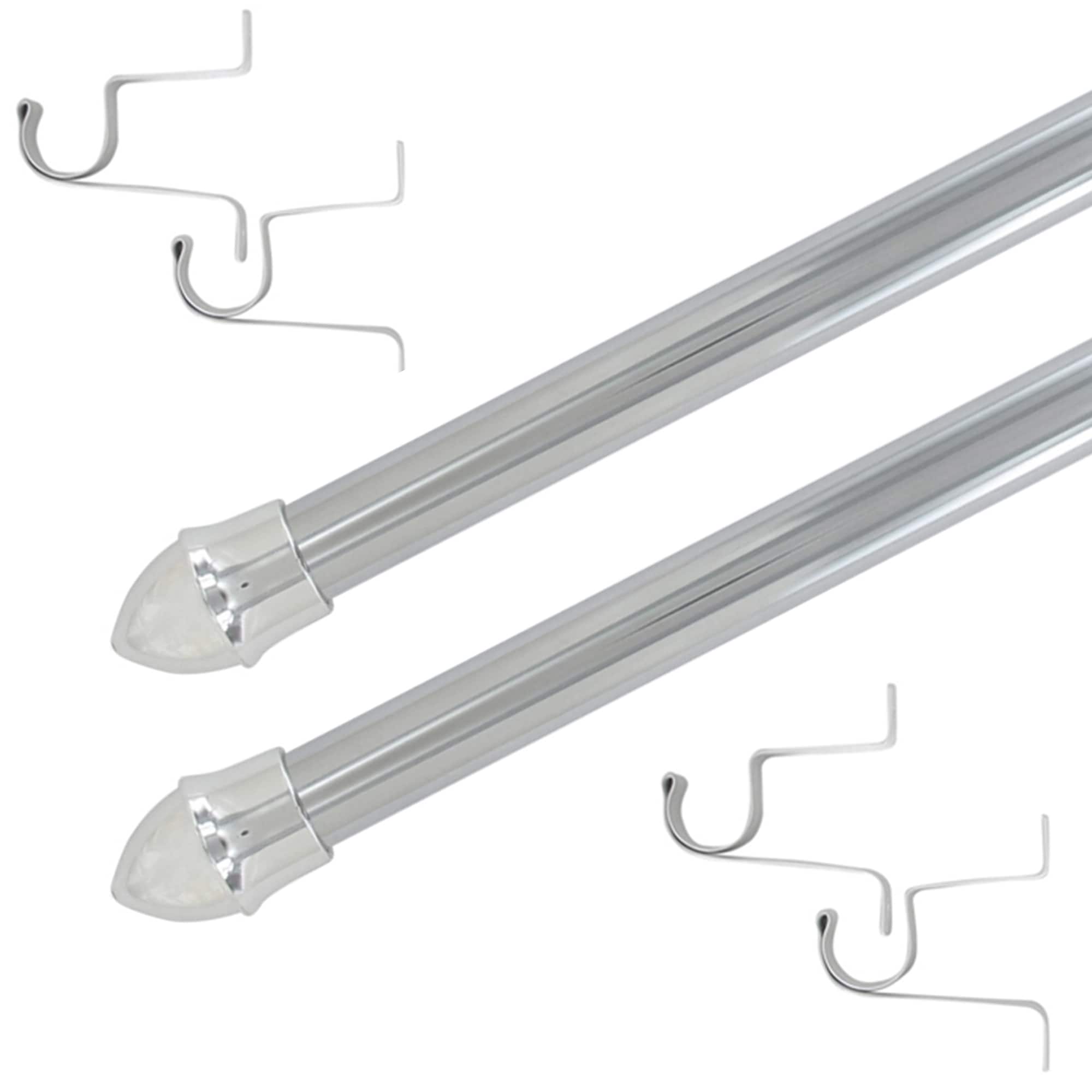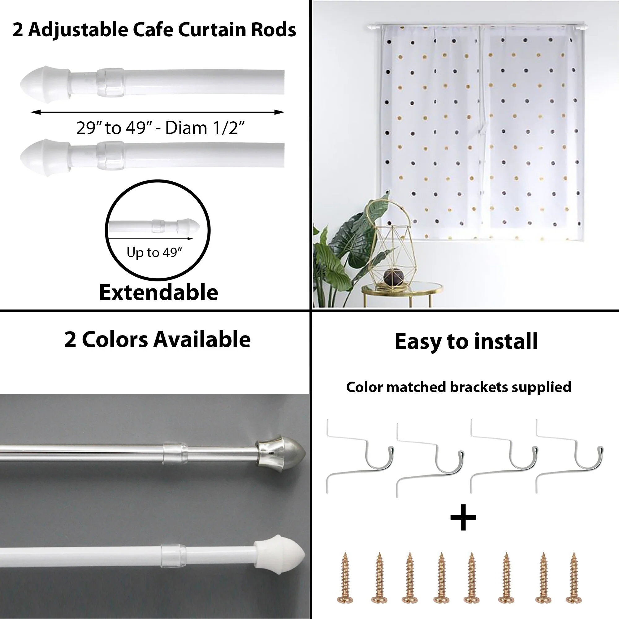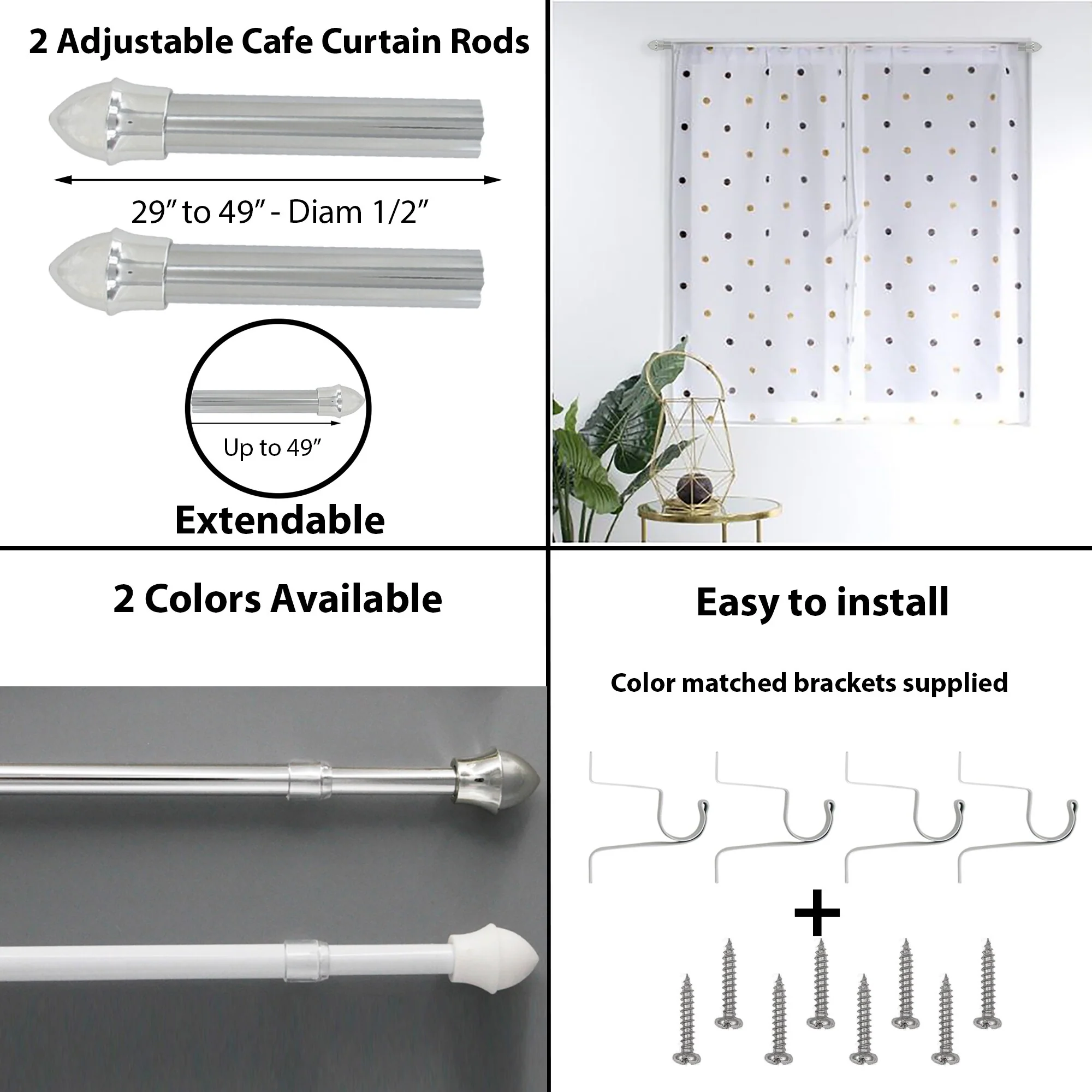 Bring an extra flourish to your window curtains with this set of 2 café curtain rods 19' to 29' Adjustable - Diam 1/2'.Just perfect for holding your pretty curtains and window treatments in your kitchen, bathroom, laundry room,...Thanks to its two supplied wall mounted brackets, this kitchen rod can be fixed easily to window frames, doors or used as a room divider.Not only, this speedy extendable rod is ideal for lightweight curtains, voiles and nets. But also, easy to install, it can be wall mounted or fixed to any recess. These 2 café curtain rods feature a versatile finish to match a variety of home decor styles. Moreover, two sizes are available : 19-29 inches (50-75 cm) and 29-49 inches (75-125 cm). Color white, also available in gold or chrome. This aluminum extendable curtain rod can be installed to wooden or PVC window frames.Also, we recommend for PVC installation to purchase our special PVC brackets (sold separately), in order not to damage your PVC frame.In conclusion, this white telescoping café rod makes hanging curtain and sheer drapery a breeze.