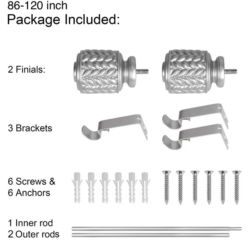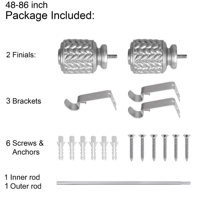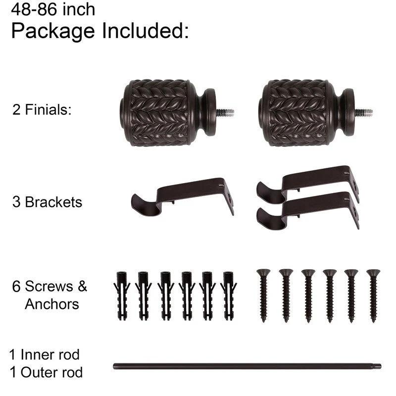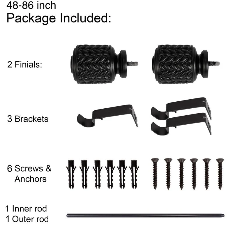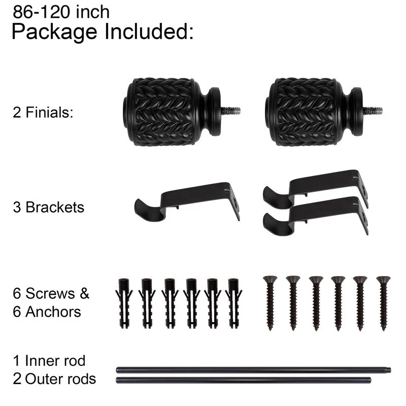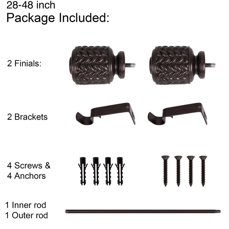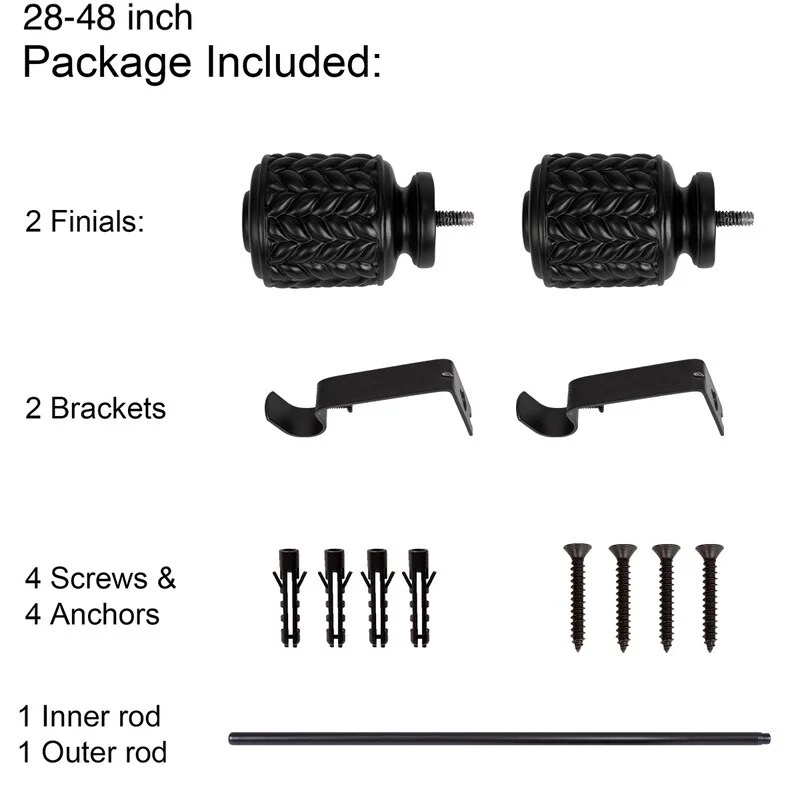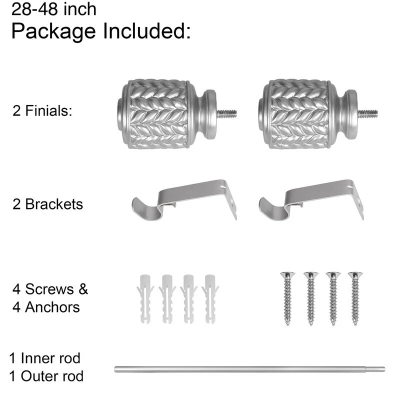 UTOPIA ALLEY 3/4 Inch Curtain Rods are great for any room in the house. Add a touch of elegance to your home with our decorative curtain rods. The diameter of the all-metal rod is 3/4 inches and easily adjusts telescopically to fit windows. The rod length adjusts from 28'-48', 48'-86', 86'-120', so you can use them in any size window. This curtain rod is easy to install and comes with all the necessary hardware to mount it to your wall. This 28'-48' curtain rod kit includes everything you need to hang your curtains. It comes with 2 finials, 2 brackets, 1 inner rod, 1 outer rod, 4 screws, and 4 anchors. This 48'-86' curtain rod kit includes everything you need to hang your curtains. It comes with 2 finials, 3 brackets, 1 inner rod, 1 outer rod, 6 screws, and 6 anchors. This 86'-120' curtain rod kit includes everything you need to hang your curtains. It comes with 2 finials, 3 brackets, 1 inner rod, 2 outer rods, 6 screws, and 6 anchors. All you'll need from your end is a screwdriver and drill. These window rods for curtains provide a stylish backdrop for your drapes, which will help set the tone for your decorating scheme.COMPLEMENTS ANY CURTAIN: Add a touch of elegance to your home with our decorative curtain rods. These drapery rods are great for any room in the house, and they especially shine in the bedroom, living room, or dining area. These window rods for curtains provide a stylish backdrop for your drapes, which will help set the tone for your decorating scheme.ADJUSTABLE CURTAIN ROD: These adjustable curtain rods work great for any window! The diameter of the all-metal rod is 3/4 inches and easily adjusts telescopically to fit windows. The rod length adjusts from 28'-48', 48'-86', 86'-120', so you can use them in any window size. These drapery rods come beautifully finished in a tone for a sleek, modern look.EASY-TO-INSTALL: This curtain rod is easy to install and comes with all the necessary hardware to mount it to your wall. All you'll need from your end is a screwdriver and drill. Our window curtain rods are made from durable metal with a finish that makes it easy to match your decor.WHAT'S INCLUDED: This decorative curtain rod is perfect for those who are looking to add a little extra style to their windows. The 28'-48' curtain rod kit includes everything you need to hang your curtains. It comes with 2 finials, 2 brackets, 1 inner rod, 1 outer rod, 4 screws, and 4 anchors. This 48'-86' curtain rod kit includes everything you need to hang your curtains. It comes with 2 finials, 3 brackets, 1 inner rod, 1 outer rod, 6 screws, and 6 anchors. This 86'-120' curtain rod kit includes everything you need to hang your curtains. It comes with 2 finials, 3 brackets, 1 inner rod, 2 outer rods, 6 screws, and 6 anchors. Turn your curtains into a statement piece that adds pizzazz to any room in your home with these stylish drapery rods!ABOUT US: UTOPIA ALLEY is a woman-owned and operated business. Our goal is to provide our customers with furniture, home decor, essentials, and accessories made with durable products and exceptional craftsmanship. We believe in creating a stylish, comfortable space where you can relax, recharge, and feel inspired.