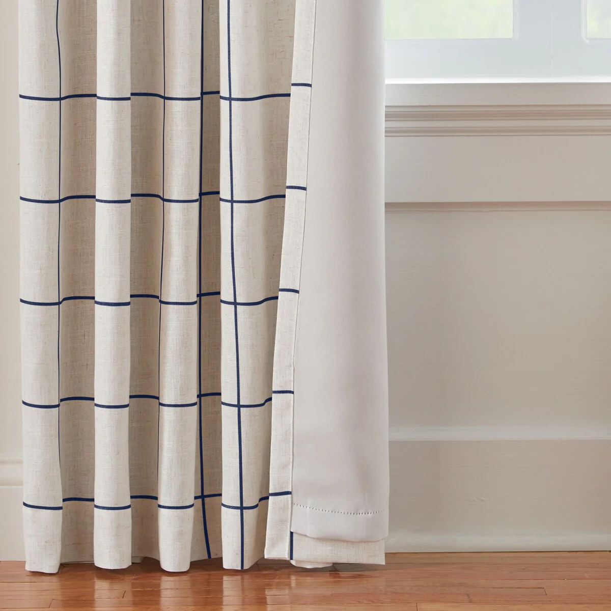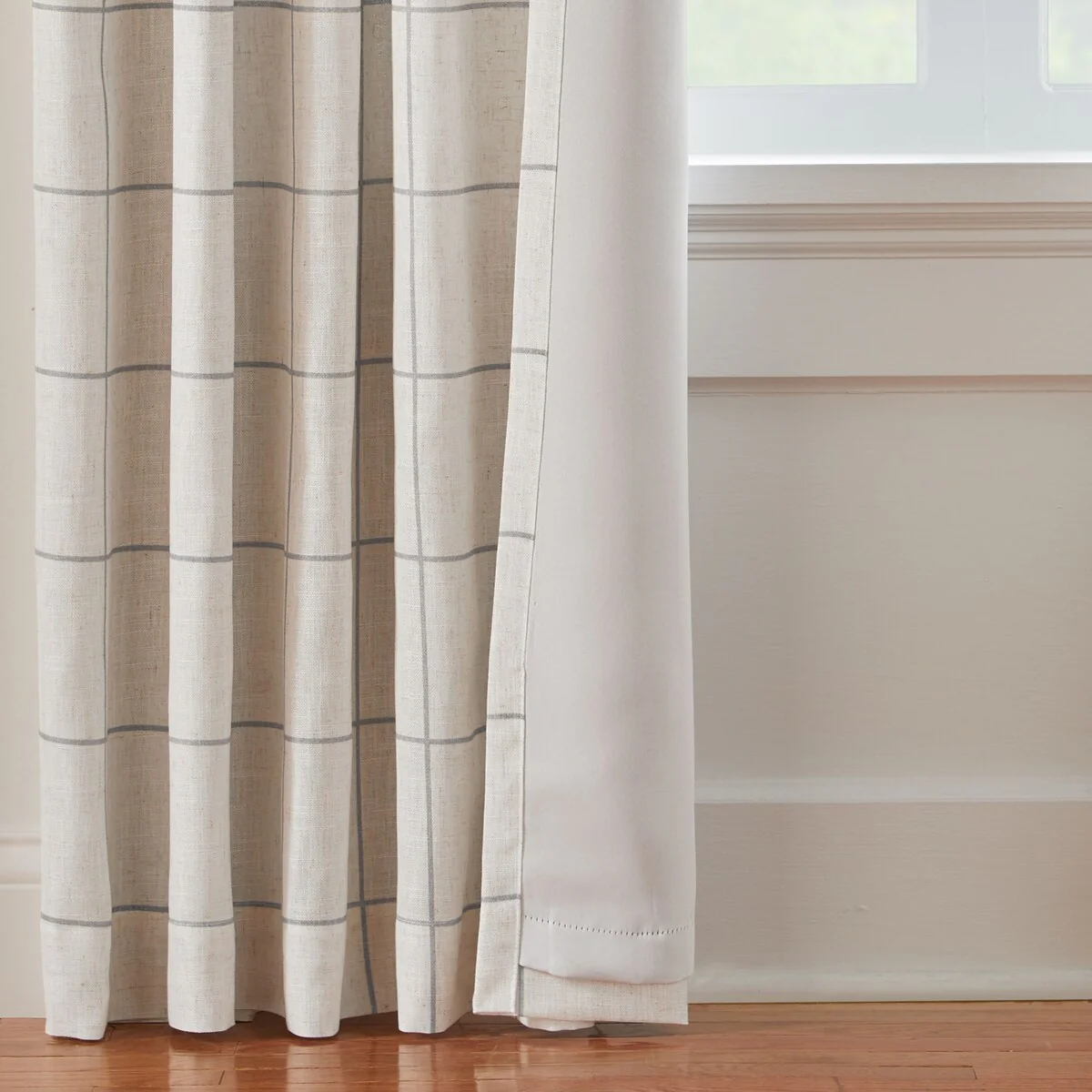 Update your home with the upscale and versatile Brighton Windowpane Plaid Blackout Window Curtain Panel. These stylish modern farmhouse window panels bring a trendy aesthetic, featuring a distressed windowpane plaid grid on a linen blend ground. The modern rustic slub weave fabrication has visible linen flecks for a natural look and supreme texture, and the blackout liner offers light blocking, thermal and noise reducing benefits. With both rod pocket and back tab hanging options, these curtains are easy to install and operate on up to 1 inch rods. Made with a Poly/Linen blend, these curtains are durable and easy to care for. Sold as a single, lined panel.