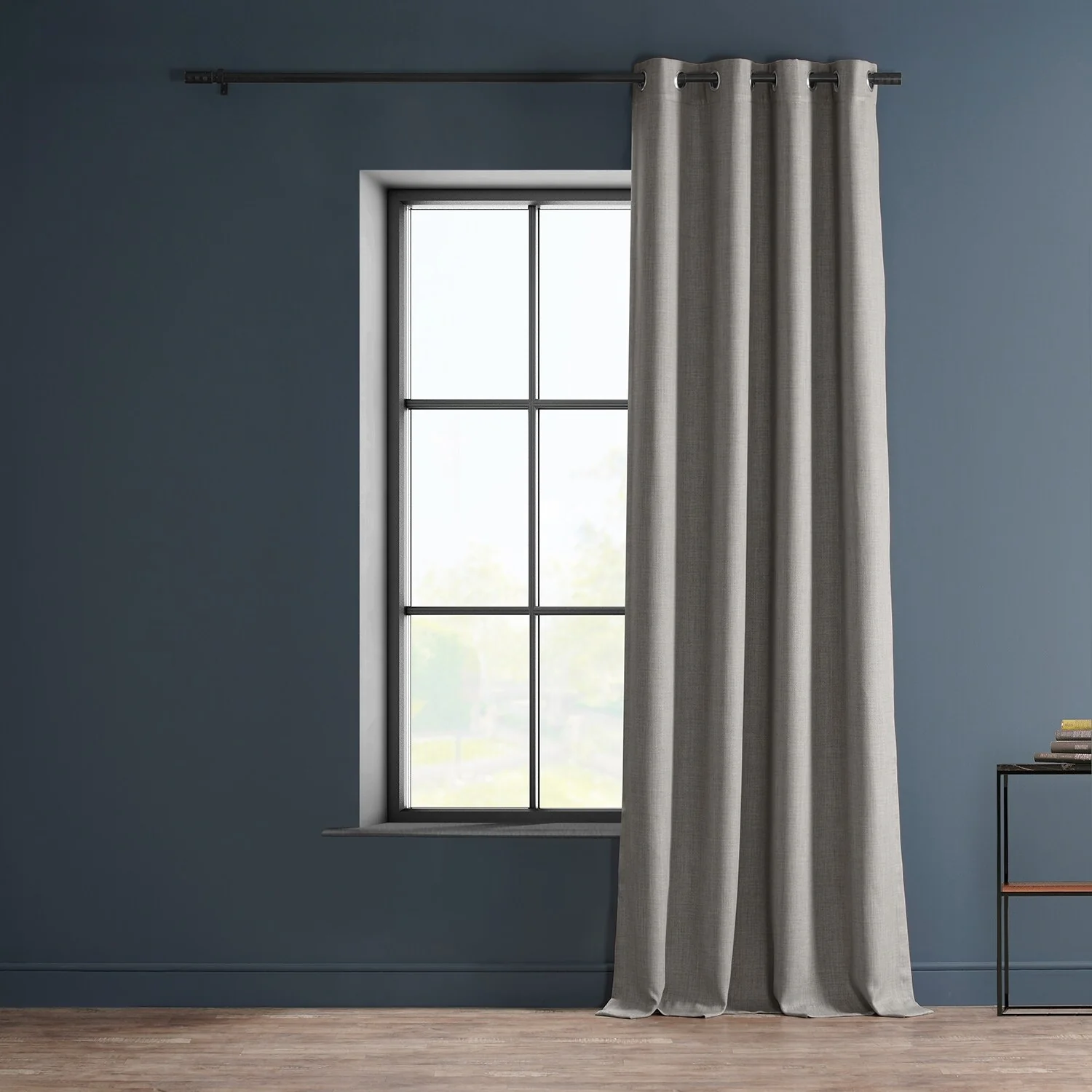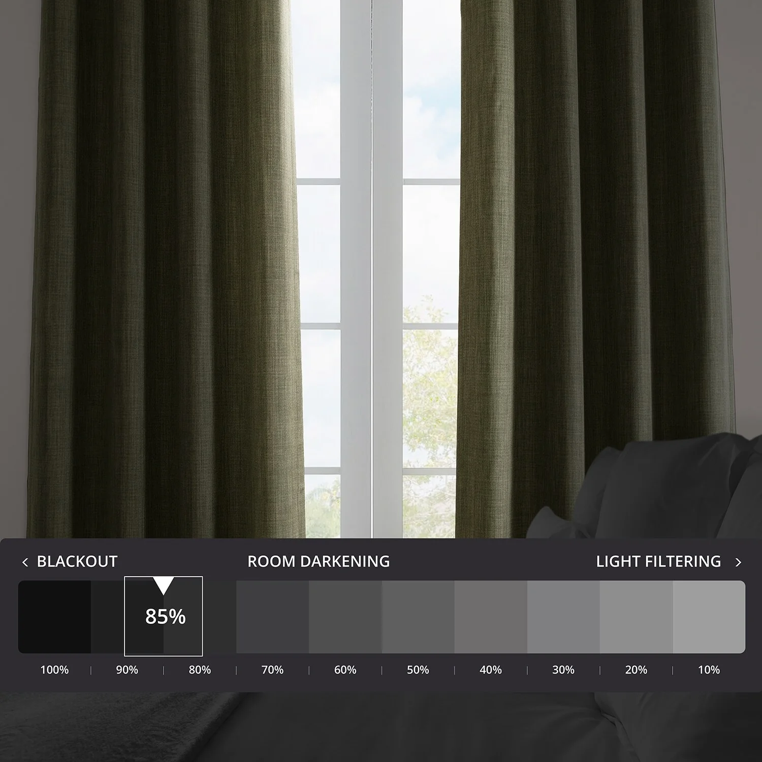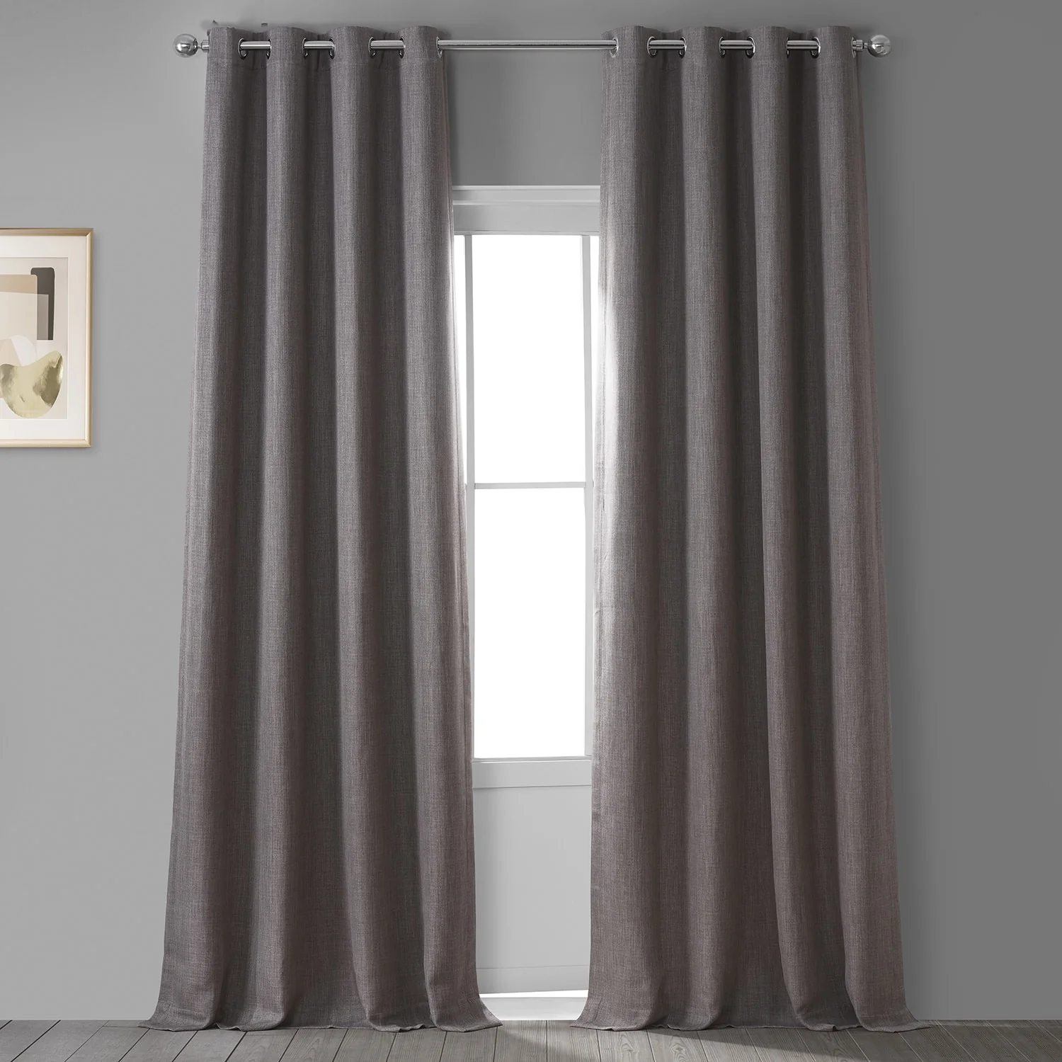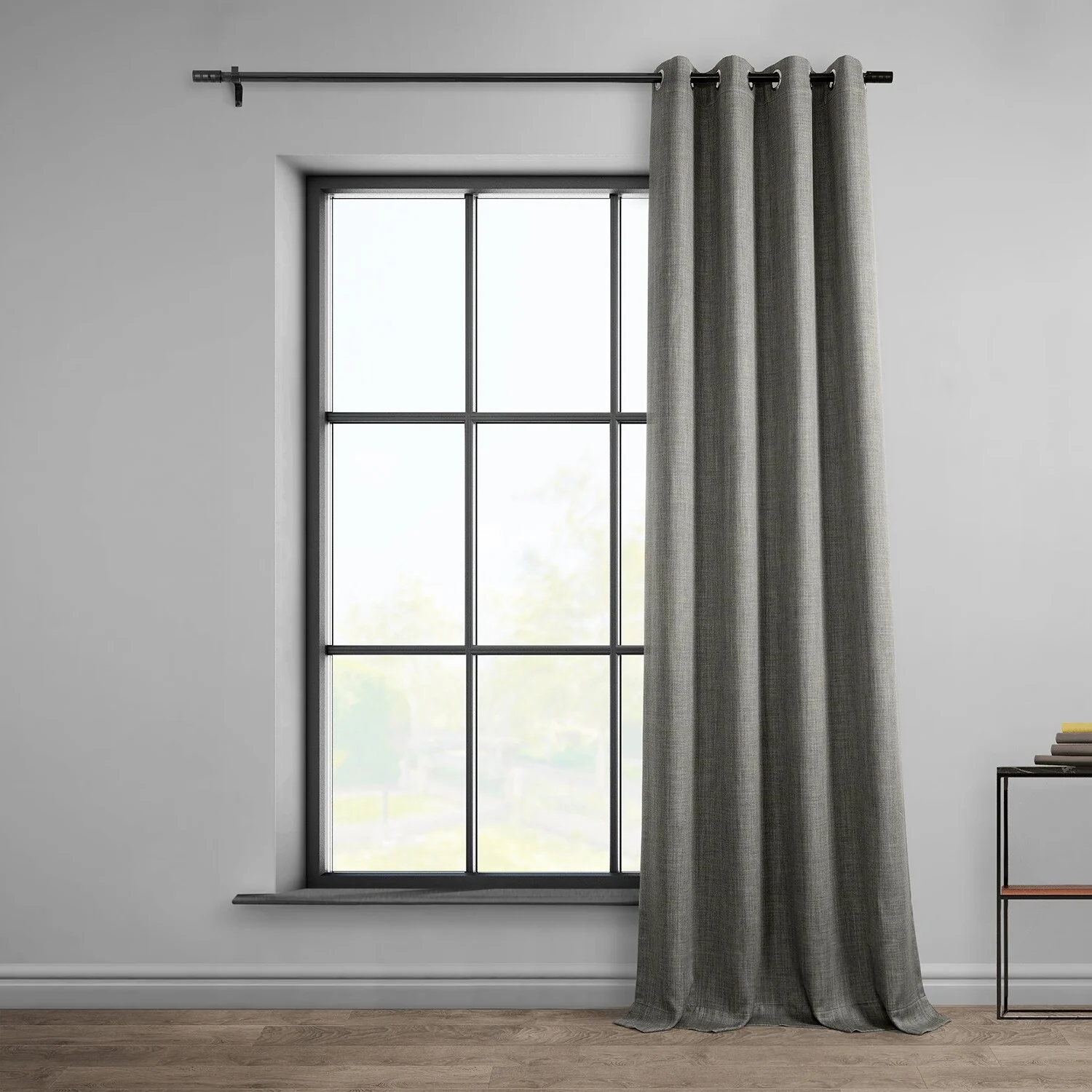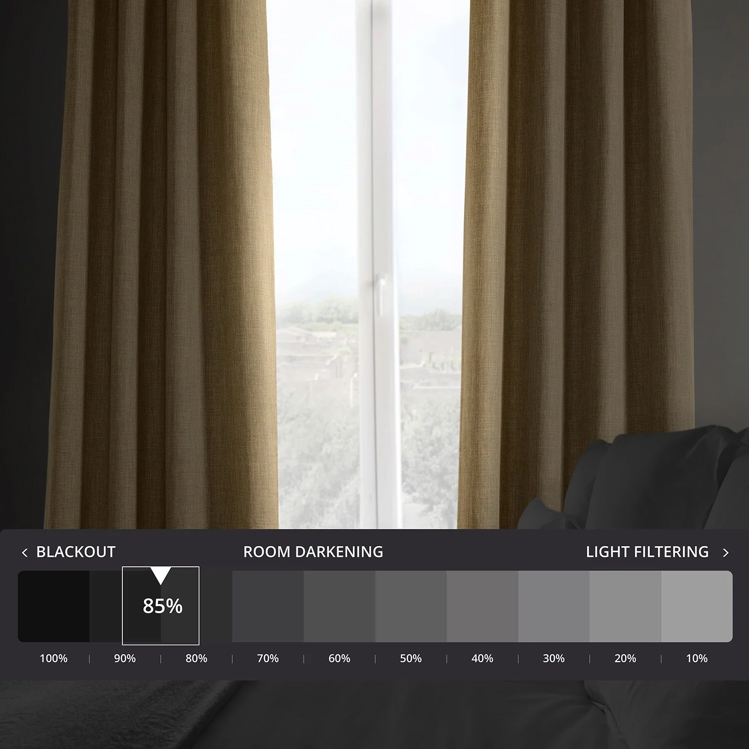 Our Faux Linen Grommet Room Darkening Curtain features rich woven textures in modern designer colors for every style. These heavy faux linen panels have significant room-darkening properties and a weighted hem to hang nicely and keep them in place. This style panel features large metal eyelets that slide onto a curtain rod. They are ideal if you want a clean modern look for a treatment you do not intend to pull back and forth every day. The inside diameter of the eyelets is 1 5/8'. We do not recommend that you use a rod with a diameter larger than 1 1/2' for ease of use. We try to provide the most accurate digital images possible. Color may appear slightly different from one screen to another based on differences in computer monitors, brightness, and other selected settings so there may be variations in color between the actual product and the way it appears online. This curtain offers Room Darkening capabilities with an impressive 85% opacity for Blackout effect.