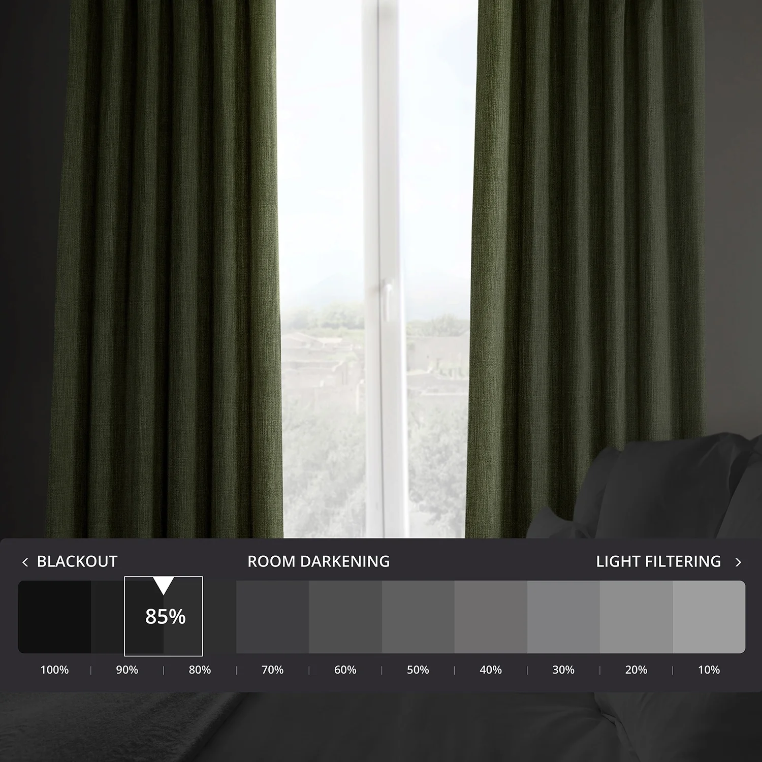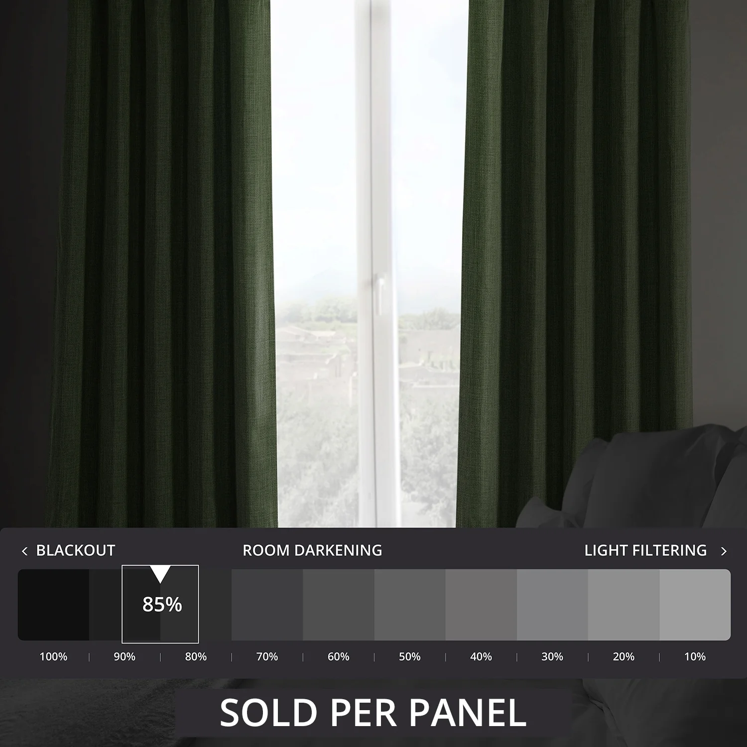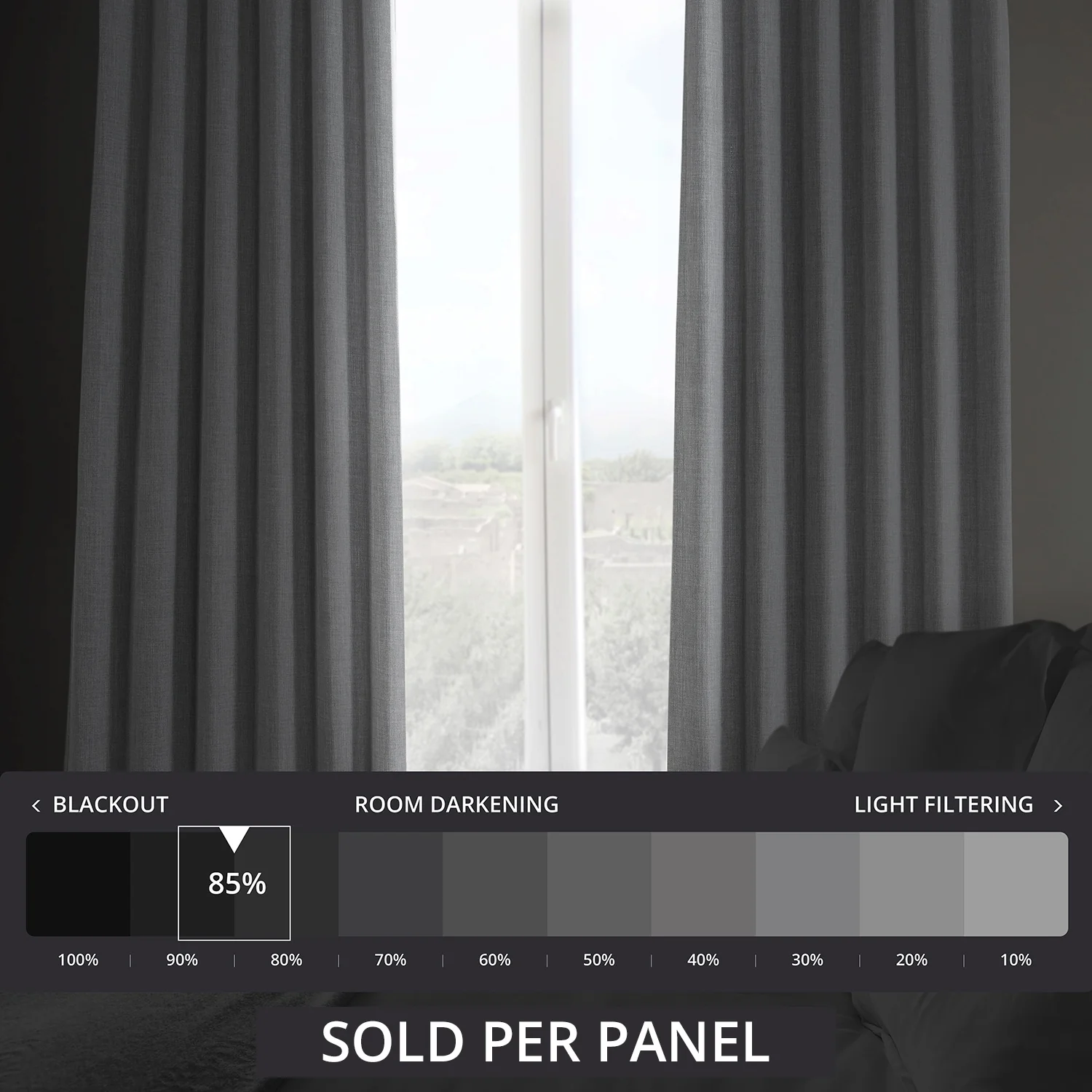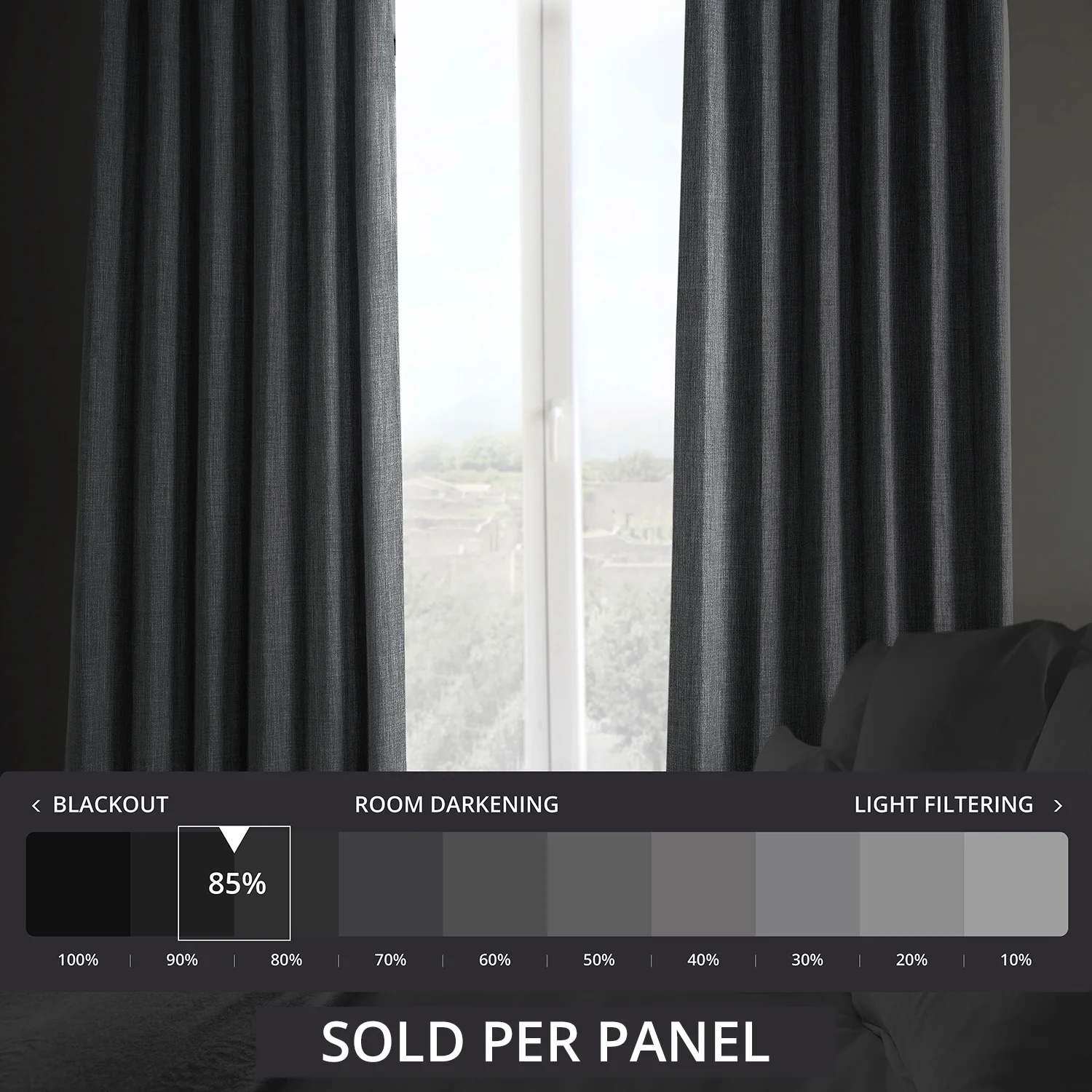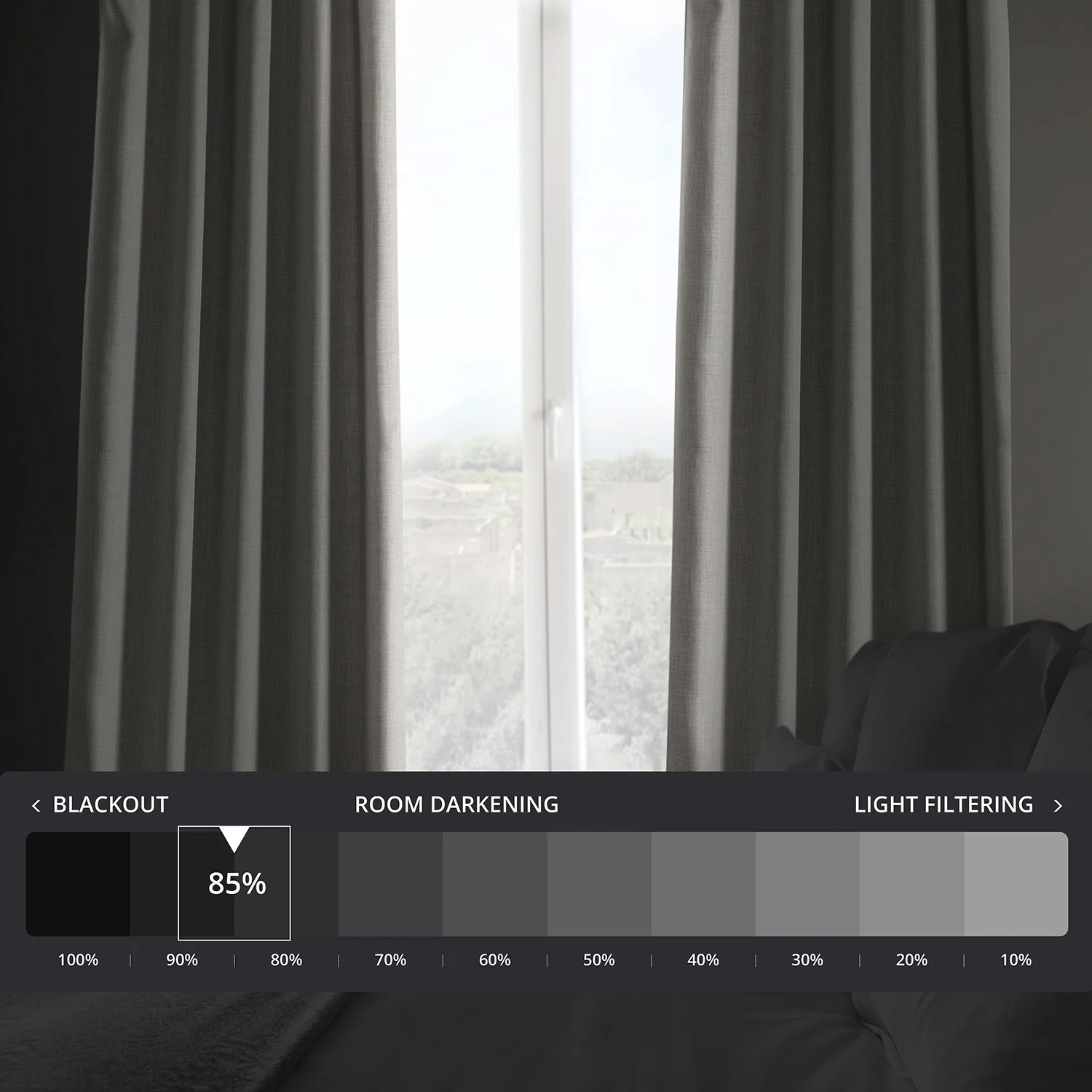 Our Faux Linen Room Darkening Curtain features rich woven textures in modern designer colors for every style. These heavy faux linen panels have significant room-darkening properties and a weighted hem to hang nicely and keep them in place. These curtains have our most versatile header, a rod pocket with back tabs, and hook belt. There is a 3' pole pocket in the header and back tab loops that will accommodate up to a 1.5' diameter curtain rod with no additional hardware. Additionally, these panels can be attached to curtain rings from clips or by running an S-shaped drapery pin through the back of the header and hanging the drapery pin through an eyelet on the rings. These curtains are sold with no hardware like rings or hooks. We try to provide the most accurate digital images possible. Color may appear slightly different from one screen to another based on differences in computer monitors, brightness, and other selected settings so there may be variations in color between the actual product and the way it appears online. This curtain offers Room Darkening capabilities with an impressive 85% opacity for Blackout effect.