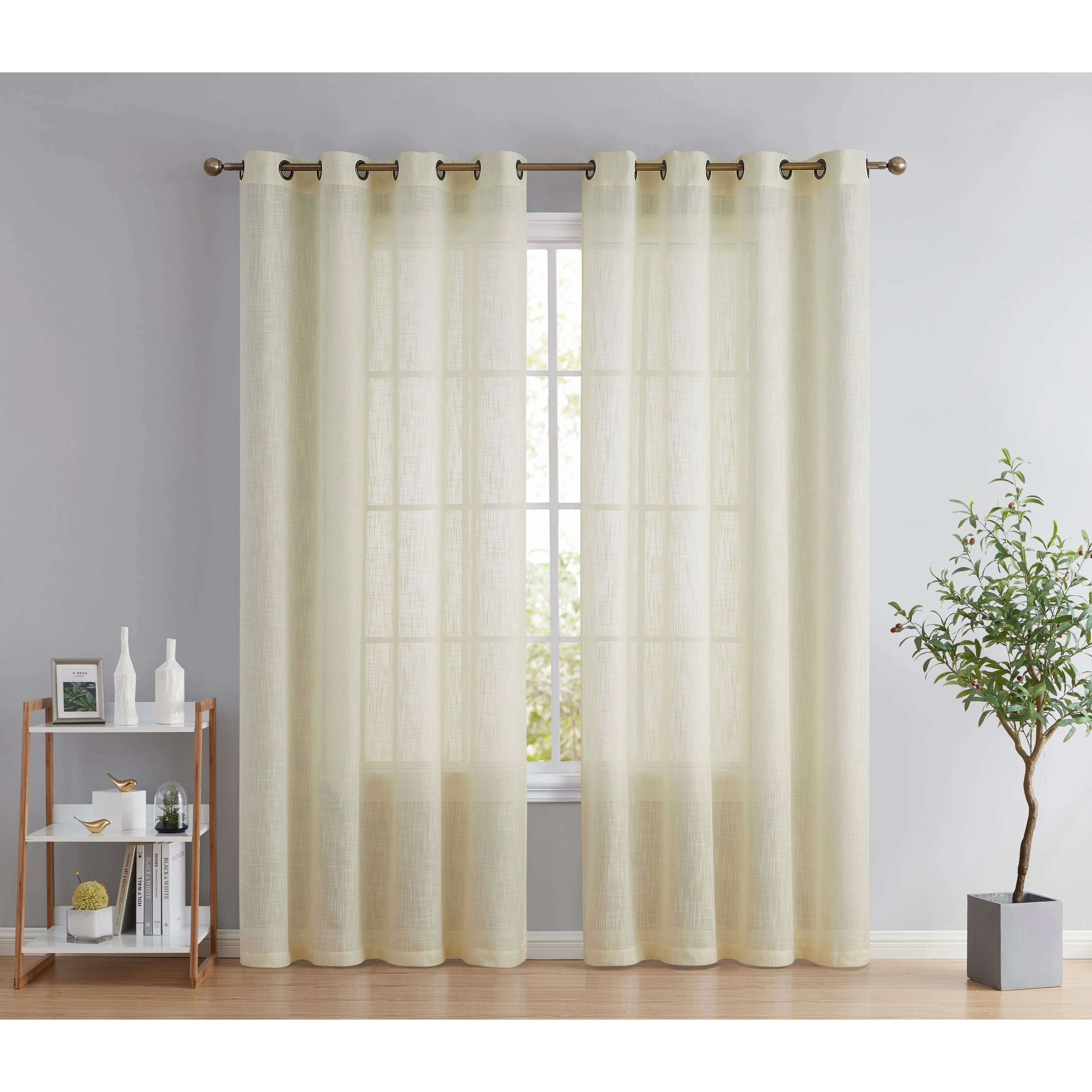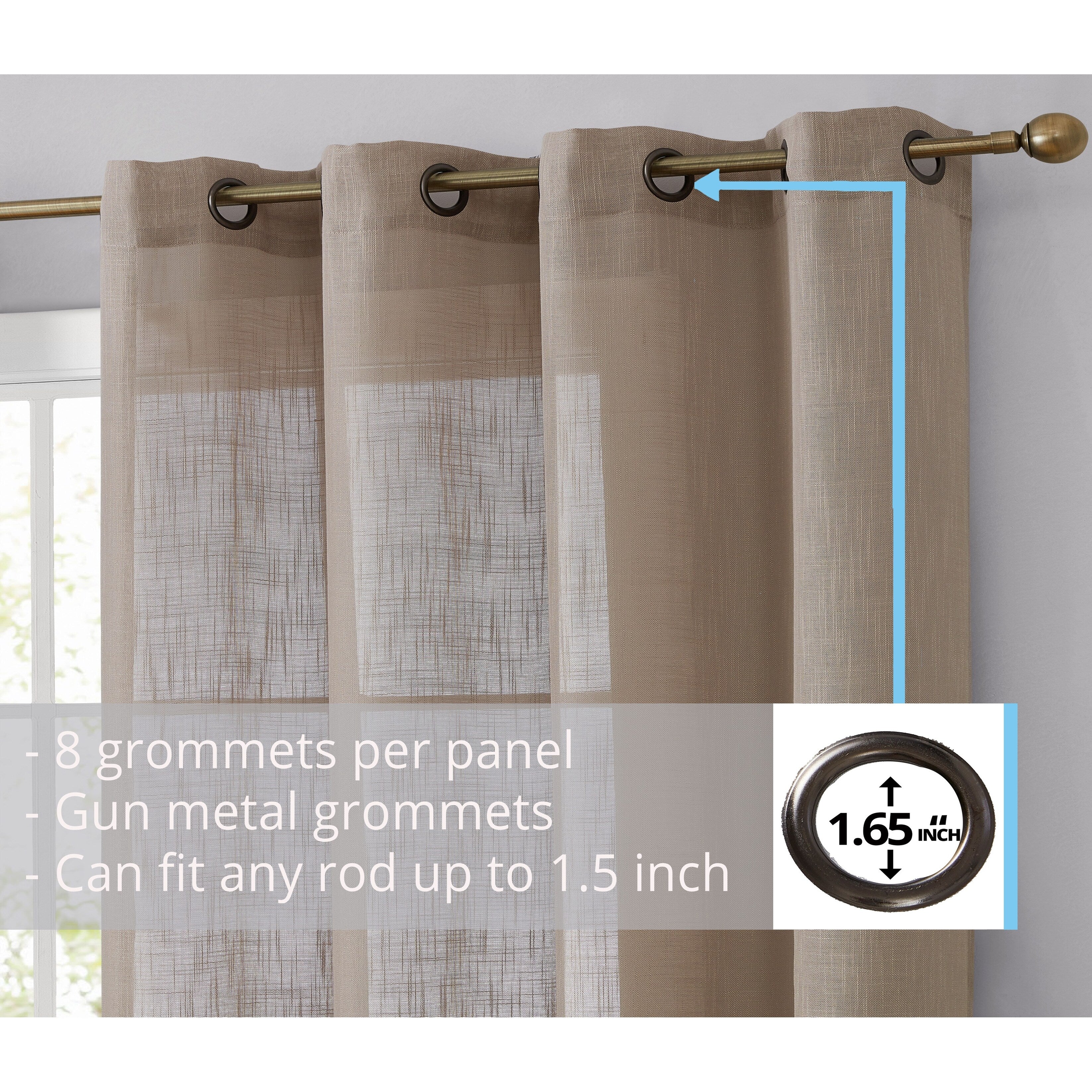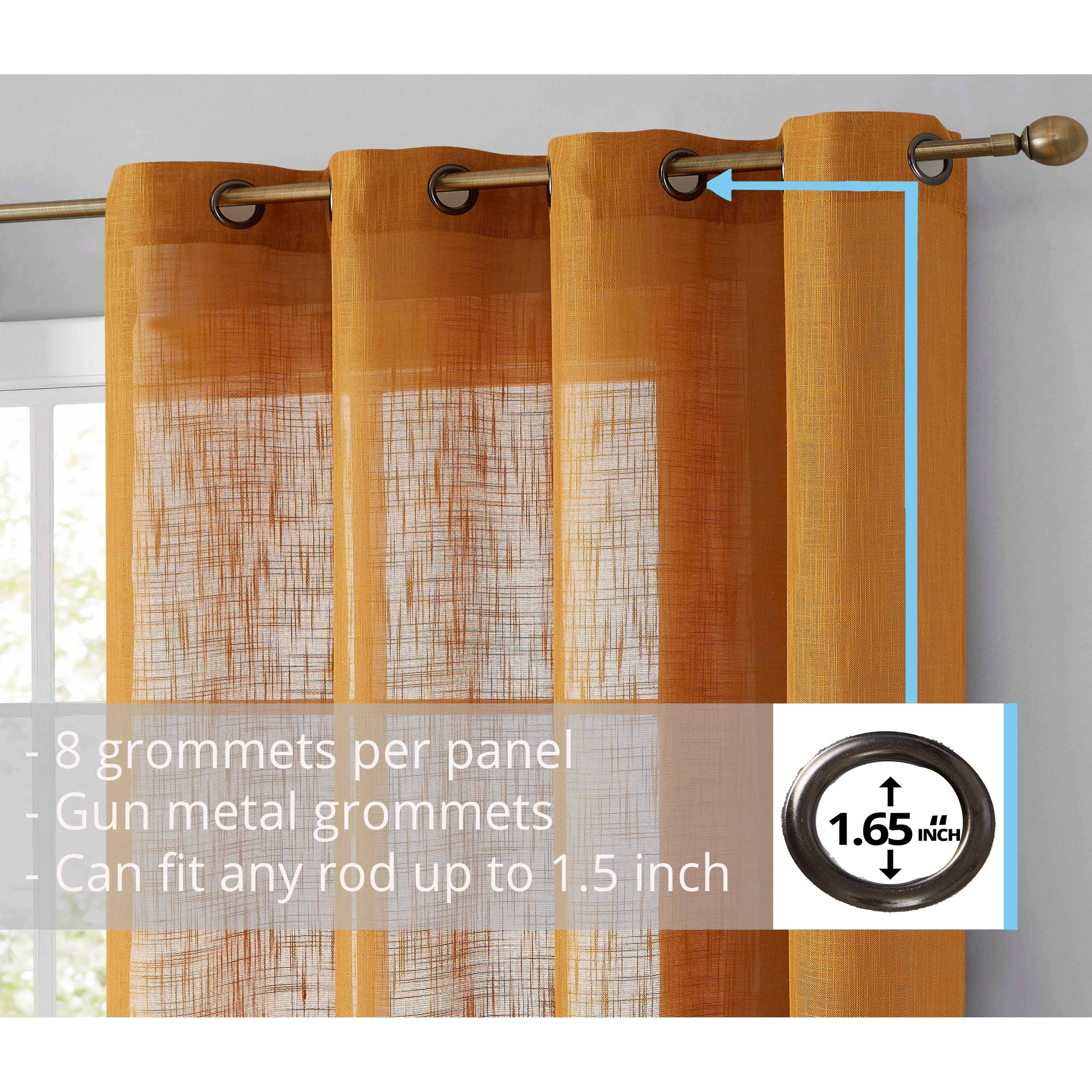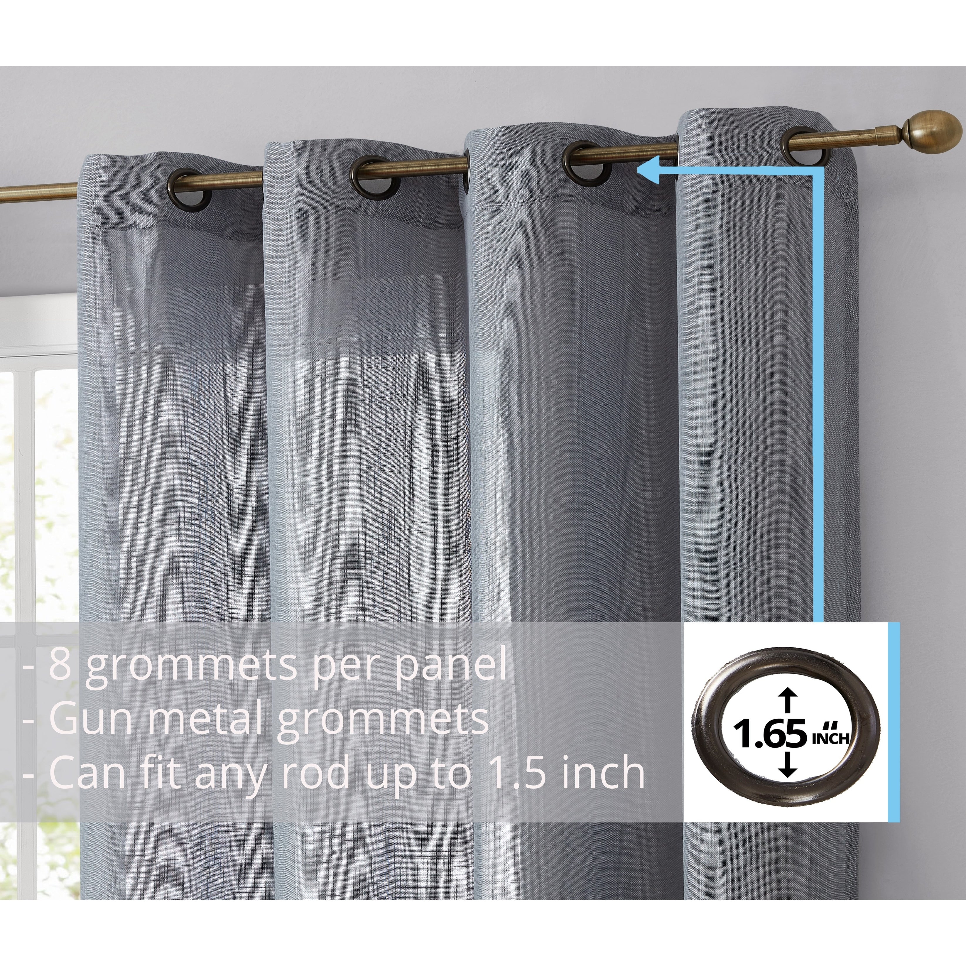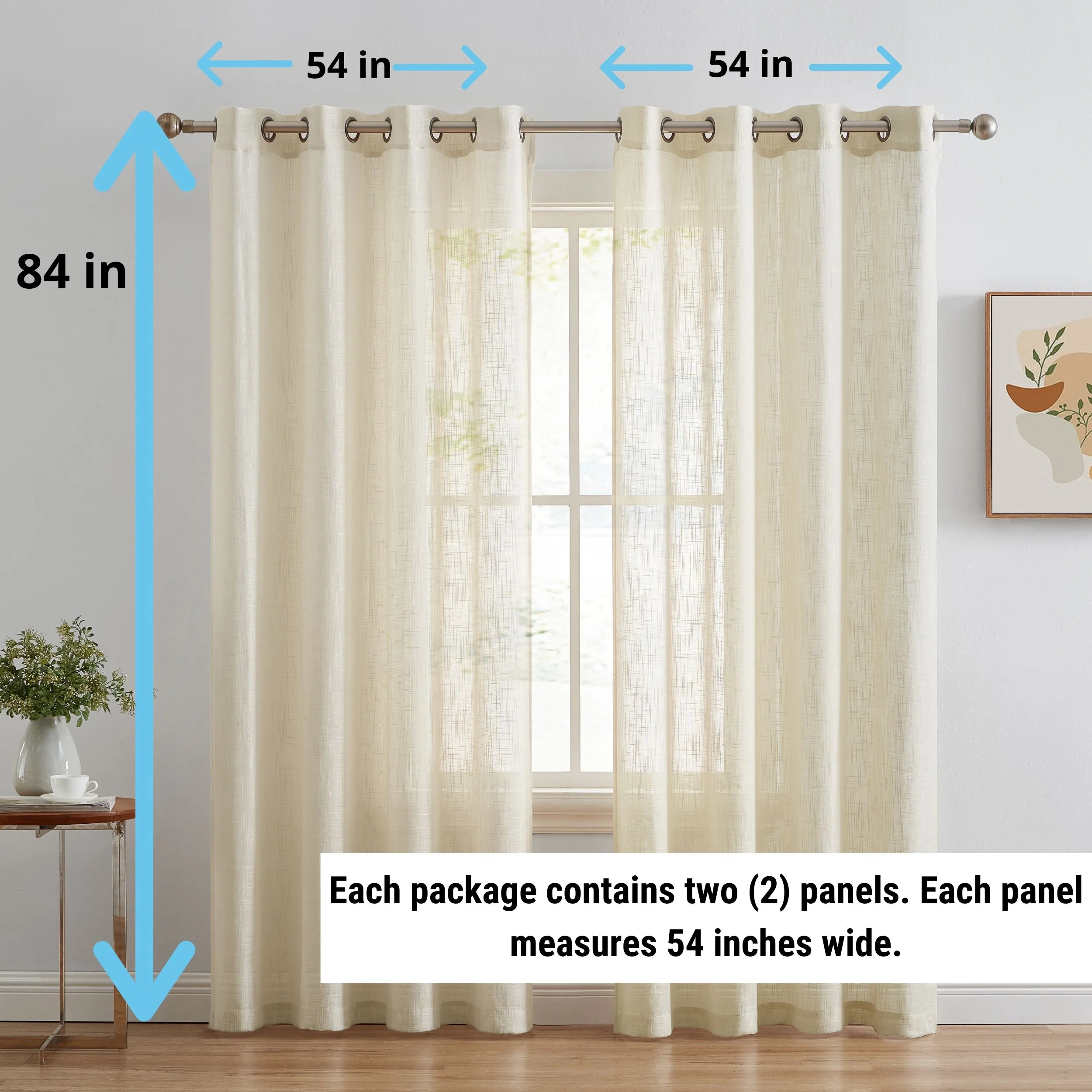 Heavy Faux Linen Textured Semi Sheer Curtain Grommet Panels will liven up your indoor or outdoor spaces with a sense of airiness and beauty. Made from solid color polyester voile. Bring elegance and class to any room with this light filtering semi sheer curtains. Our luxurious sheer grommet panels gives your home a new elegant look. Allows natural light to flow through the room. Available in 63' inches long, 72' inches long, 84' inches long, 96' inches long, and 108' inches long. For a full look use two (2) panels to cover a standard size window. This picture shows two (2) sheer grommet panels and this package contains two (2) Sheer Grommet Panels.