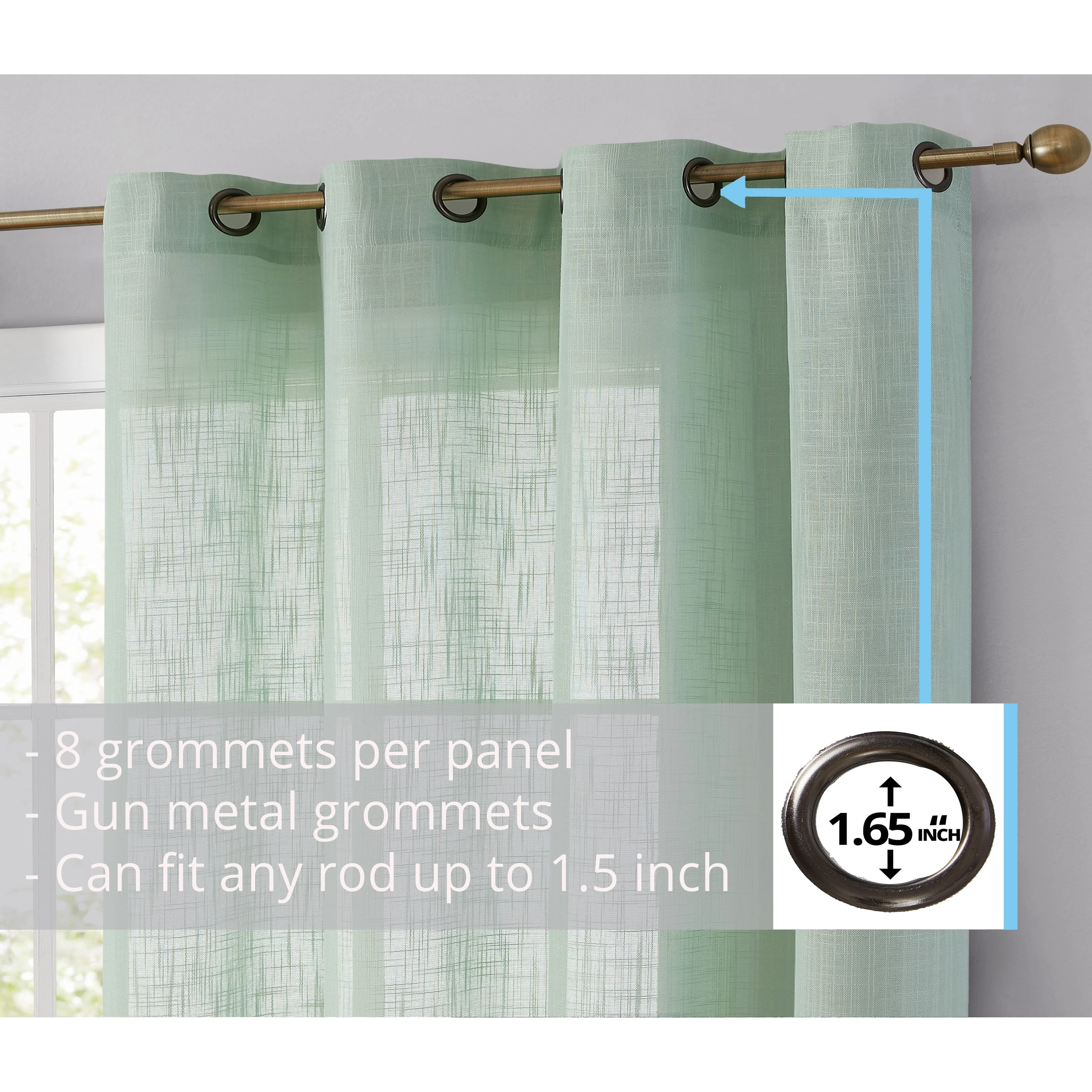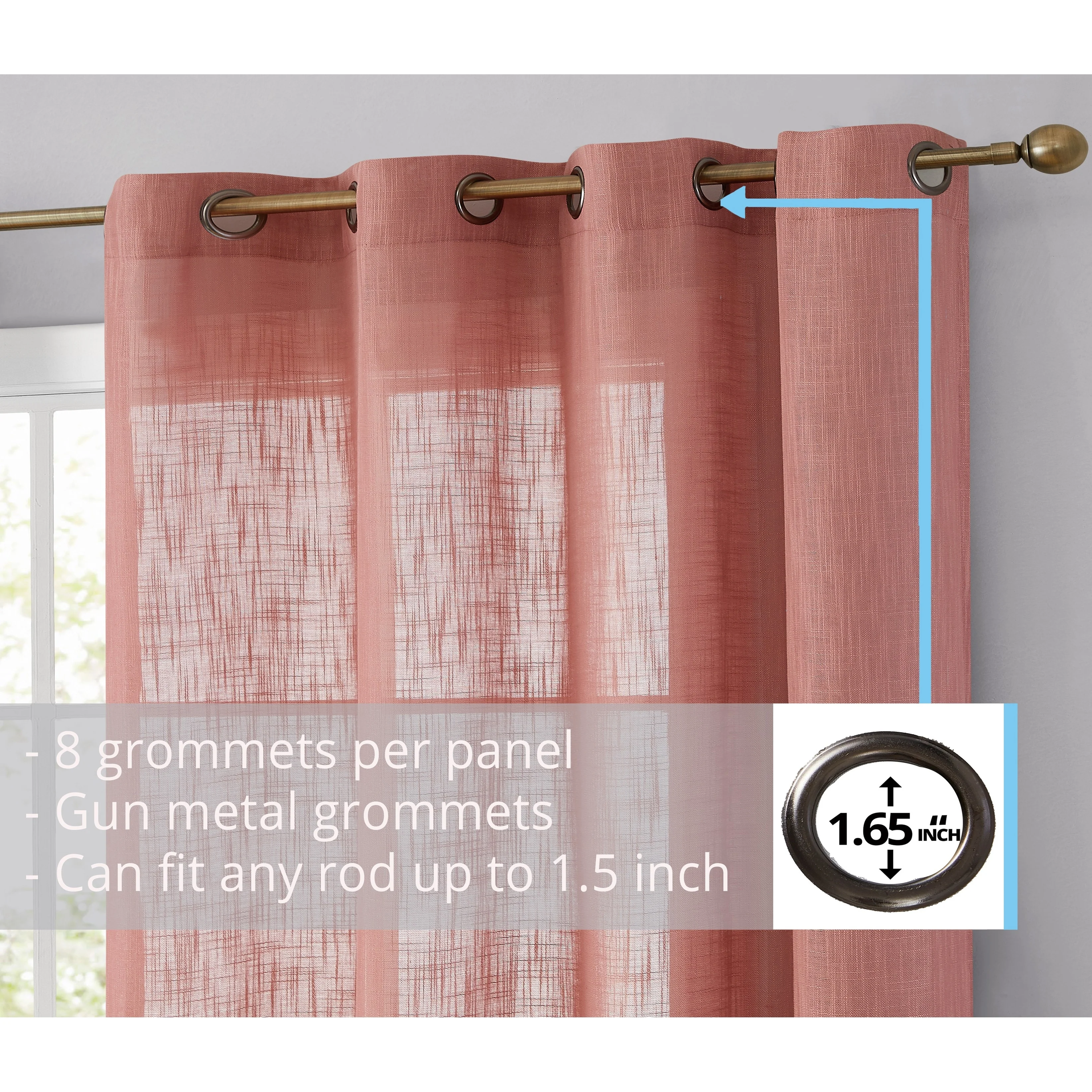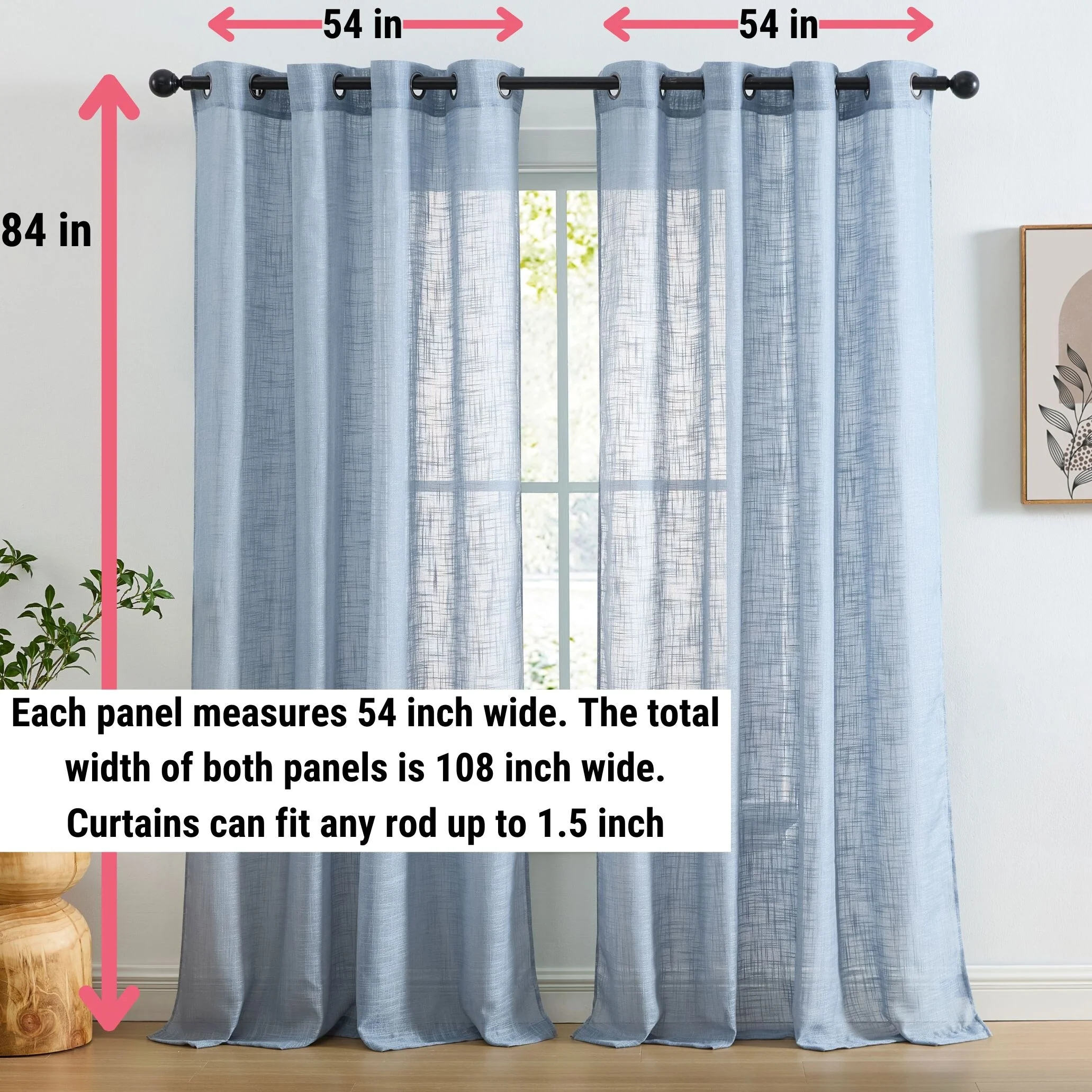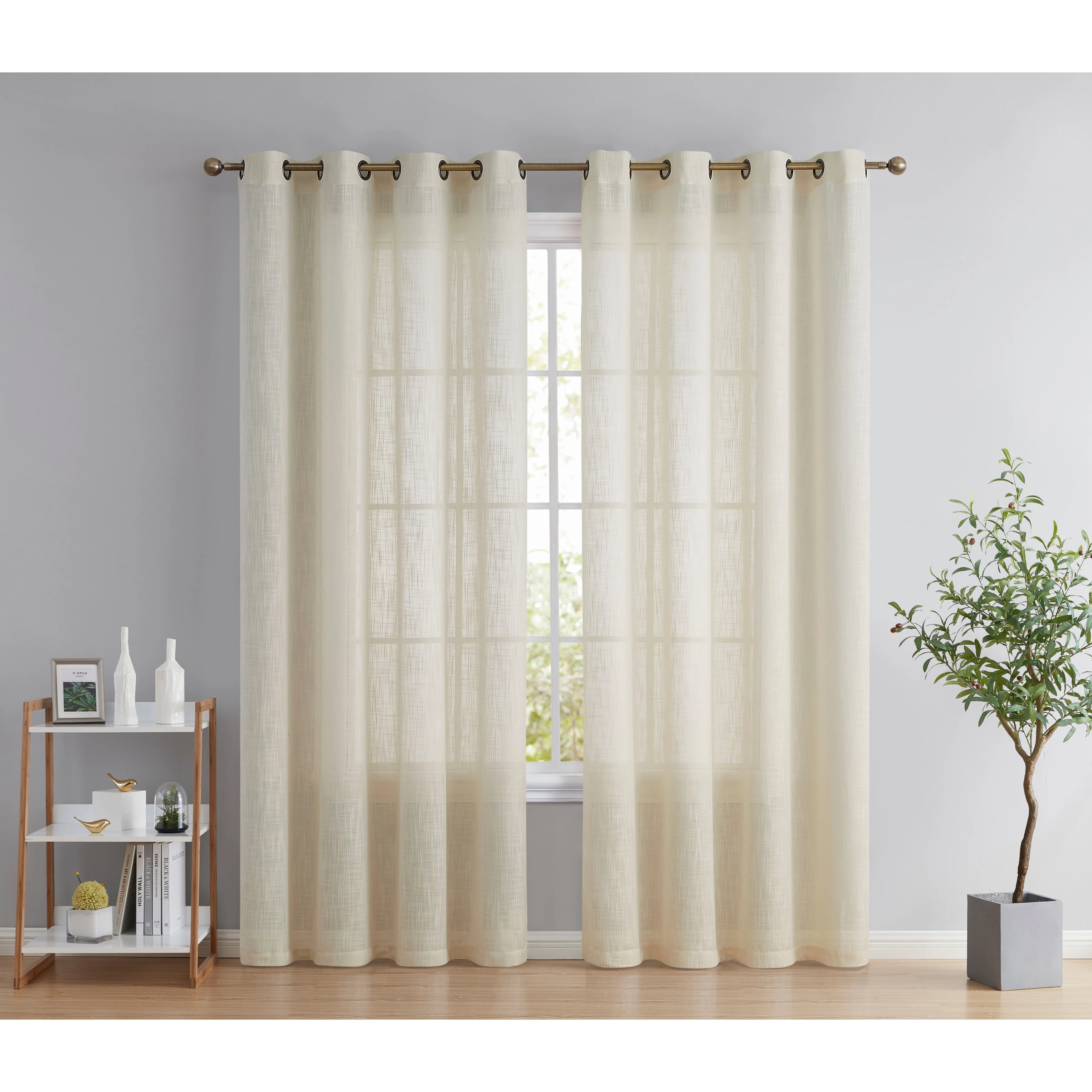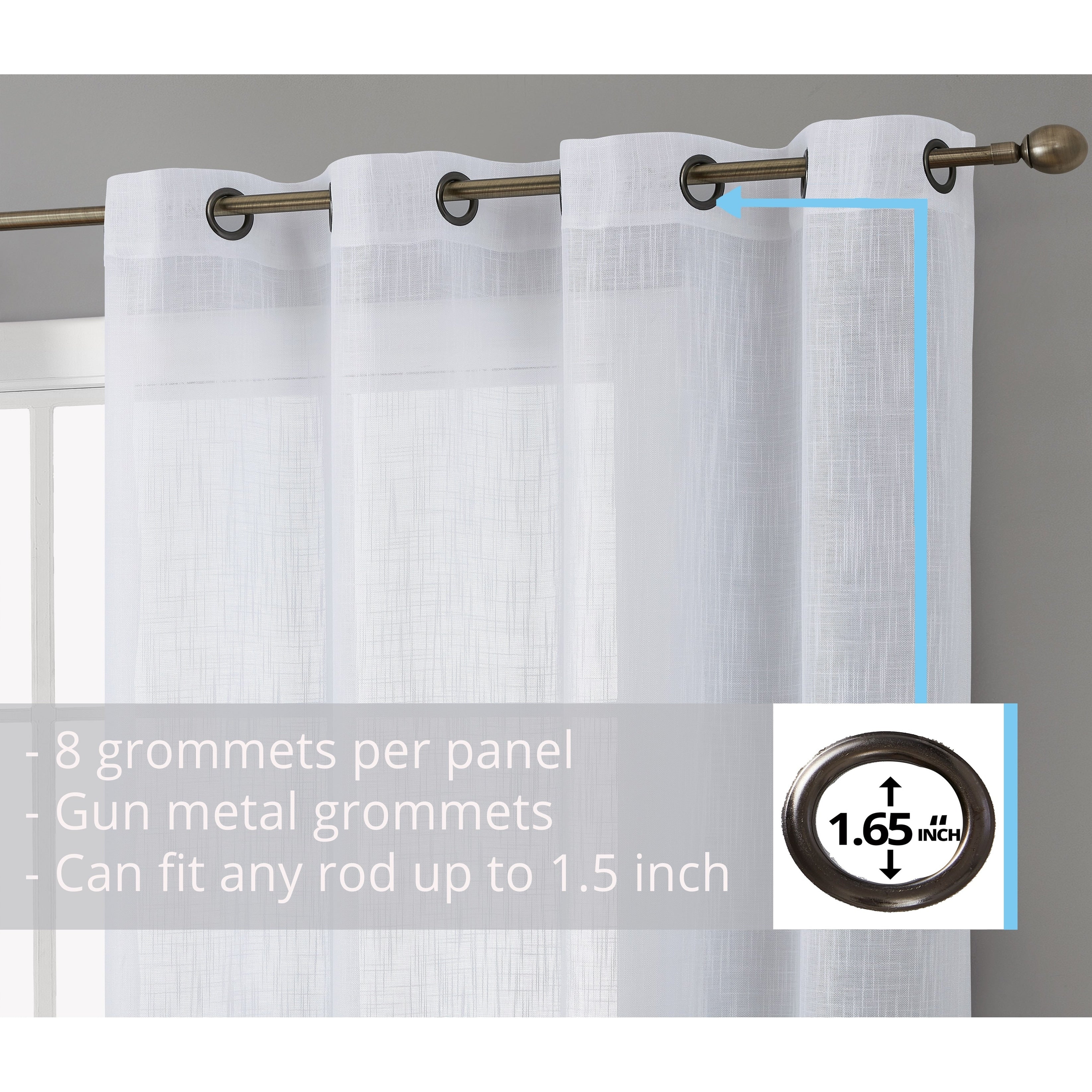 Heavy Faux Linen Textured Semi Sheer Curtain Grommet Panels will liven up your indoor or outdoor spaces with a sense of airiness and beauty. Made from solid color polyester voile. Bring elegance and class to any room with this light filtering semi sheer curtains. Our luxurious sheer grommet panels gives your home a new elegant look. Allows natural light to flow through the room. Available in 63' inches long, 72' inches long, 84' inches long, 96' inches long, and 108' inches long. For a full look use two (2) panels to cover a standard size window. This picture shows two (2) sheer grommet panels and this package contains two (2) Sheer Grommet Panels.