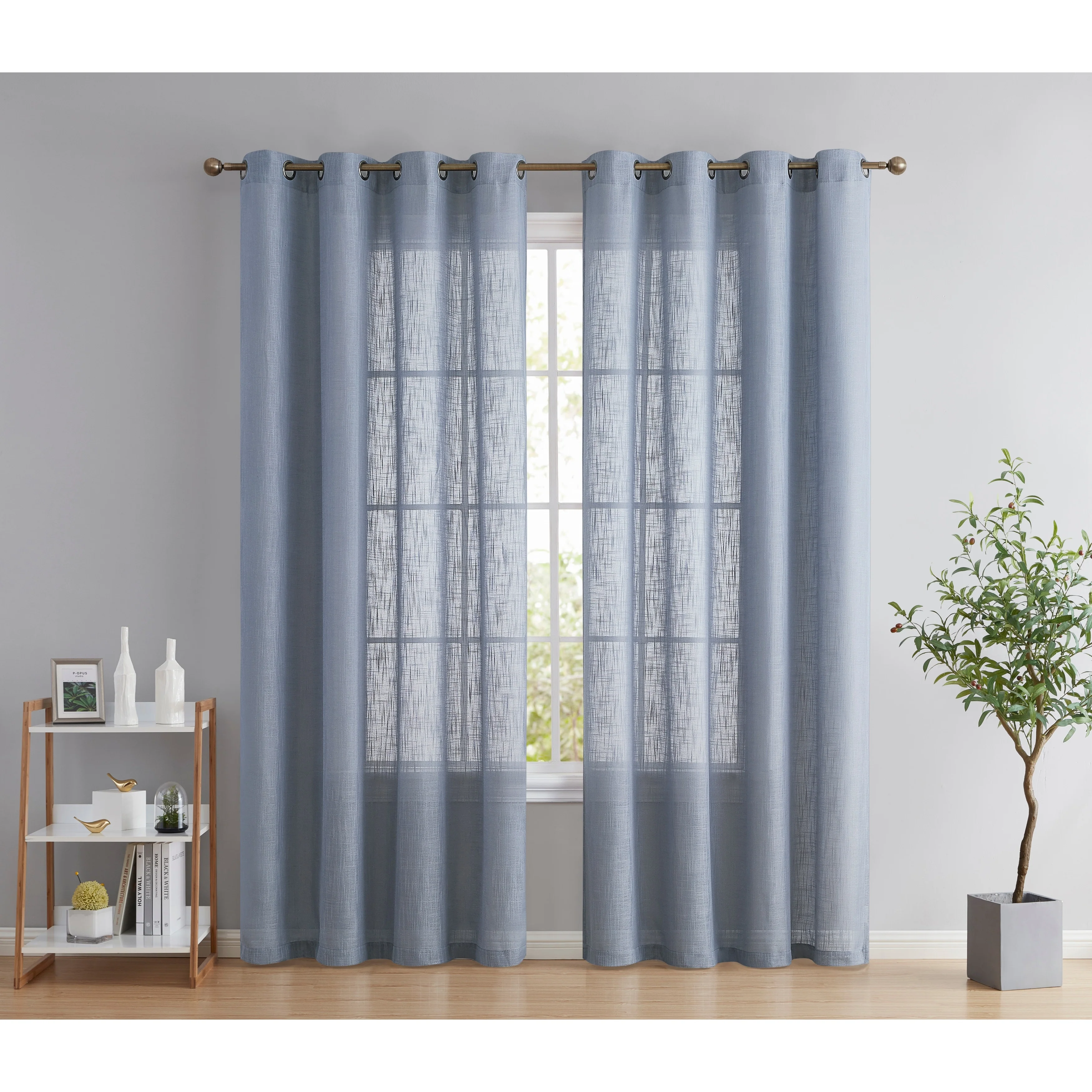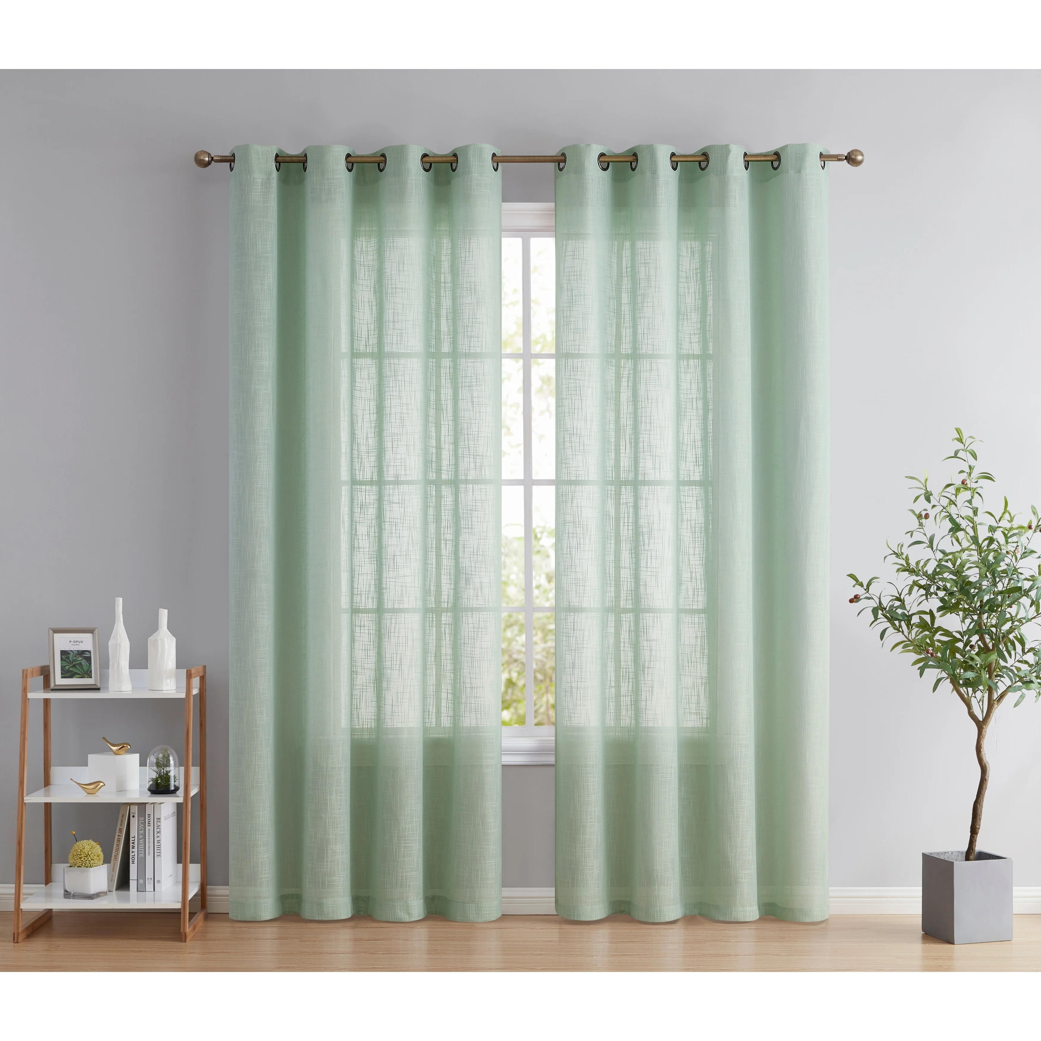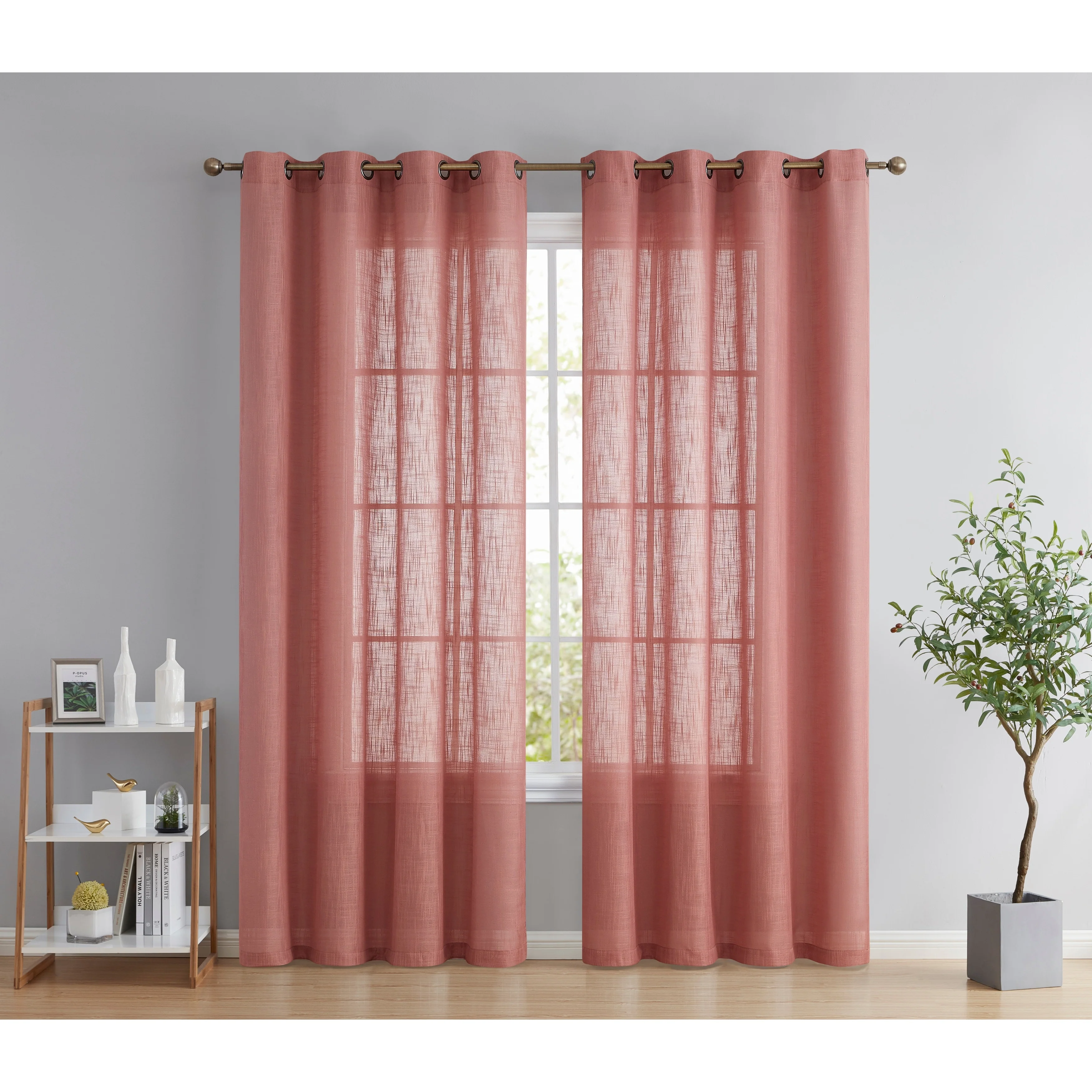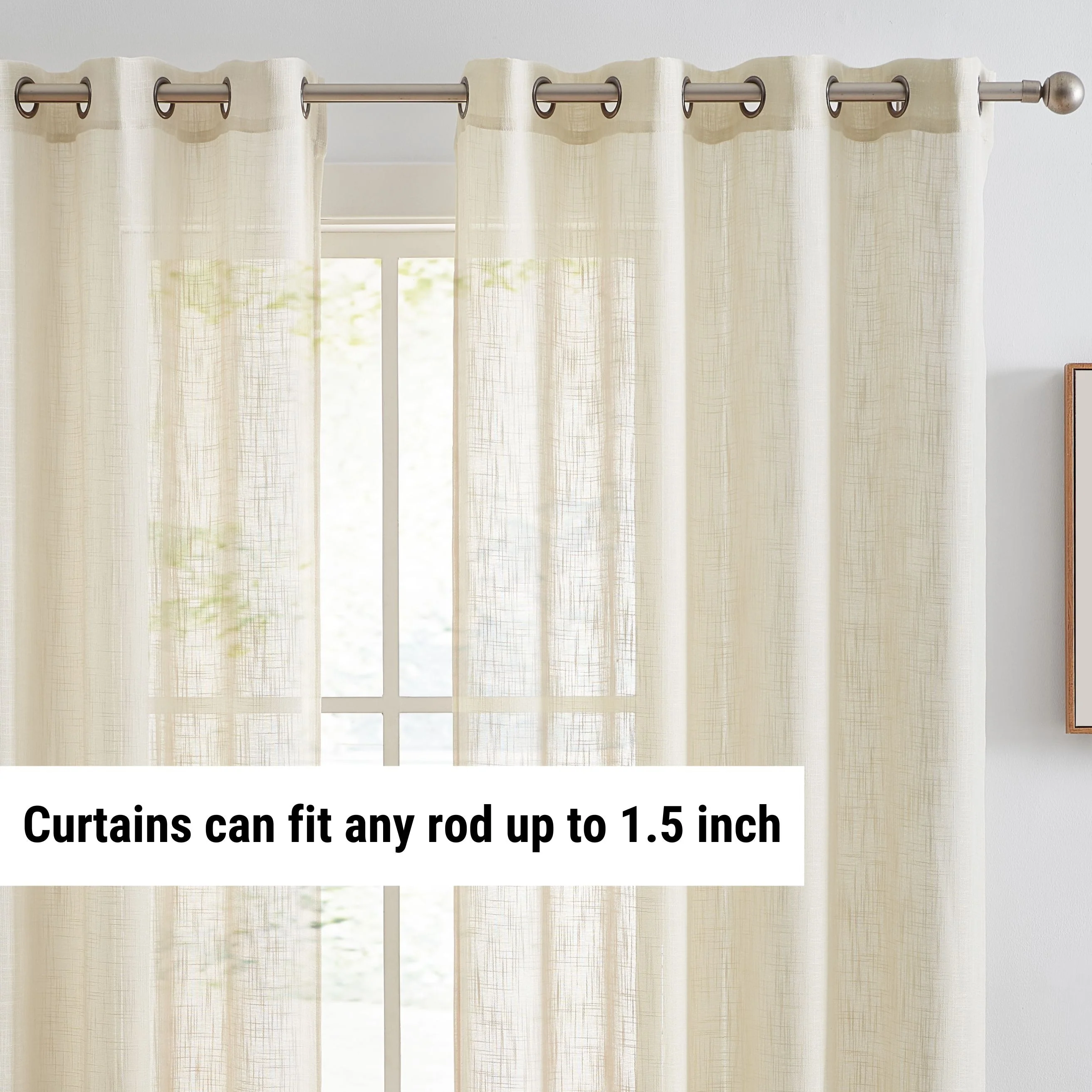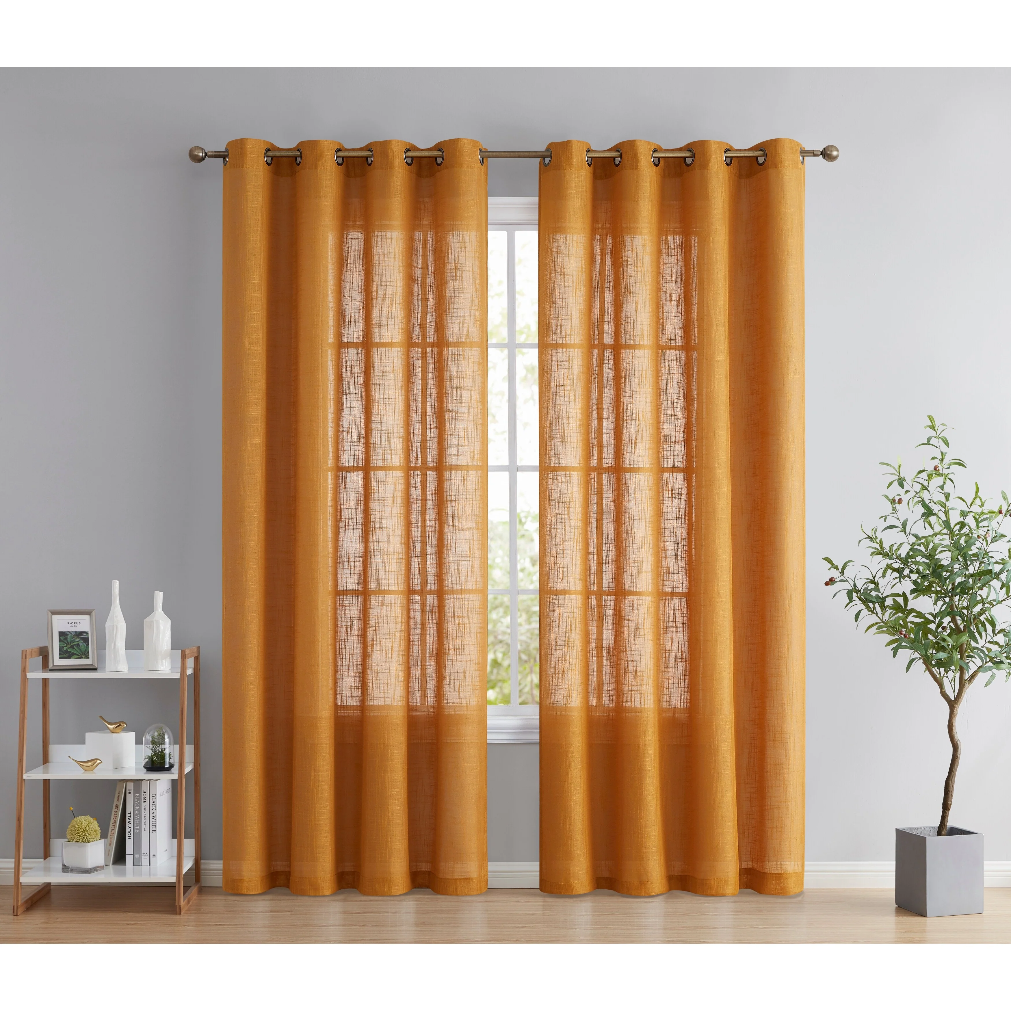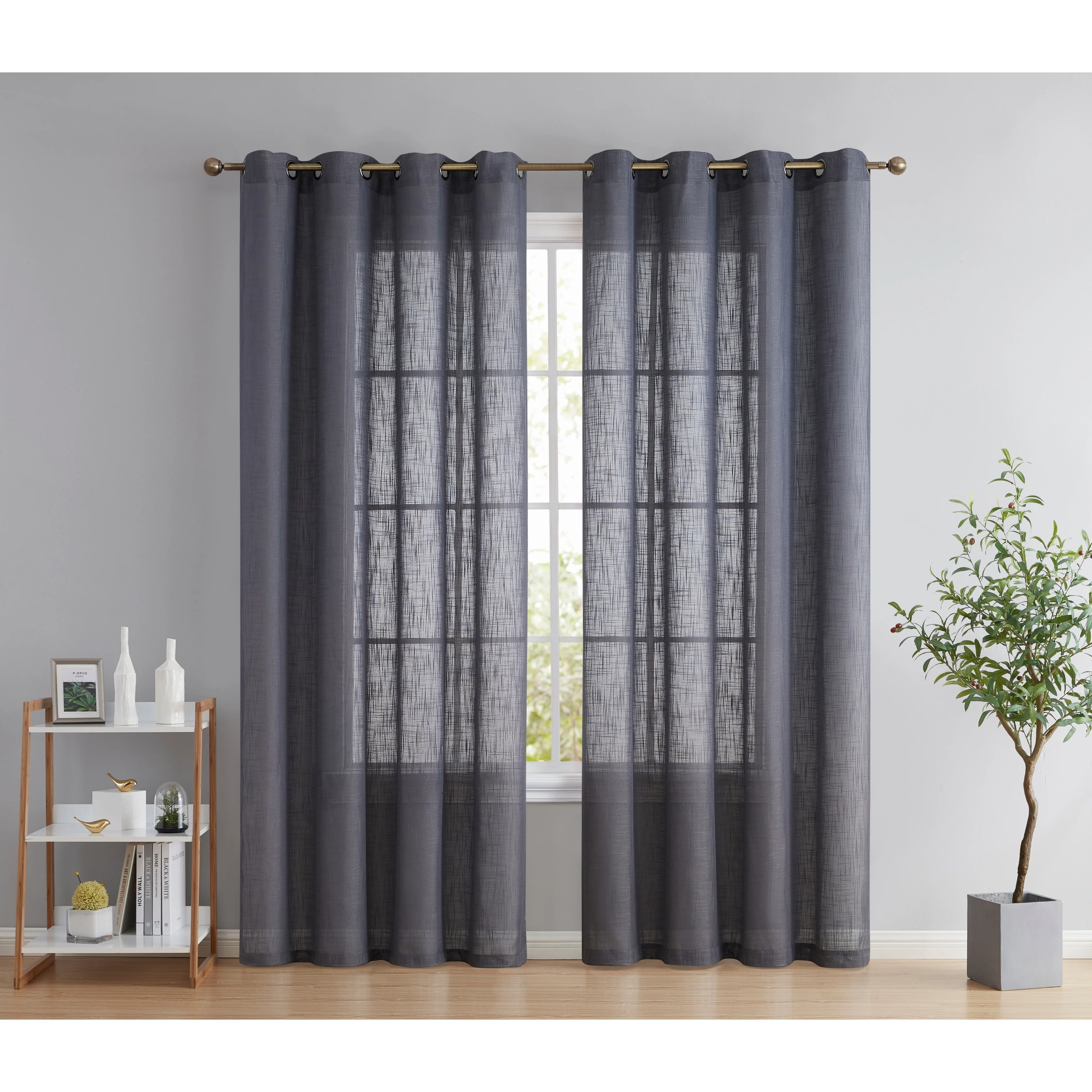 Heavy Faux Linen Textured Semi Sheer Curtain Grommet Panels will liven up your indoor or outdoor spaces with a sense of airiness and beauty. Made from solid color polyester voile. Bring elegance and class to any room with this light filtering semi sheer curtains. Our luxurious sheer grommet panels gives your home a new elegant look. Allows natural light to flow through the room. Available in 63' inches long, 72' inches long, 84' inches long, 96' inches long, and 108' inches long. For a full look use two (2) panels to cover a standard size window. This picture shows two (2) sheer grommet panels and this package contains two (2) Sheer Grommet Panels.
