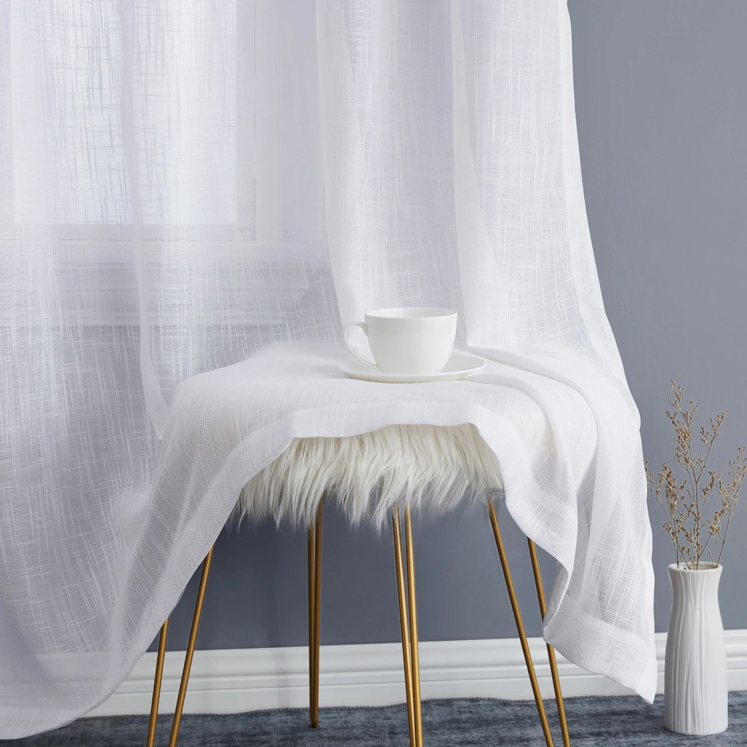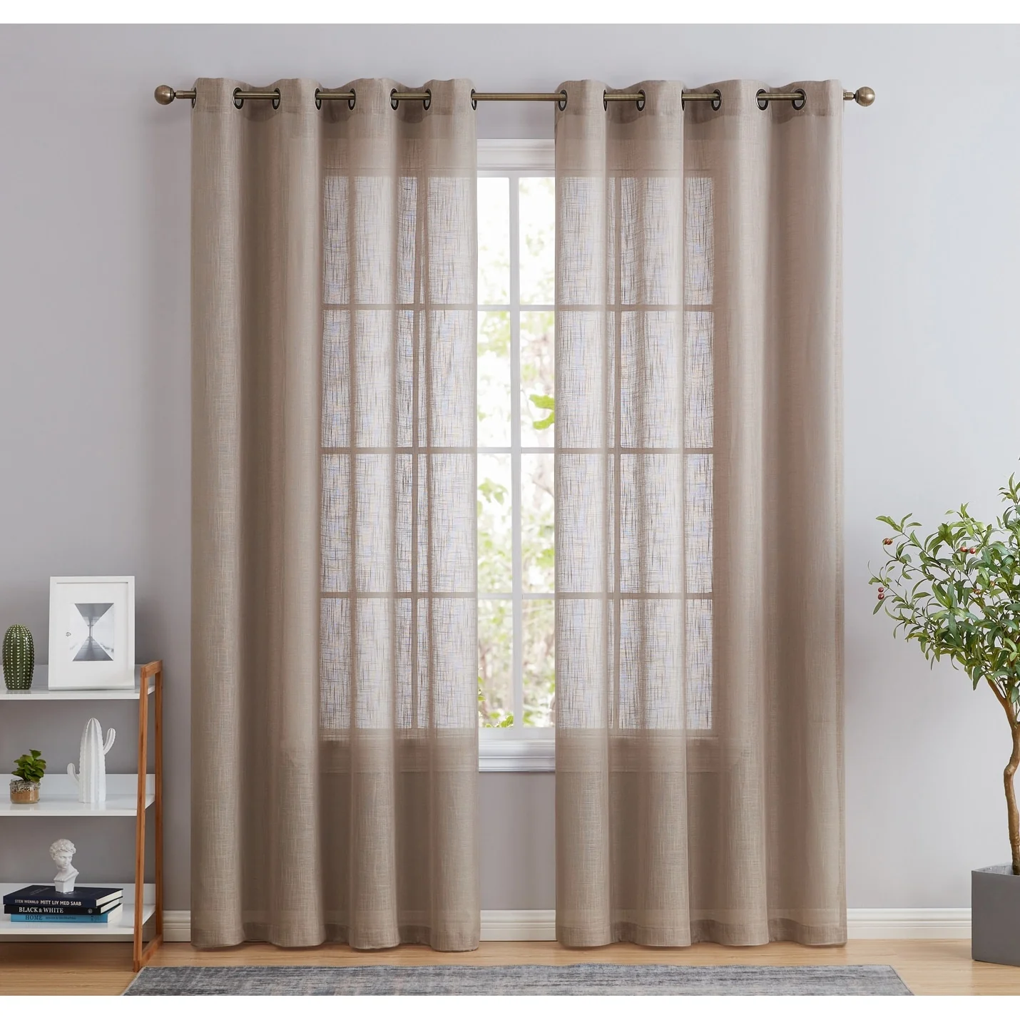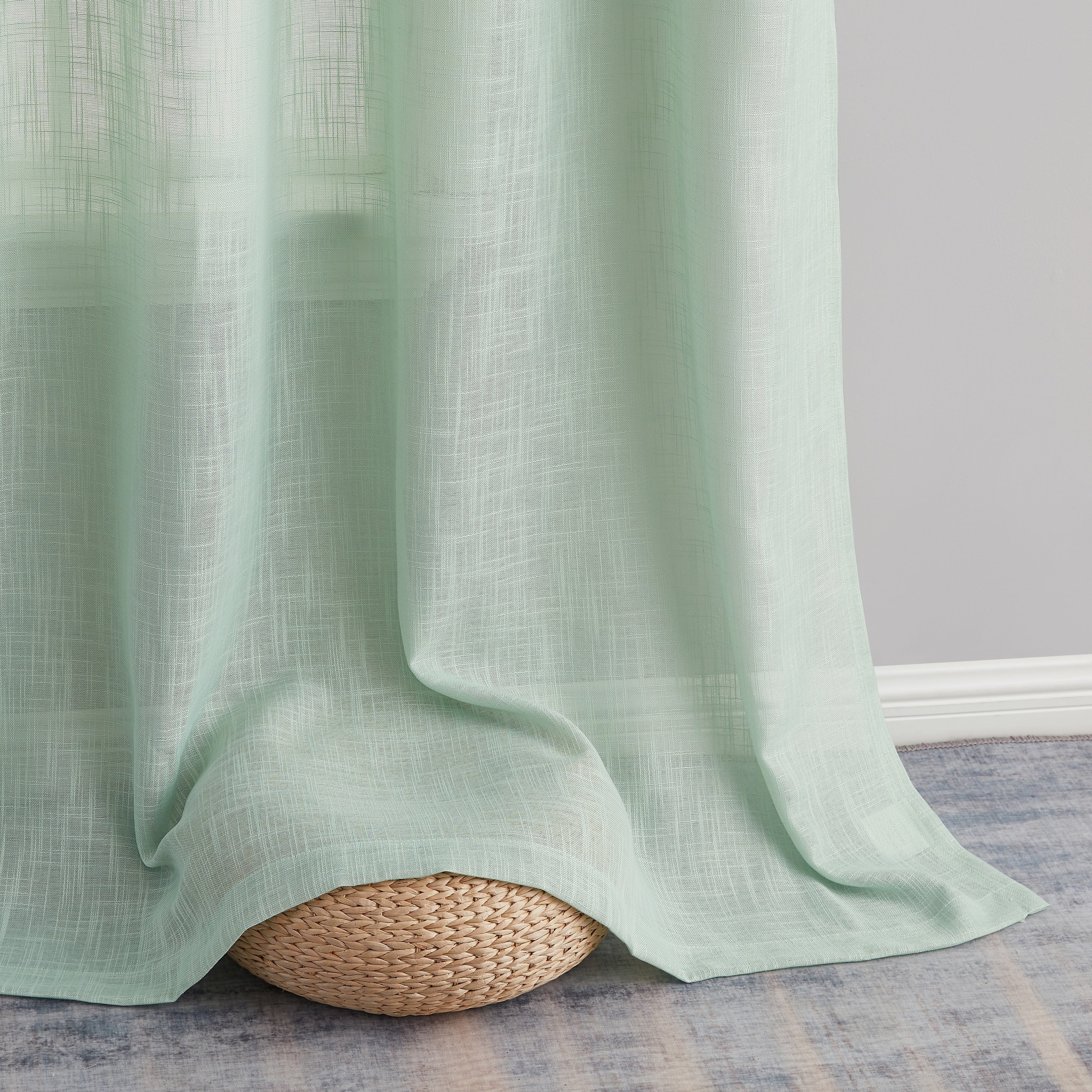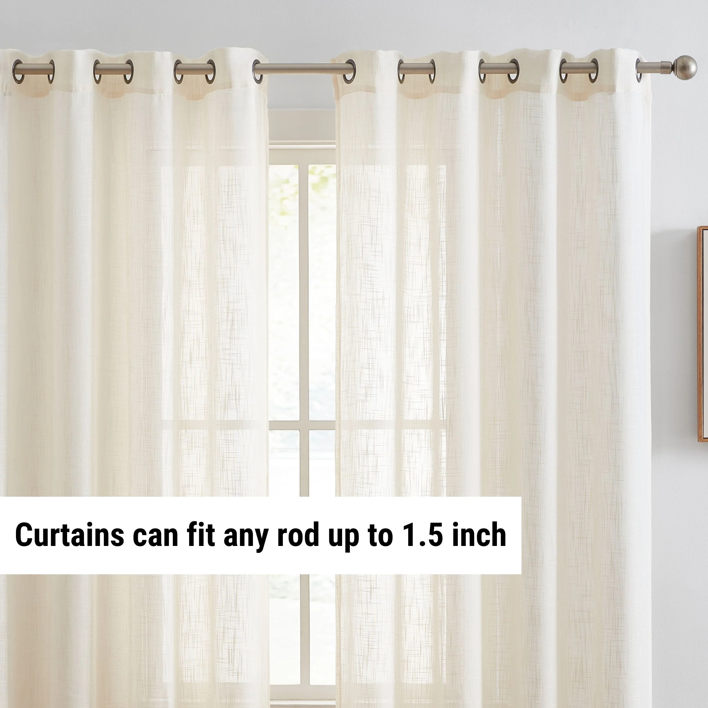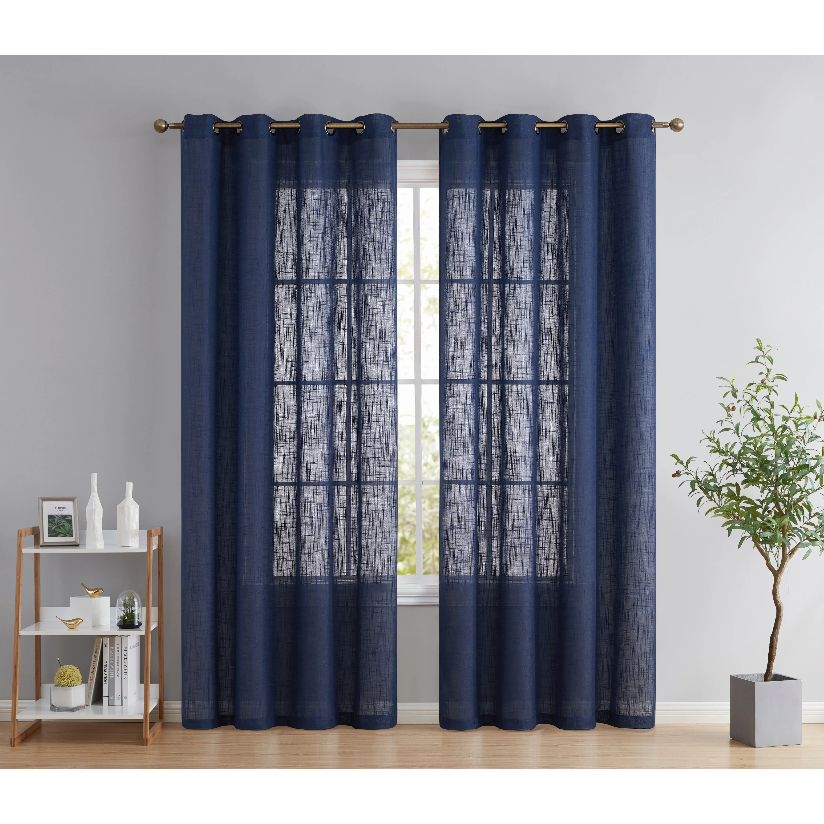 Heavy Faux Linen Textured Semi Sheer Curtain Grommet Panels will liven up your indoor or outdoor spaces with a sense of airiness and beauty. Made from solid color polyester voile. Bring elegance and class to any room with this light filtering semi sheer curtains. Our luxurious sheer grommet panels gives your home a new elegant look. Allows natural light to flow through the room. Available in 63' inches long, 72' inches long, 84' inches long, 96' inches long, and 108' inches long. For a full look use two (2) panels to cover a standard size window. This picture shows two (2) sheer grommet panels and this package contains two (2) Sheer Grommet Panels.