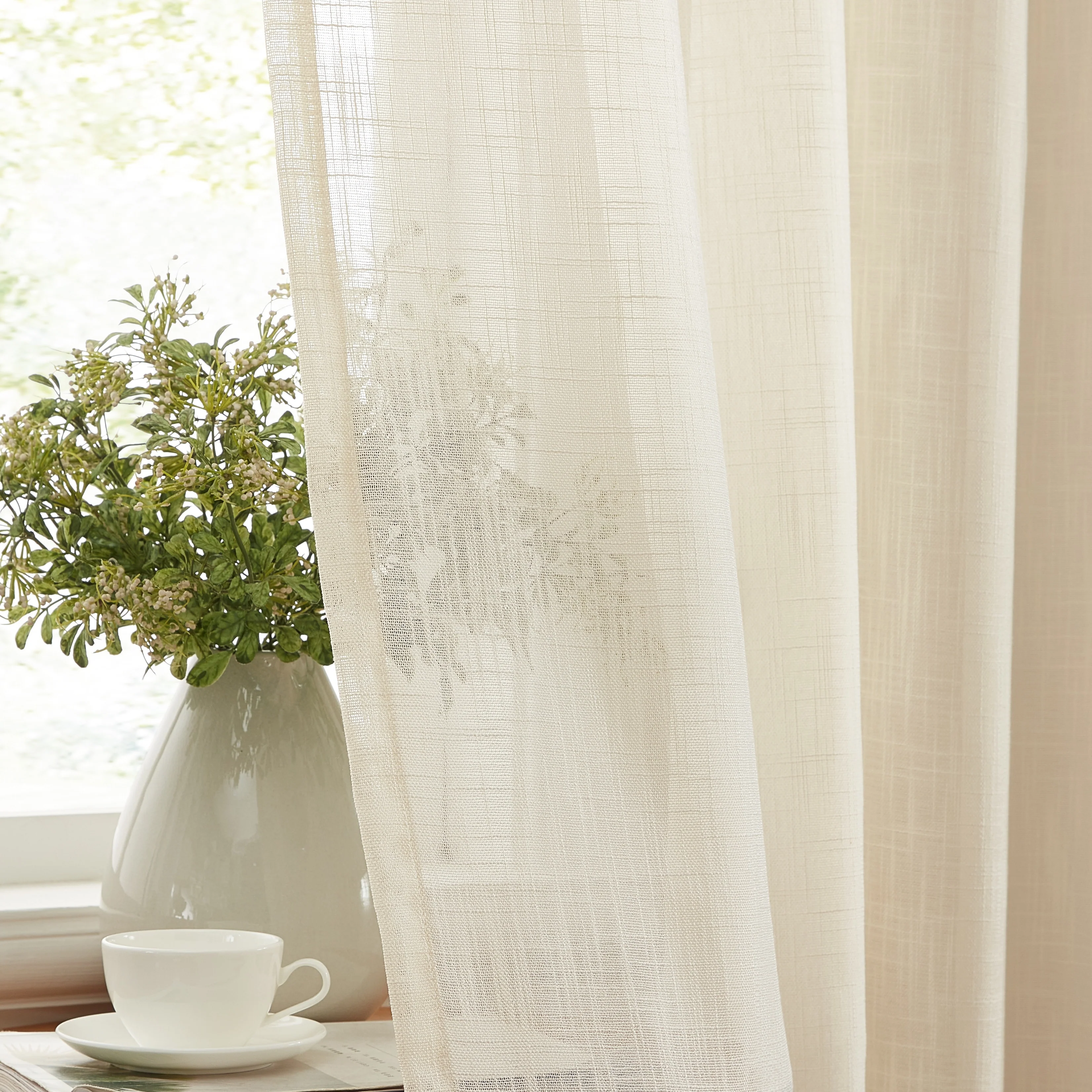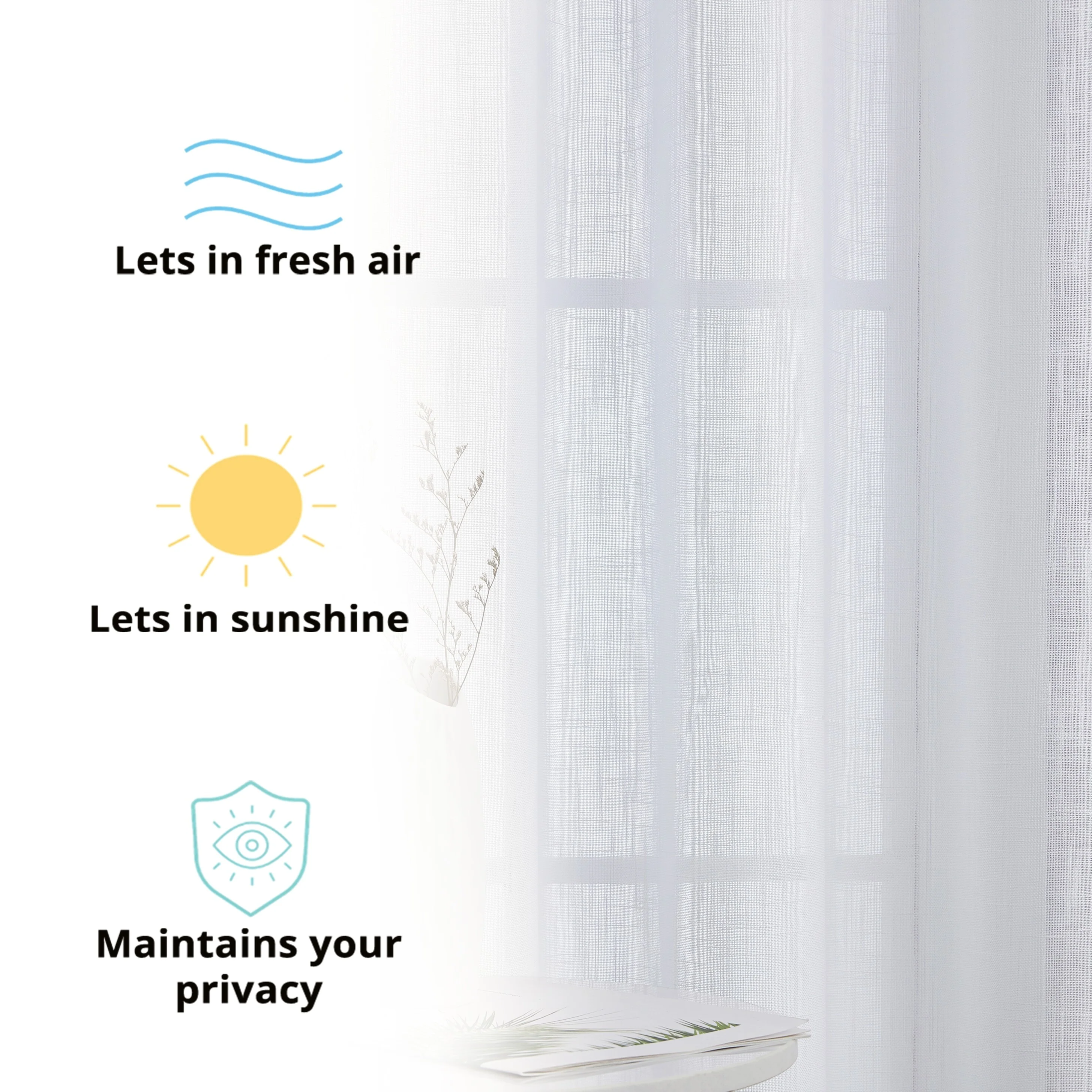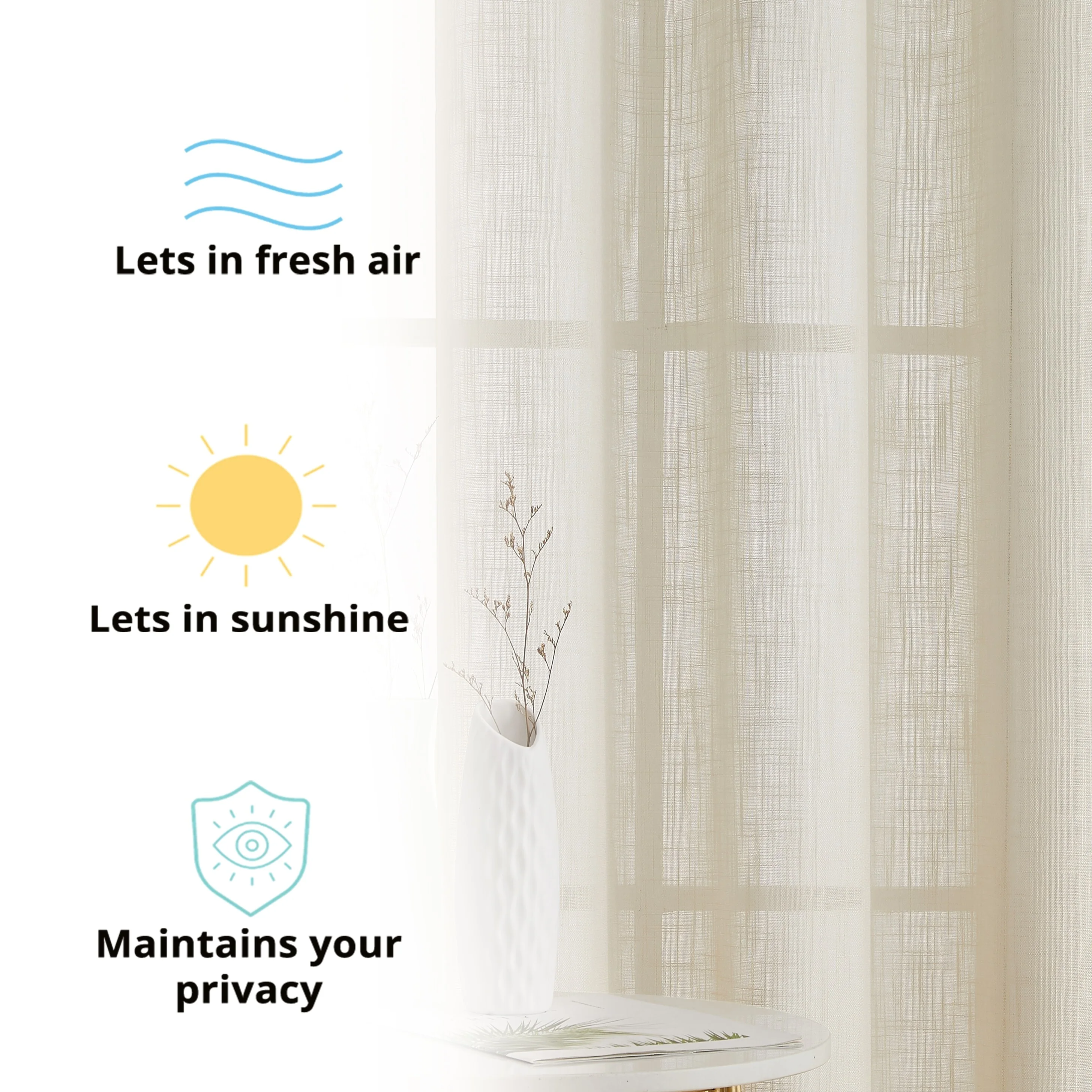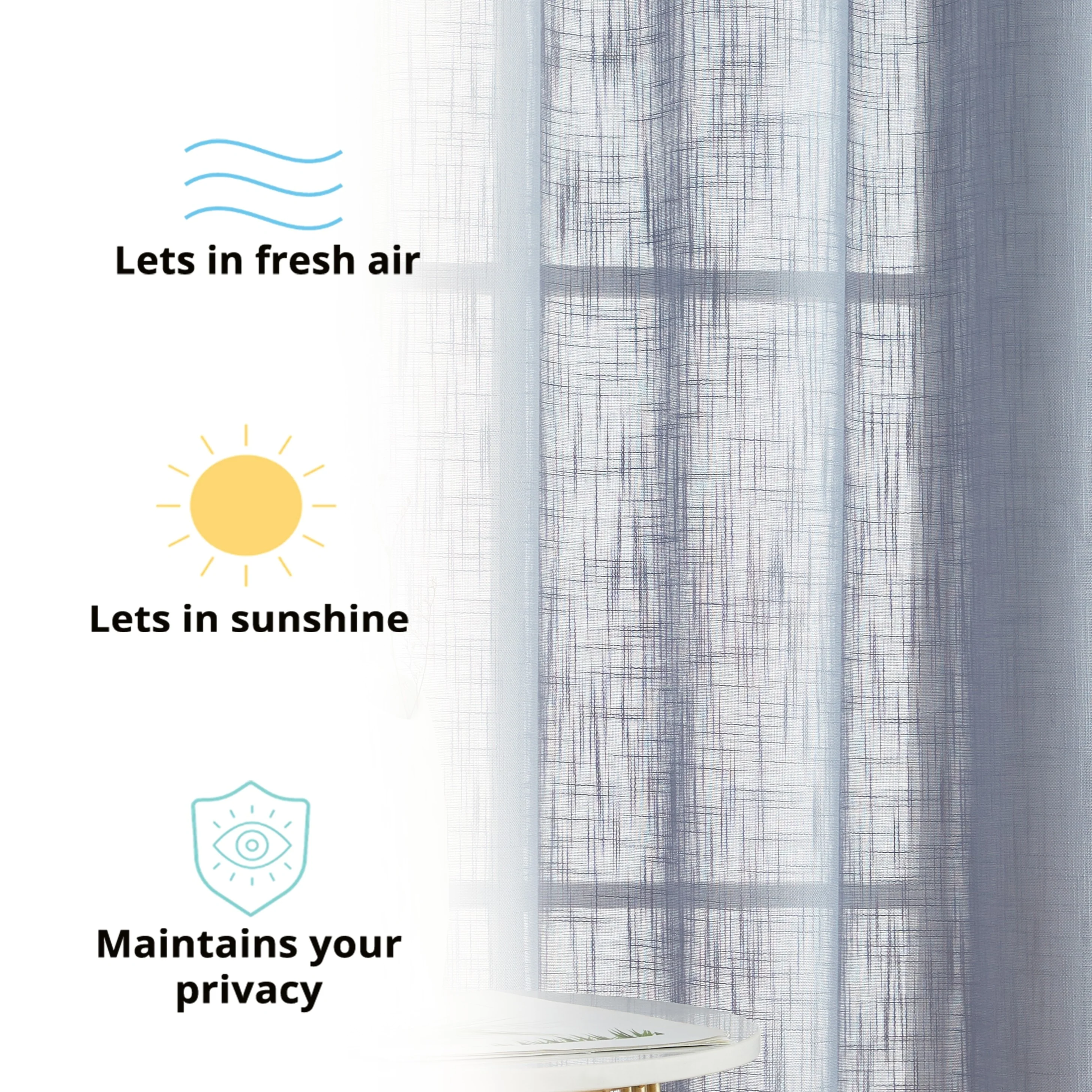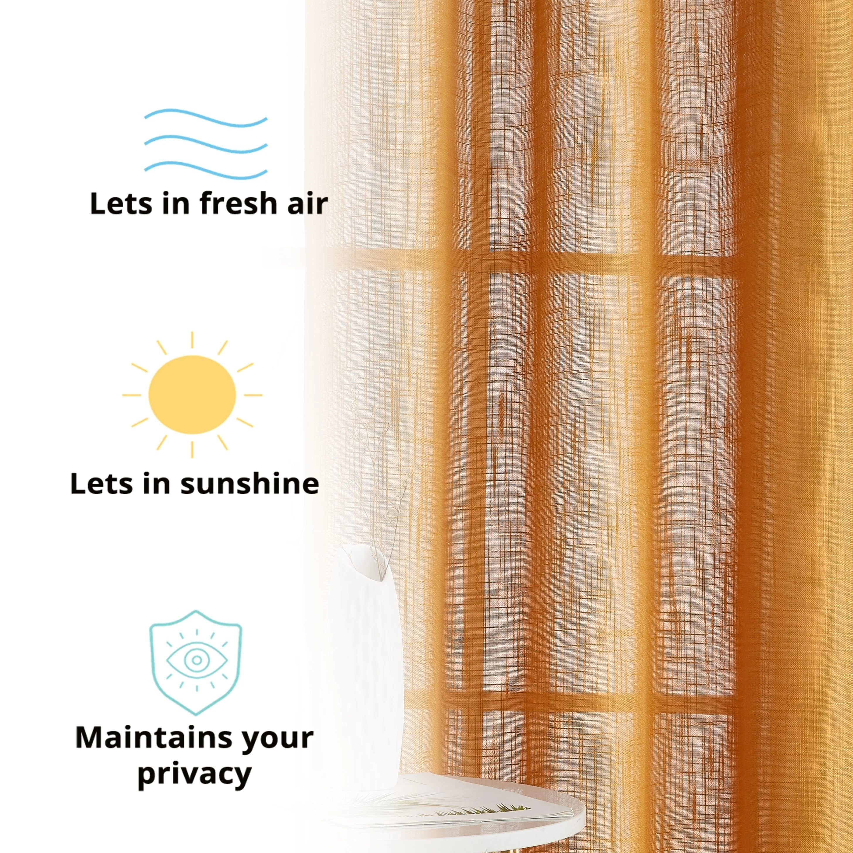 Heavy Faux Linen Textured Semi Sheer Curtain Grommet Panels will liven up your indoor or outdoor spaces with a sense of airiness and beauty. Made from solid color polyester voile. Bring elegance and class to any room with this light filtering semi sheer curtains. Our luxurious sheer grommet panels gives your home a new elegant look. Allows natural light to flow through the room. Available in 63' inches long, 72' inches long, 84' inches long, 96' inches long, and 108' inches long. For a full look use two (2) panels to cover a standard size window. This picture shows two (2) sheer grommet panels and this package contains two (2) Sheer Grommet Panels.