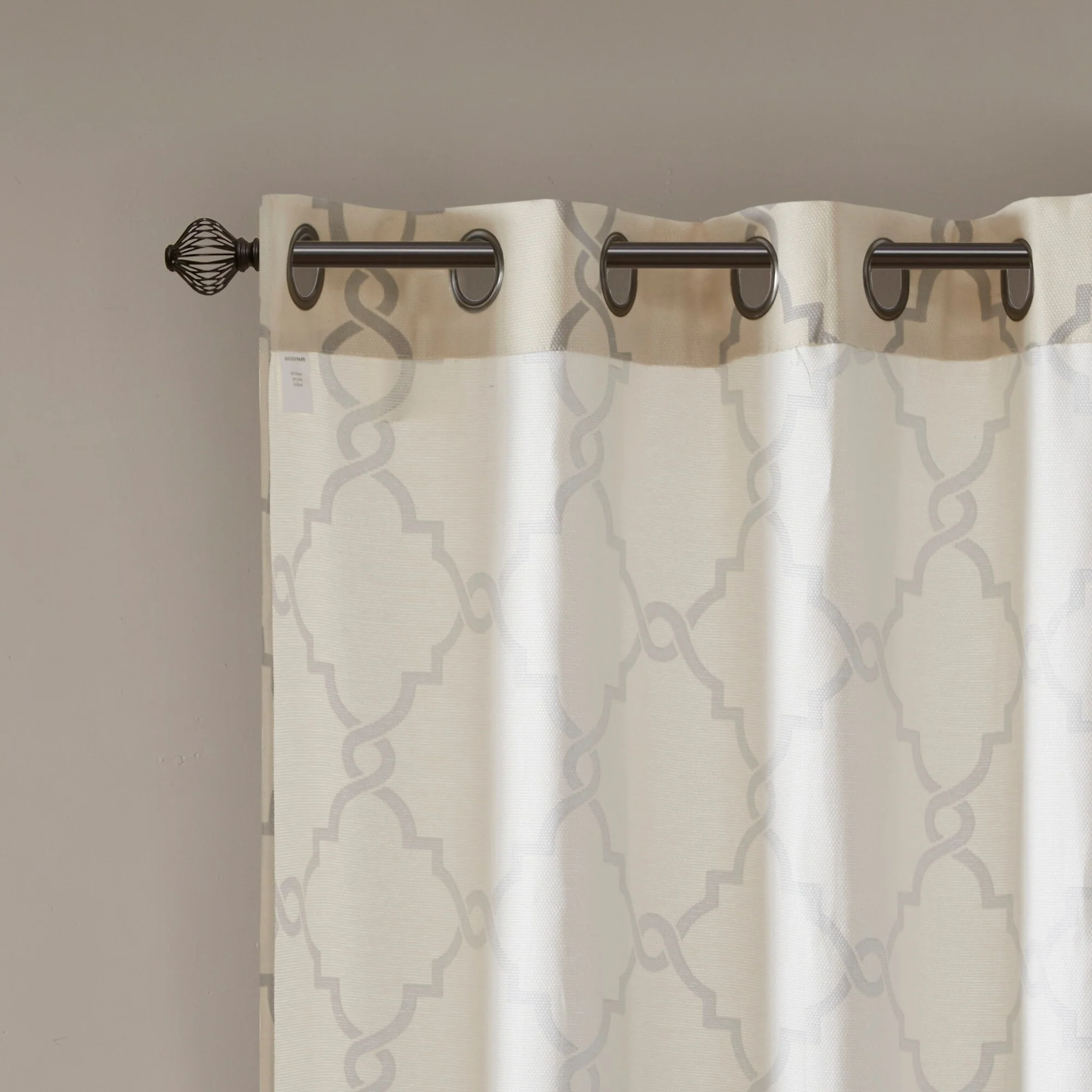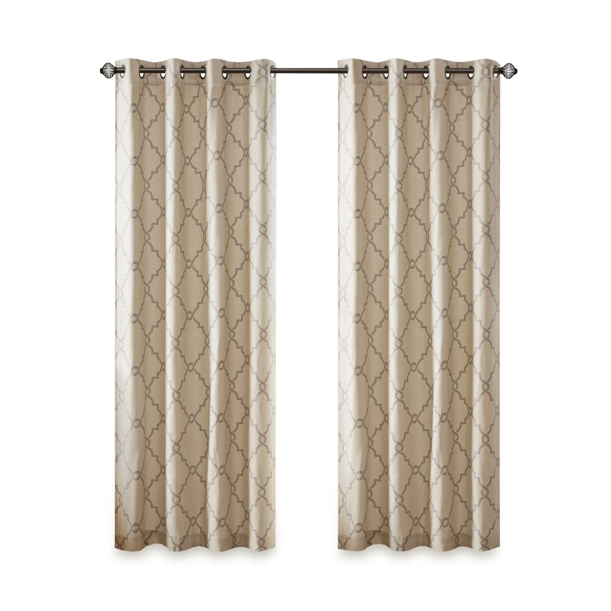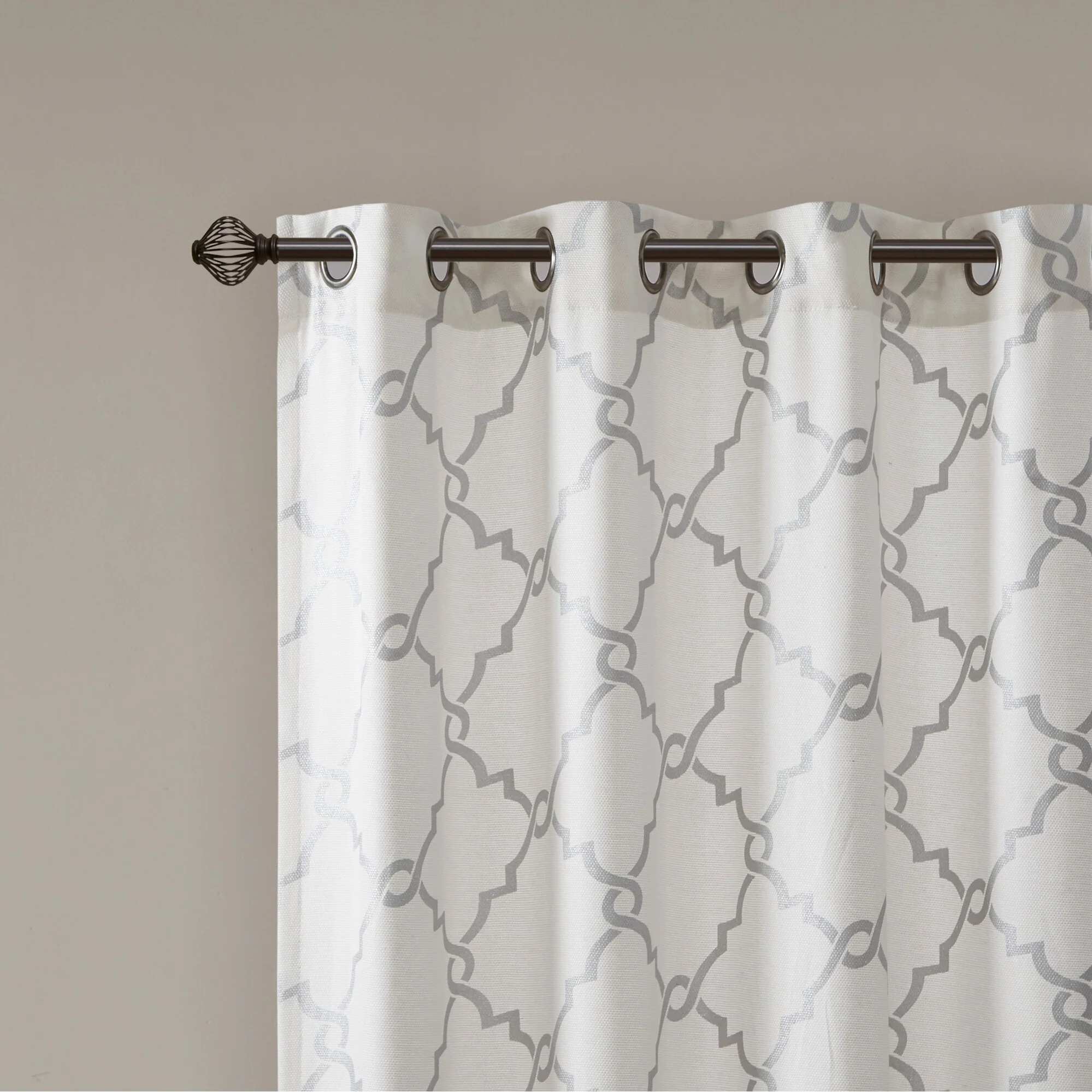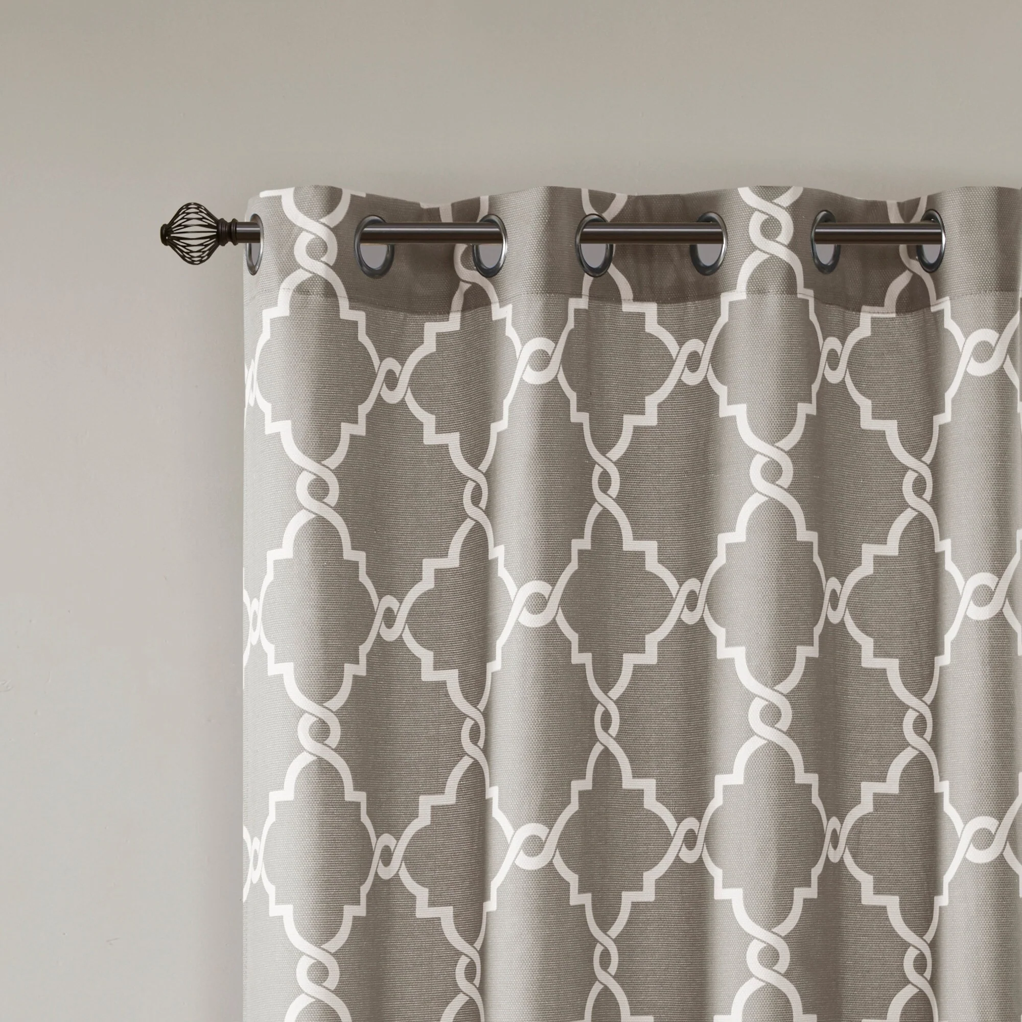 The Madison Park Saratoga Fret Print Panel is the perfect addition for a casual and stylish update to your home decor. This window panel features a trendy fretwork design, creating a simple yet modern look. The basket weave fabric softly filters the perfect amount of sunlight into your home, while providing texture for natural appeal. Gunmetal grommet top detail makes this panel easy to hang, open, and close throughout the day. Fits up to a 1.25' diameter rod. Pattern position may vary per panel due to random cutting of fabric.