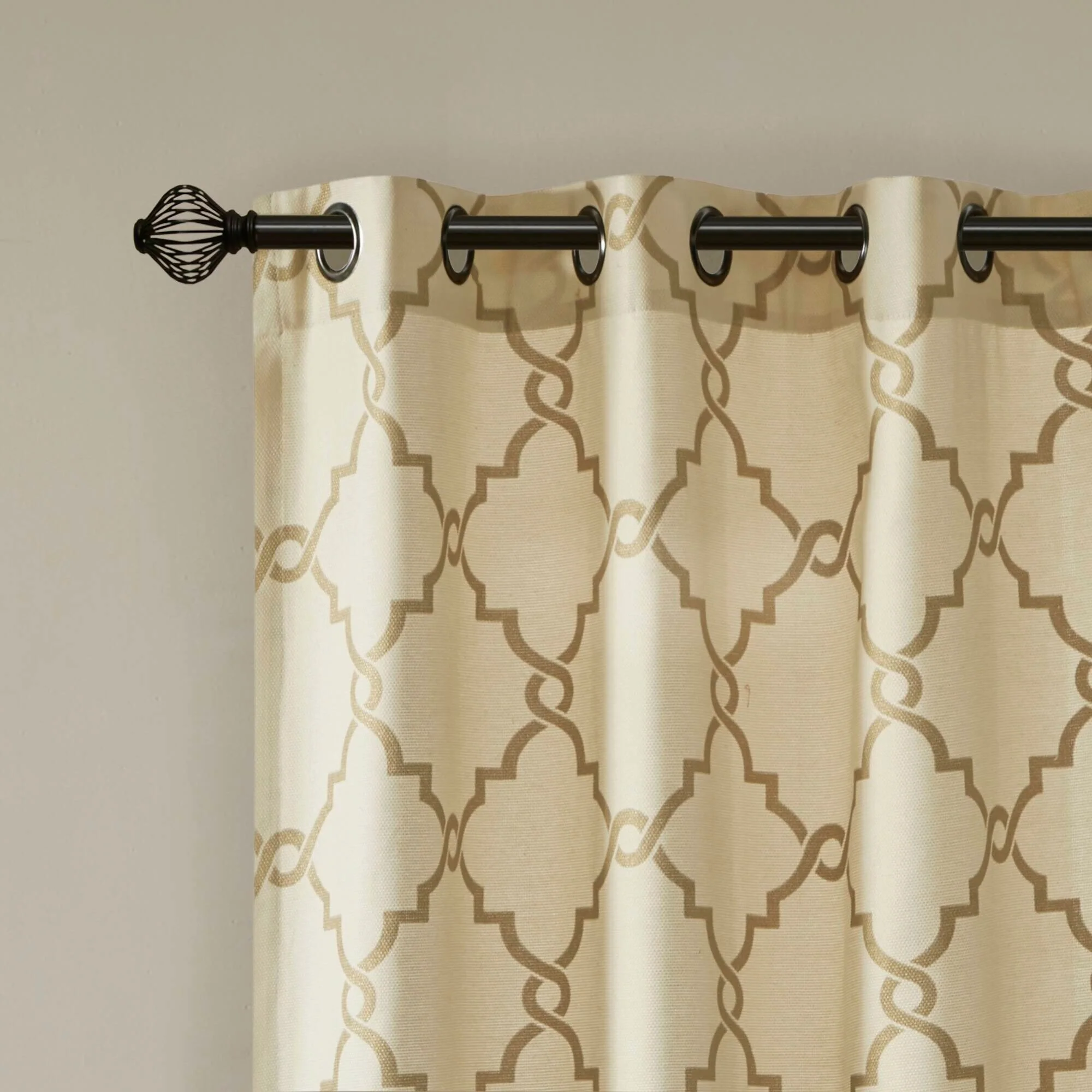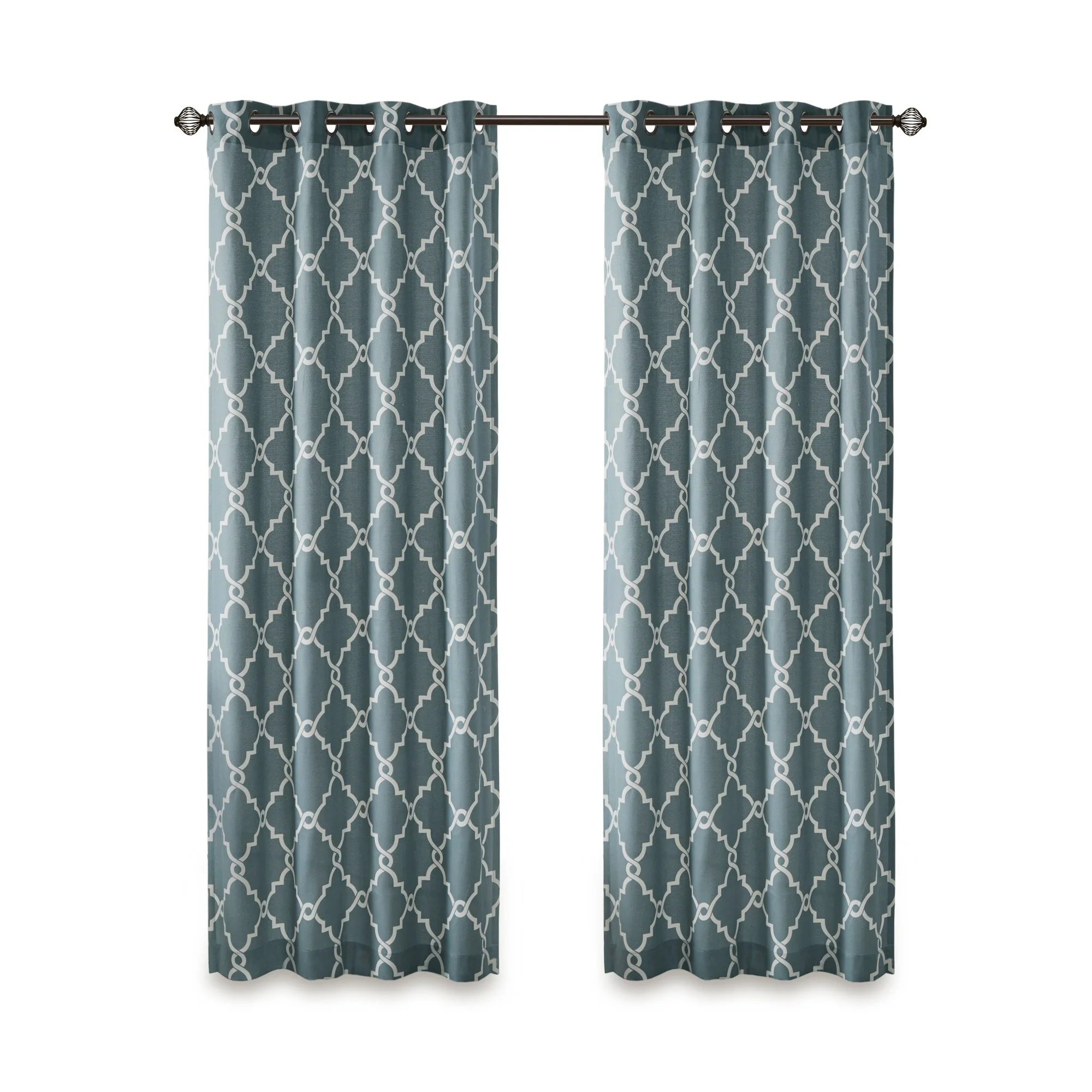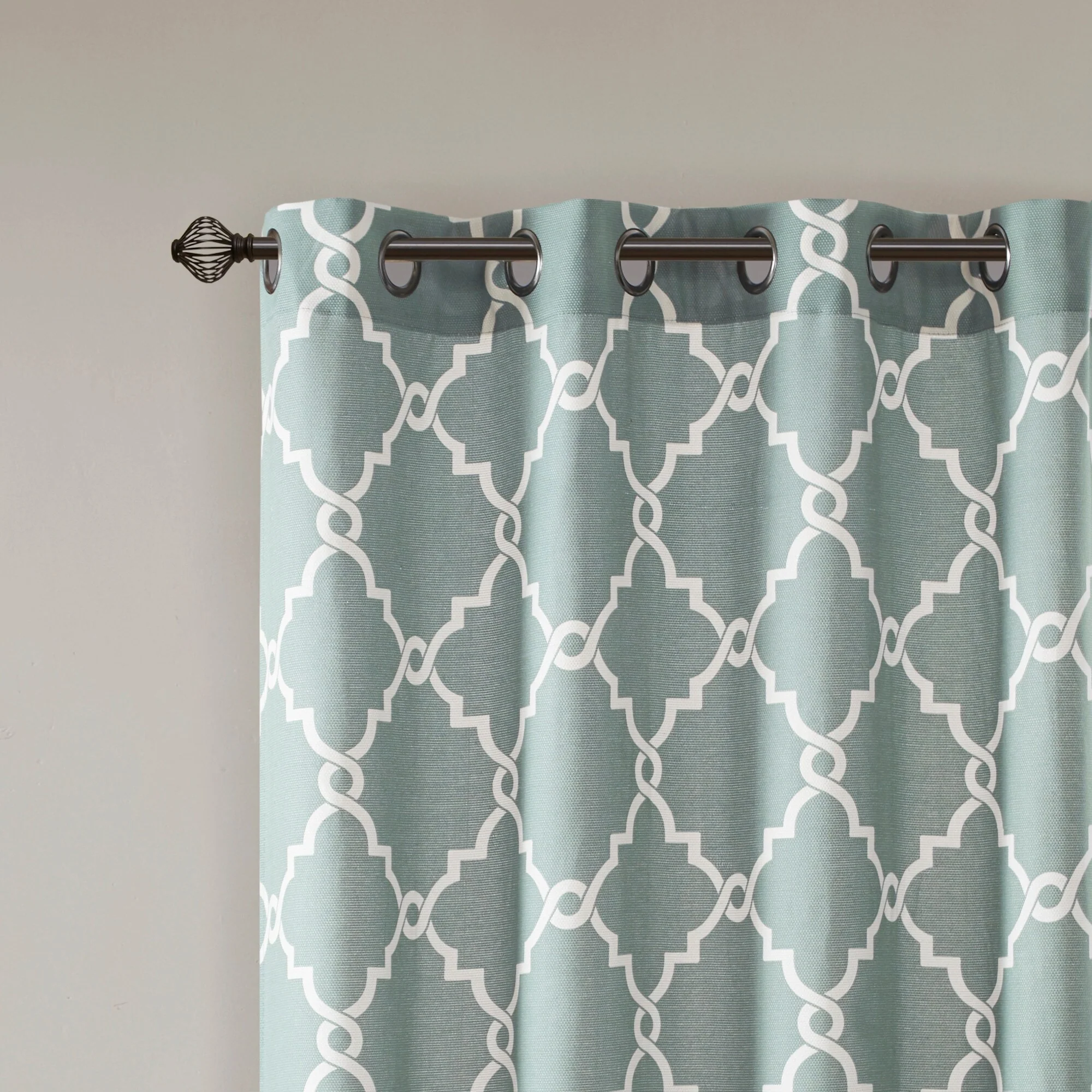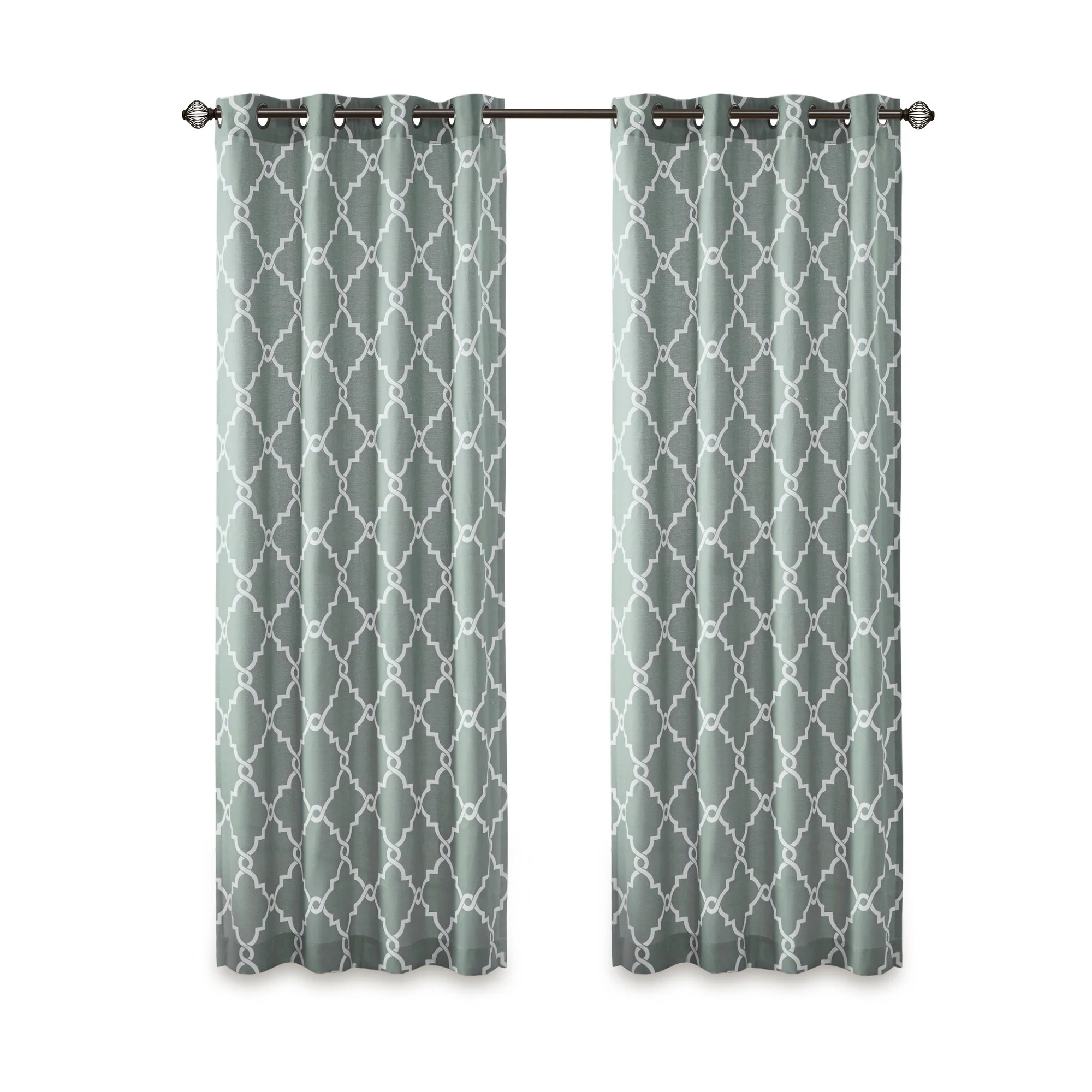 The Madison Park Saratoga Fret Print Panel is the perfect addition for a casual and stylish update to your home decor. This window panel features a trendy fretwork design, creating a simple yet modern look. The basket weave fabric softly filters the perfect amount of sunlight into your home, while providing texture for natural appeal. Gunmetal grommet top detail makes this panel easy to hang, open, and close throughout the day. Fits up to a 1.25' diameter rod. Pattern position may vary per panel due to random cutting of fabric.