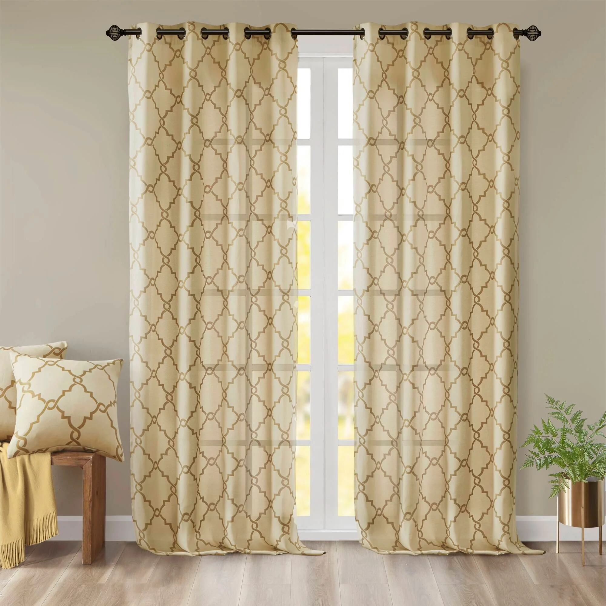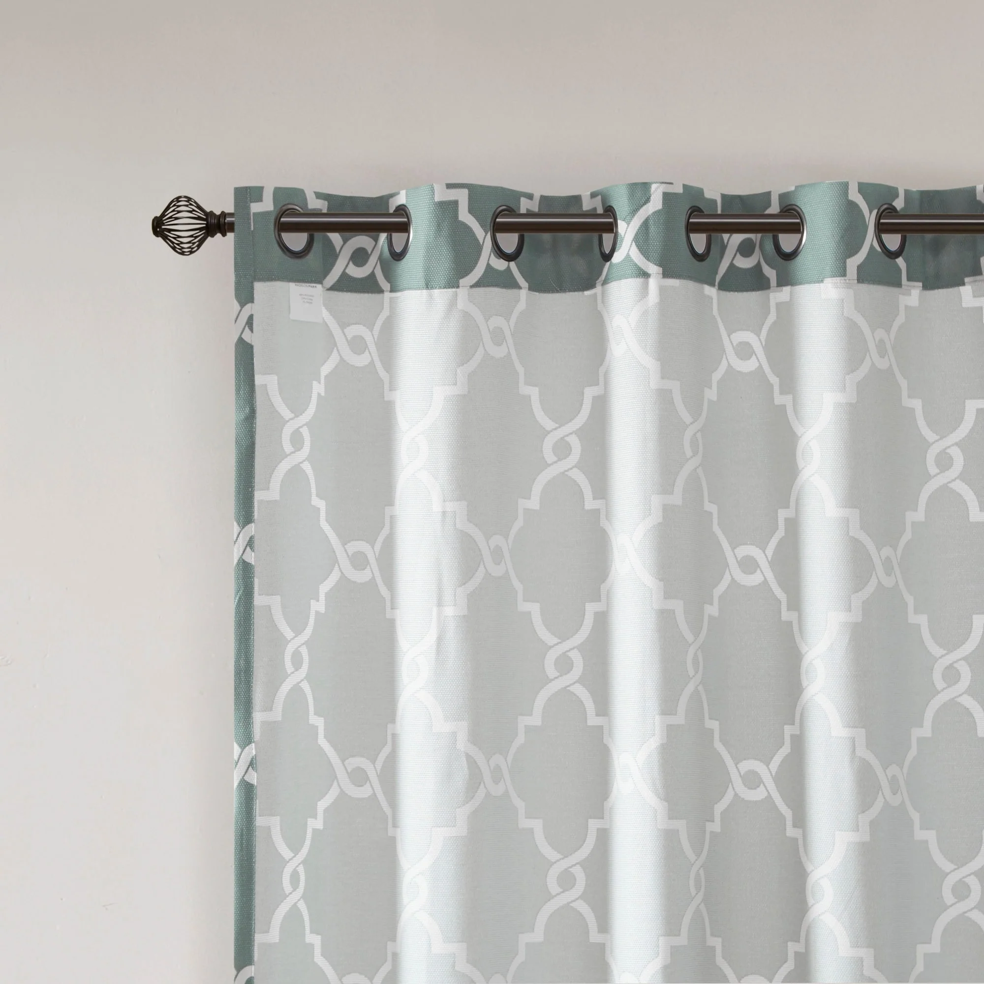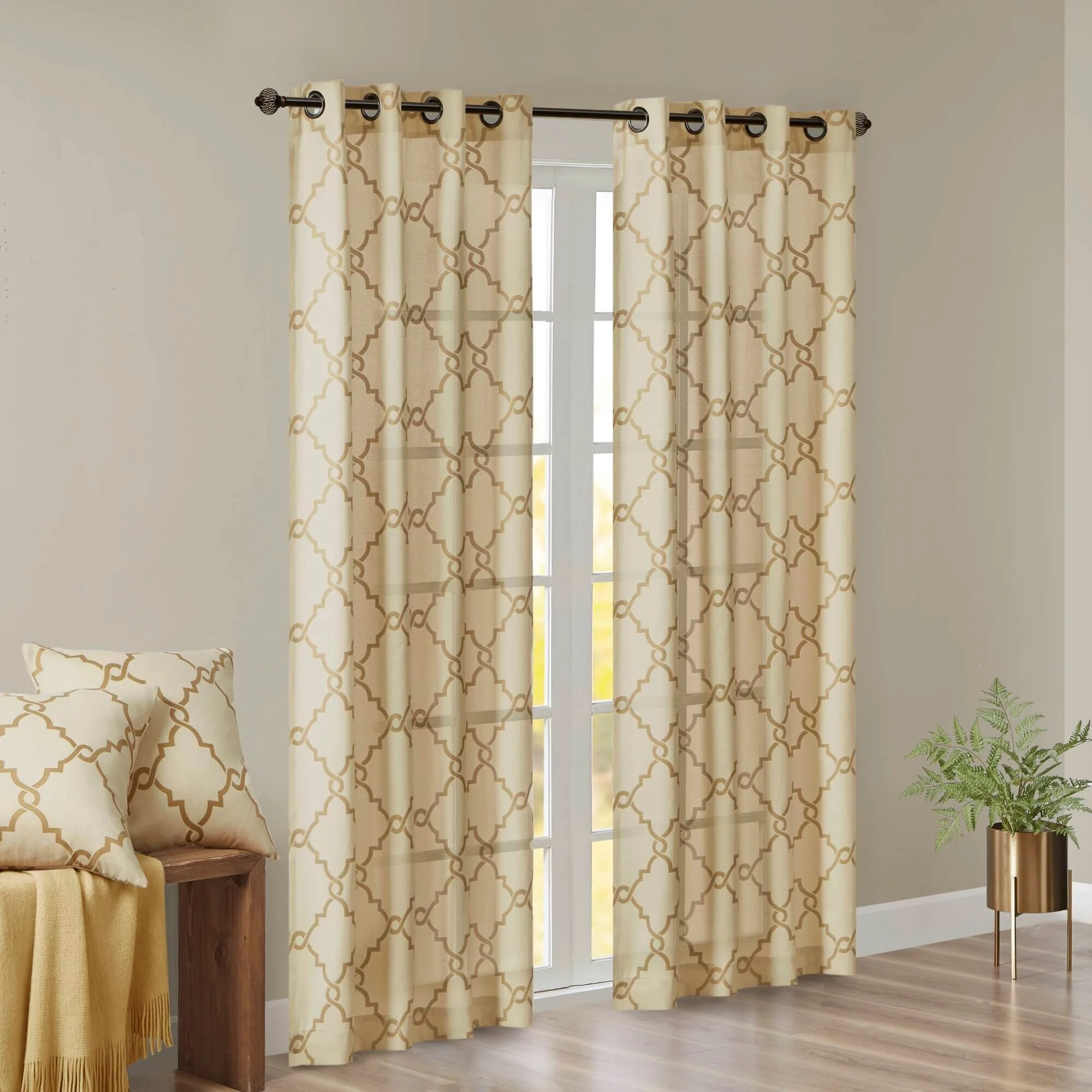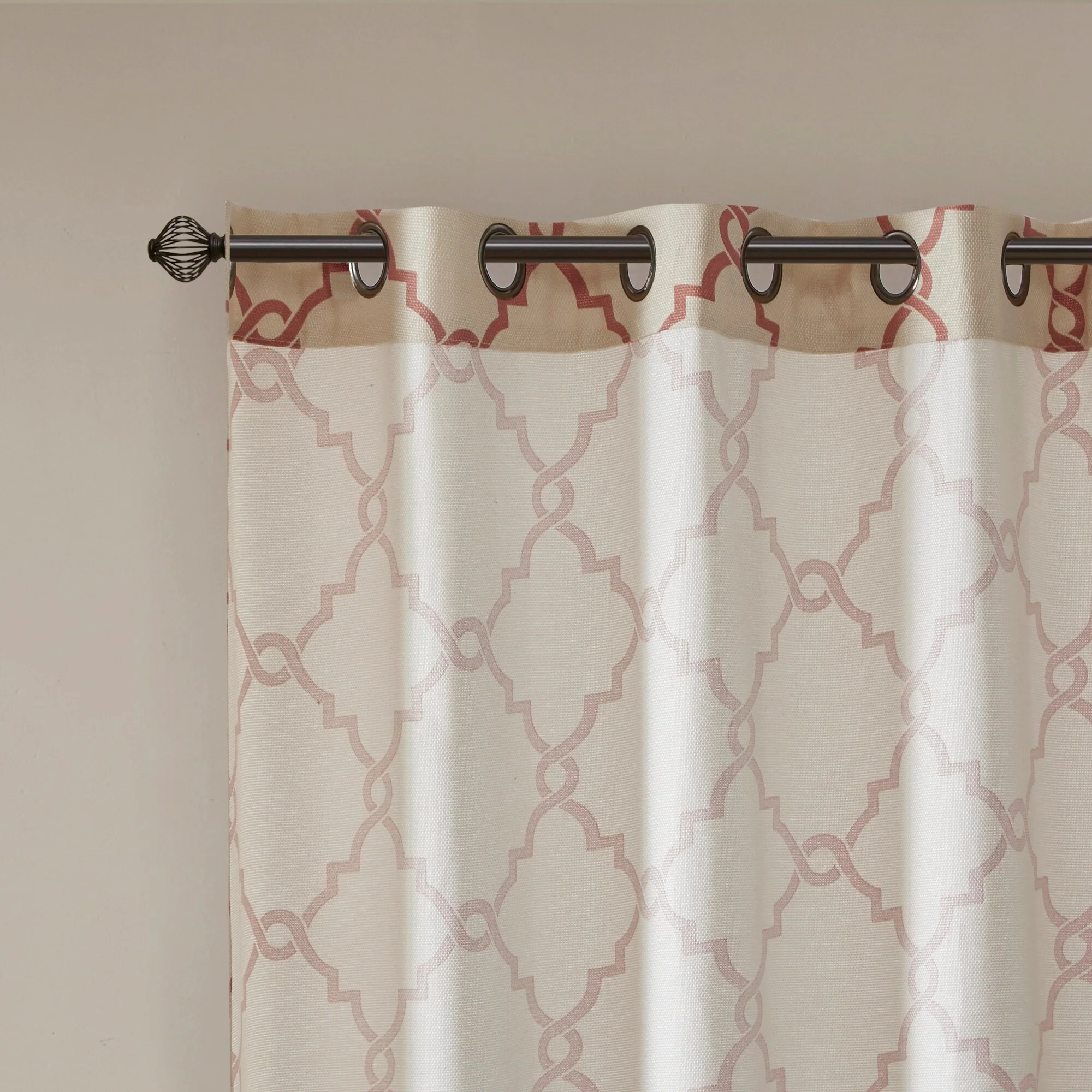 The Madison Park Saratoga Fret Print Panel is the perfect addition for a casual and stylish update to your home decor. This window panel features a trendy fretwork design, creating a simple yet modern look. The basket weave fabric softly filters the perfect amount of sunlight into your home, while providing texture for natural appeal. Gunmetal grommet top detail makes this panel easy to hang, open, and close throughout the day. Fits up to a 1.25' diameter rod. Pattern position may vary per panel due to random cutting of fabric.
