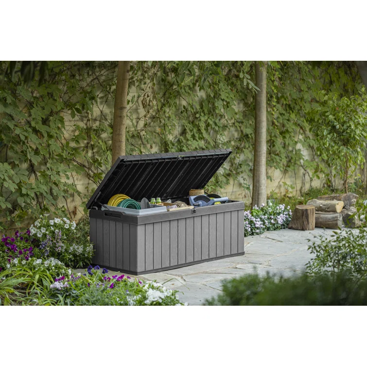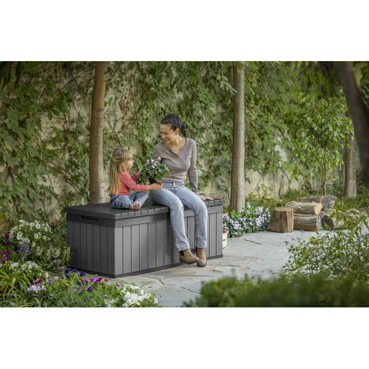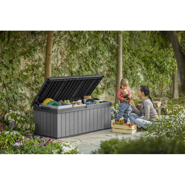 • Keter Darwin 100 Gallon Durable Resin Outdoor Storage and Organization Deck Box Ideal For Garden Patio Furniture and Supplies, Graphite