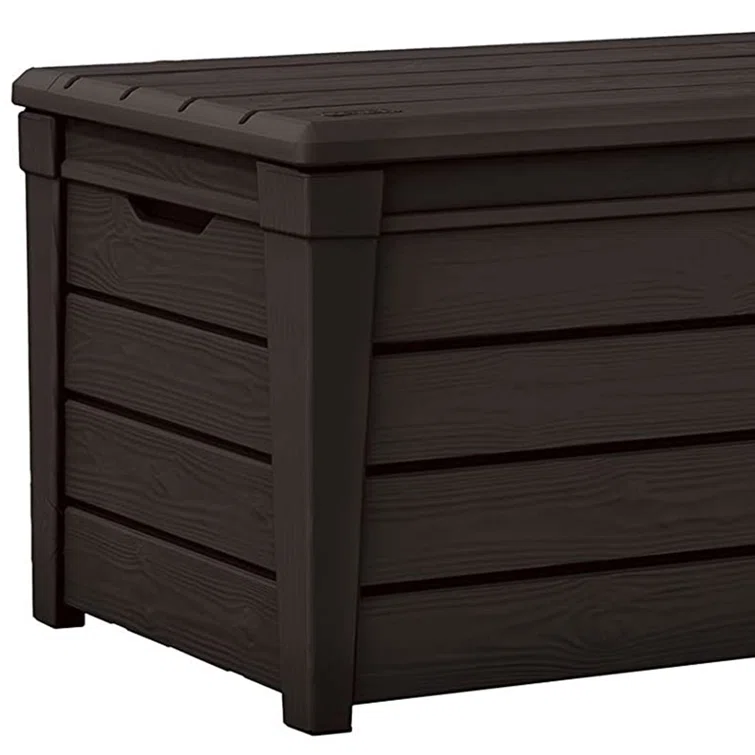 You can store various items in this 2-Pack of Keter Outdoor Storage Box and feel confident it will stay protected even in harsh weather conditions. This Keter 120-gallon deck box is designed for functionality and durability.Not only does the outdoor storage container stay strong during all types of weather it's also maintenance-free, so you can assemble it without worrying about the upkeep. The large interior capacity of 120 gallons is perfect for storing large cushions, garden equipment, pool supplies, and more. These storage benches include a lockable feature to keep your items inside safe and secure (padlock not included).You can comfortably seat 2 adults allowing this storage box to double as a patio bench seating solution holding up to 804 pounds. With the stylish wood panel finish, this storage bench fits in with any outdoor theme or patio decor that does fade in the sun. The automatic opening system allows easy access to your contents inside. Store all your pool and outdoor supplies with the 2-Pack of Keter Brightwood 120-Gallon Storage Deck Box.