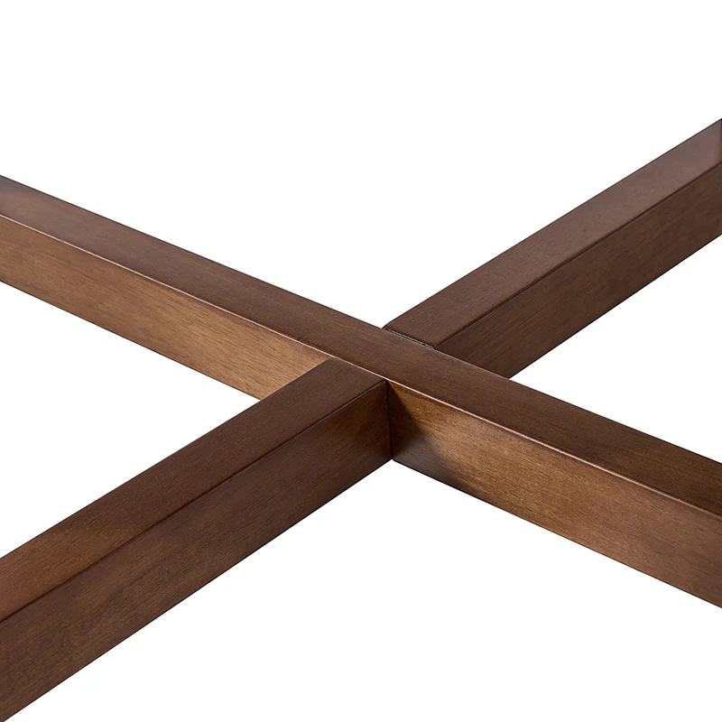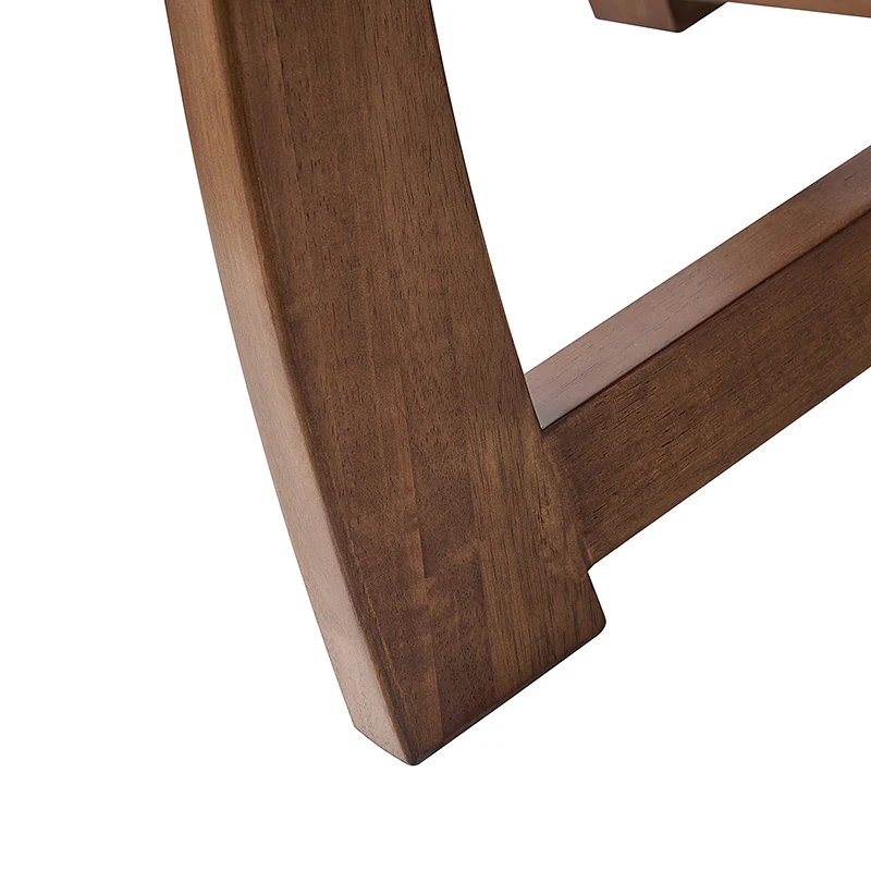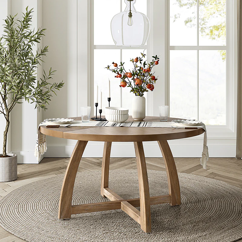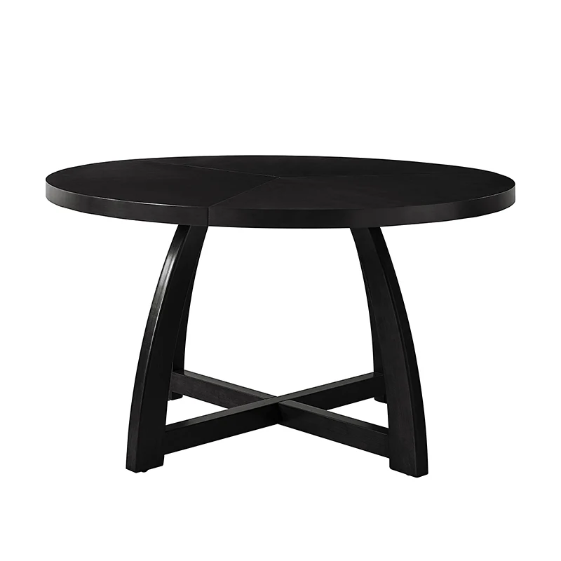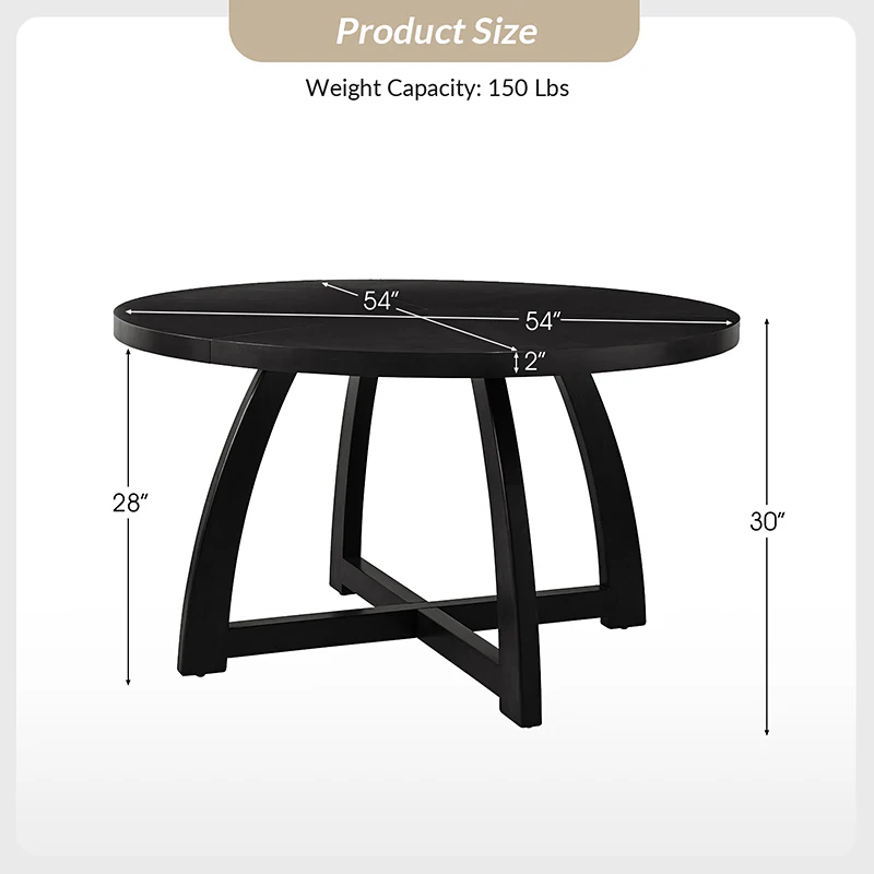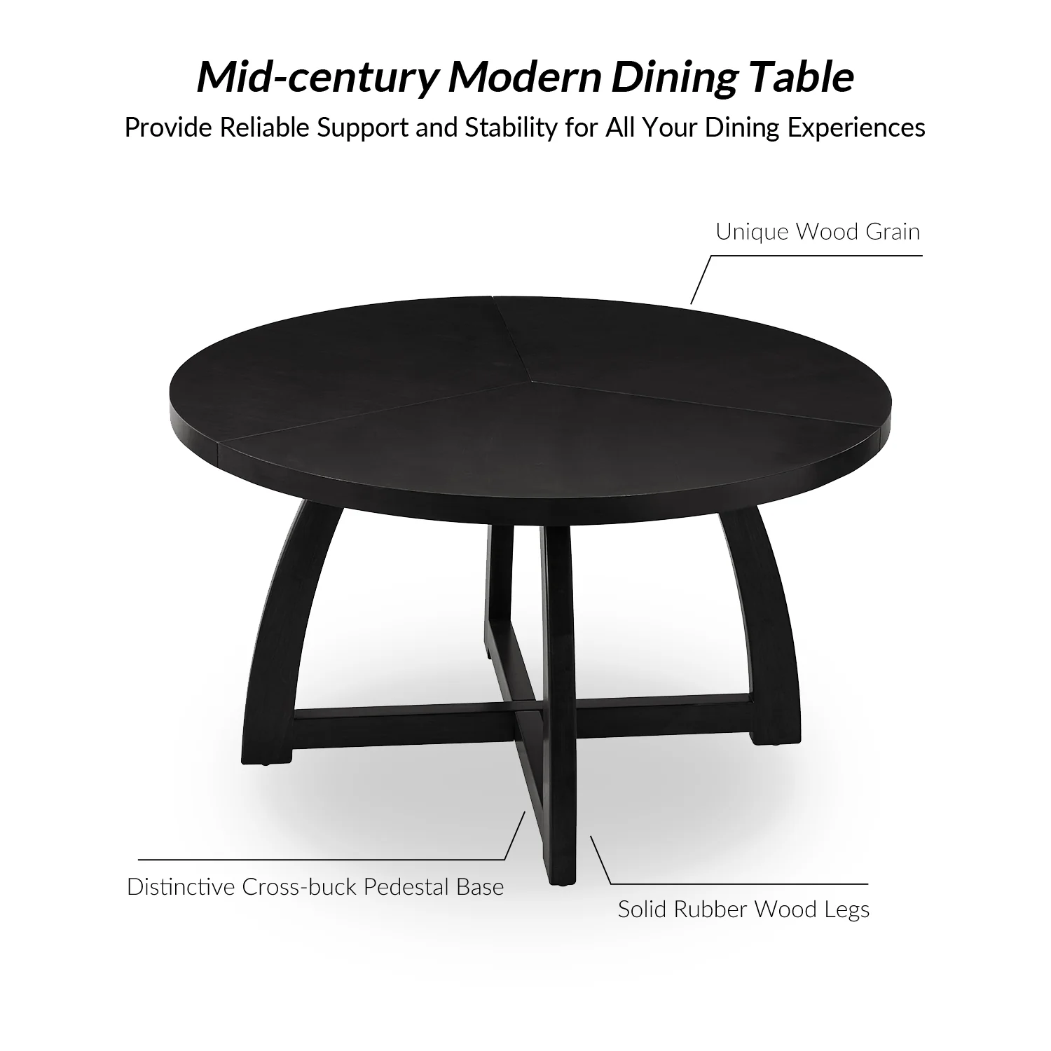 This mid-century modern dining table exudes elegance and functionality. With a generous 54-inch diameter, it comfortably accommodates 5-6 people, making it perfect for gatherings. Its tabletop features a solid wood veneer with a classic antique brown shade that instantly catches the eye. The table top is crafted from premium wood veneers and precision-engineered wood, while the table base is skillfully constructed using solid rubber wood. The distinctive cross-buck pedestal base of the round dining table is beautifully on-trend. A tabletop with a touch of wood grain detail makes the most of the natural variation of the wood. Whether you're hosting a contemporary dinner party or a traditional family meal, this dining table is the ideal centerpiece, blending timeless appeal with mid-century practicality.