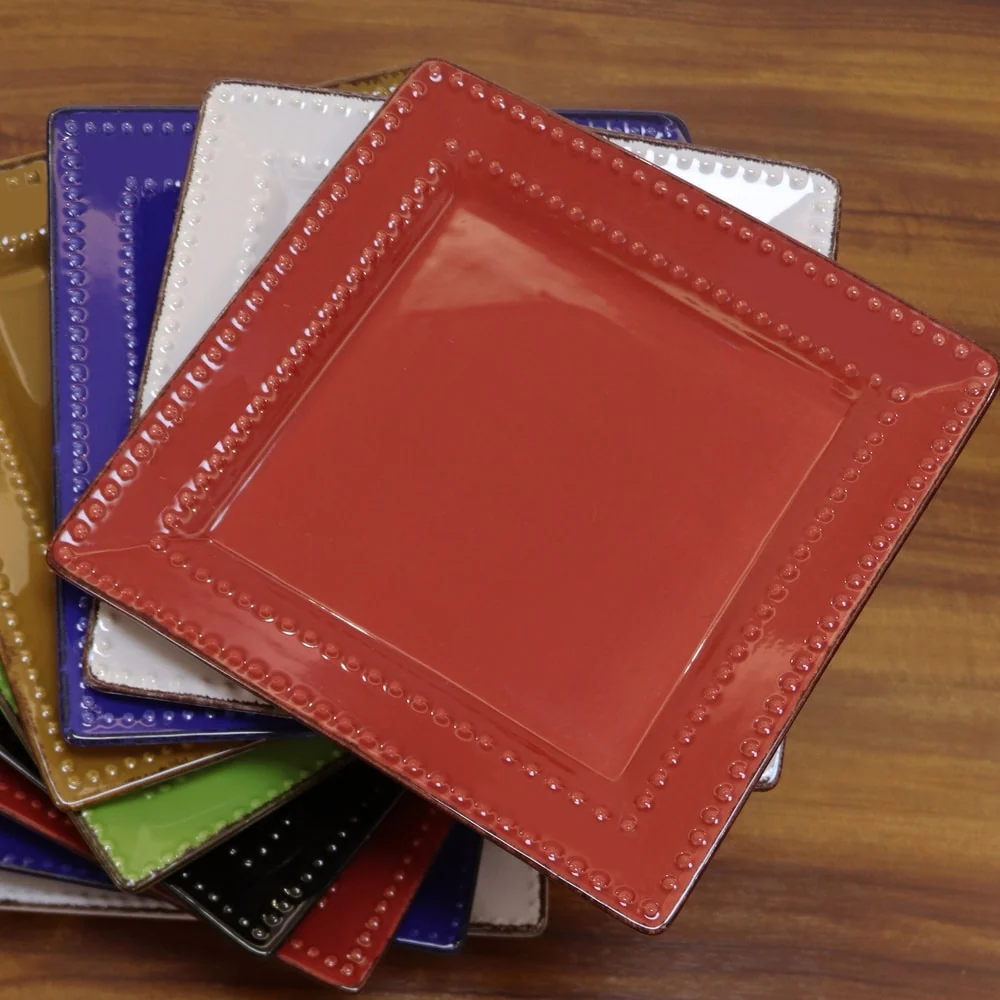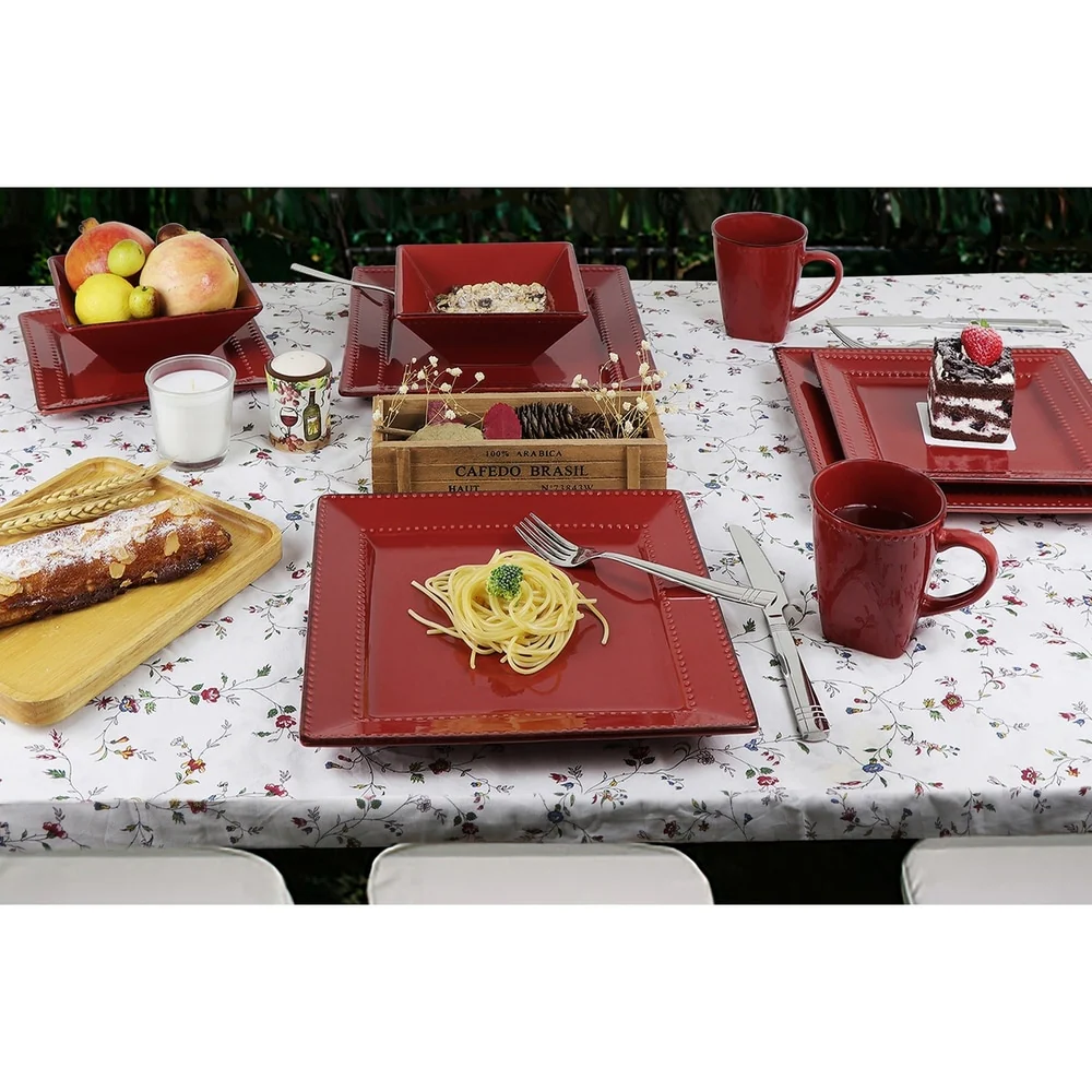 Make a statement with this 16 Piece Square Beaded Stoneware Dinnerware Set by Lorren Home Trends in a striking shade of red. The double beaded border design with a brown trim creates a modern and classy look. Crafted from sturdy and durable stoneware, this set is perfect for adding color and style to your table settings. The square shape adds a touch of sophistication. This set includes 4 dinner plates, 4 soup bowls, 4 salad plates, and 4 mugs, making it perfect for entertaining. Dishwasher and microwave safe for easy cleanup and convenience.