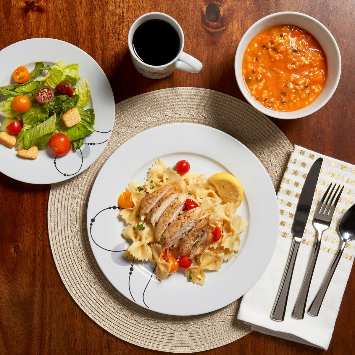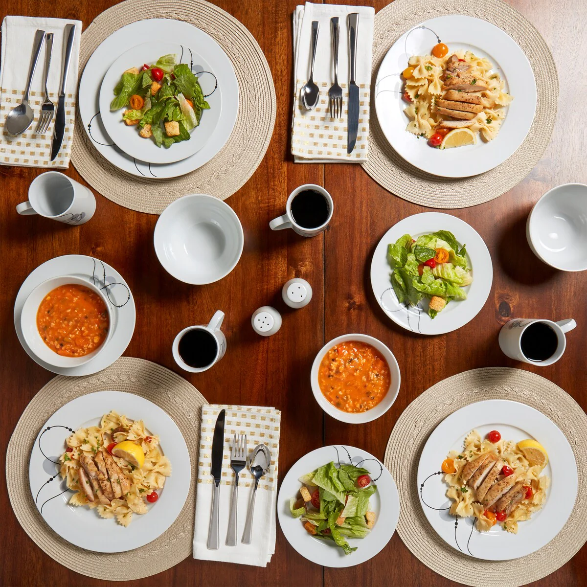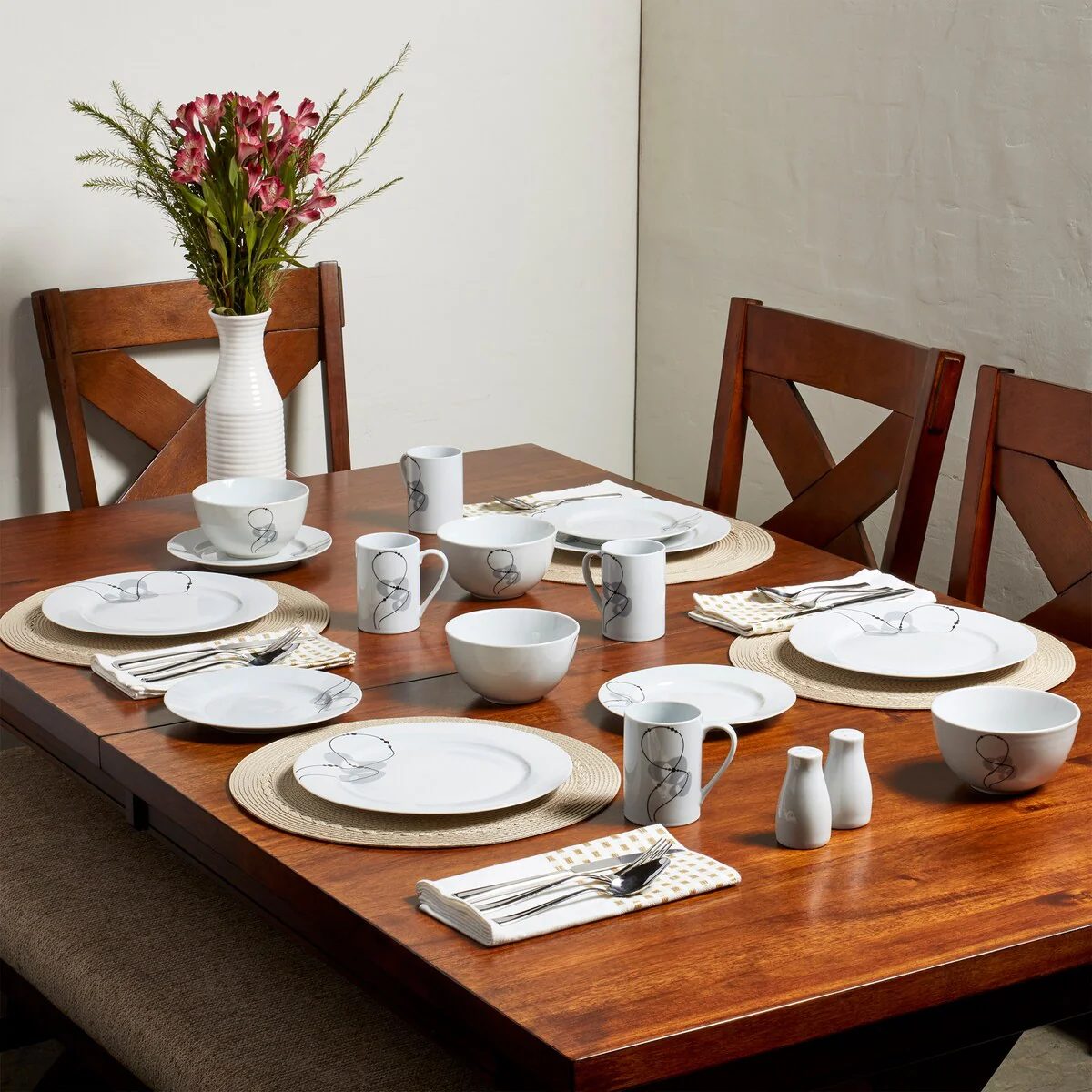 White porcelain Mother Nature's way (no unnatural whiteners or additives). This Jacqueline Porcelain Round Dinnerware Set is perfect for your healthy casual lifestyle. Made from white porcelain as nature intended - with no whitening agents or metal-based color additives, it exceeds Prop 65 and FDA standards. Jacqueline is strong enough for everyday use, yet fashionable enough for casual dining and entertaining. Classic round bodies showcase fresh contemporary Style pattern design for a touch of class that complements any table setting and presents beautifully.