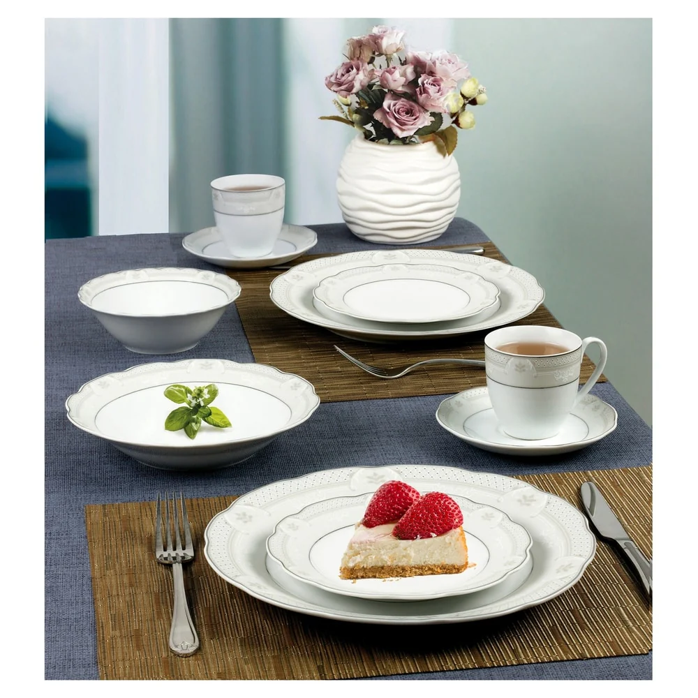 24 Piece Wavy Edge Porcelain Ivory designed border with gold Trim Dinnerware set, service for 4. Dishwasher safe. Durable porcelain great for everyday use of fine and elegant enough for special occasions. This set comes complete with everything you need to set your table including serving pieces. Set Includes: 4-10.5' Dinner Plates, 4-Soup Bowl, 4-Salad/bread and butter dishes, 4-Tea Cups, 8-Tea Saucers, 4-Fruit or Dessert bowls. Dishwasher Safe: China Setting.