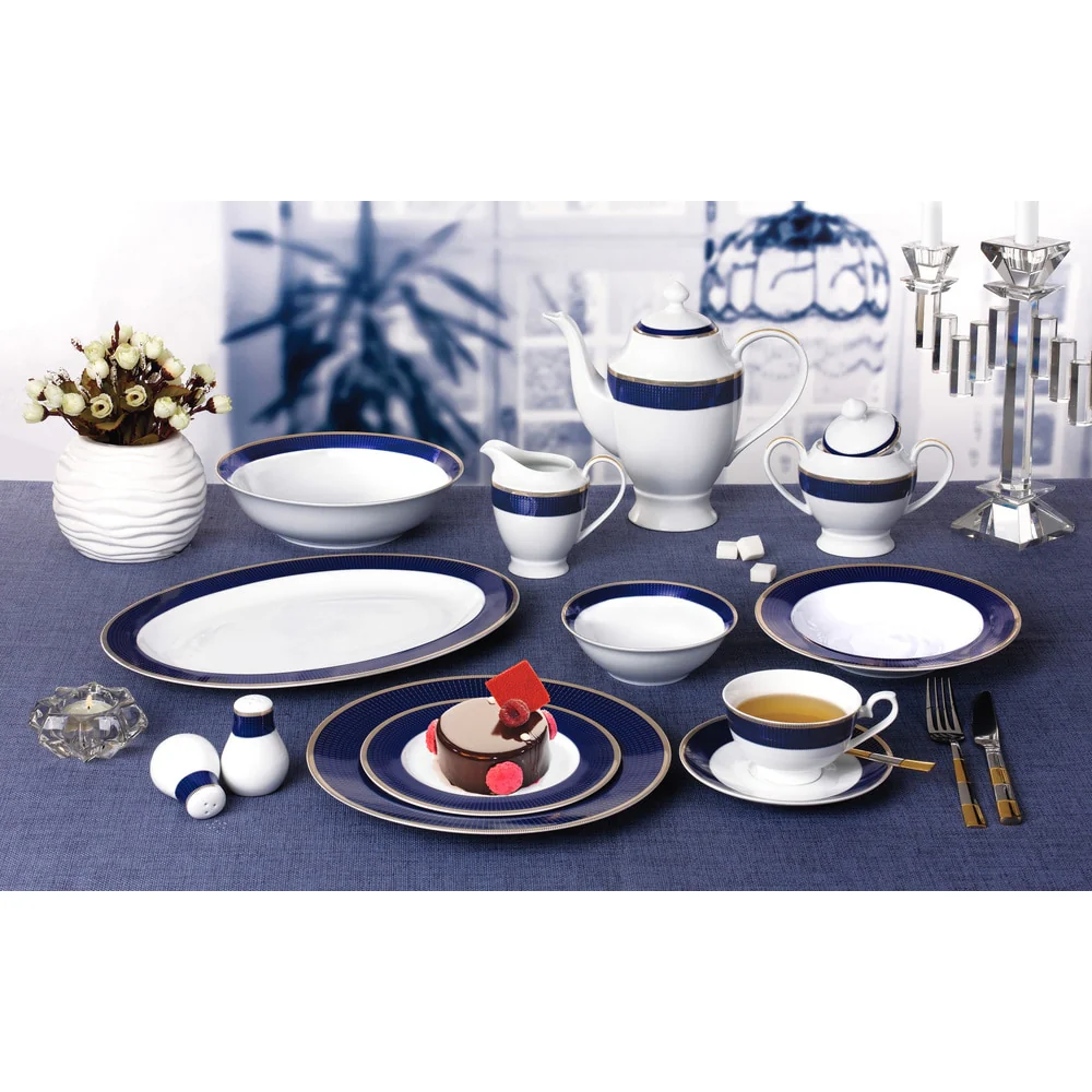 Impress your guests and elevate your dining experience with this stunning 57-piece bone China dinnerware set in midnight blue and gold. Perfect for hosting dinner parties, this set includes everything you need for service for 8 people. Crafted with the highest quality bone China and porcelain, this set is oven safe up to 350 degrees and features luxurious banded navy and gold patterns that add sophistication to any table setting.