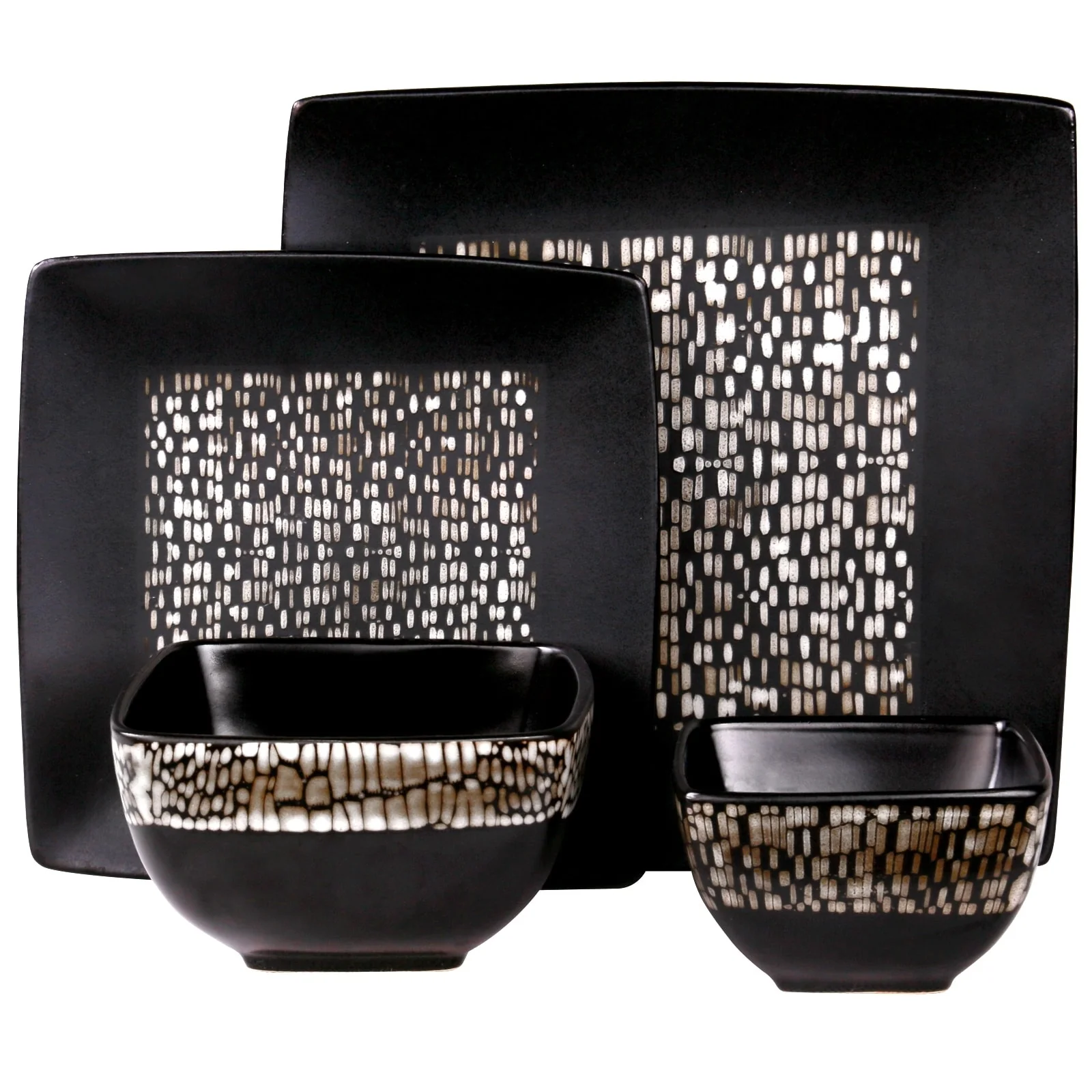 16 Piece Double Bowl Stoneware Dinnerware Set brings a truly stunning modern accent to your table with its unique pattern and texture. The high gloss finish of the inner areas of in this luxurious set along with a matte muted outer feel will tantalize your sense of touch while you savor your delicious fare. This set provides both harmony and contrast of the old world and the new with a subtle yet strong pattern and bold colors. Whether you are dining alone, or staging a luxurious night of glitz and glamour for guest, this set will add just the right touch of modern style. Four Dinner Plates 14.5 x 14.5 x 0.75 2.4lbsFour Plates 11.25 x 11.25 0.75 1.40lbsFour Bowls 7.25 x 7.25 3.25 1.36lbsFour Soup Bowls 5.75 x 5.75 x 2.75 0.11oz