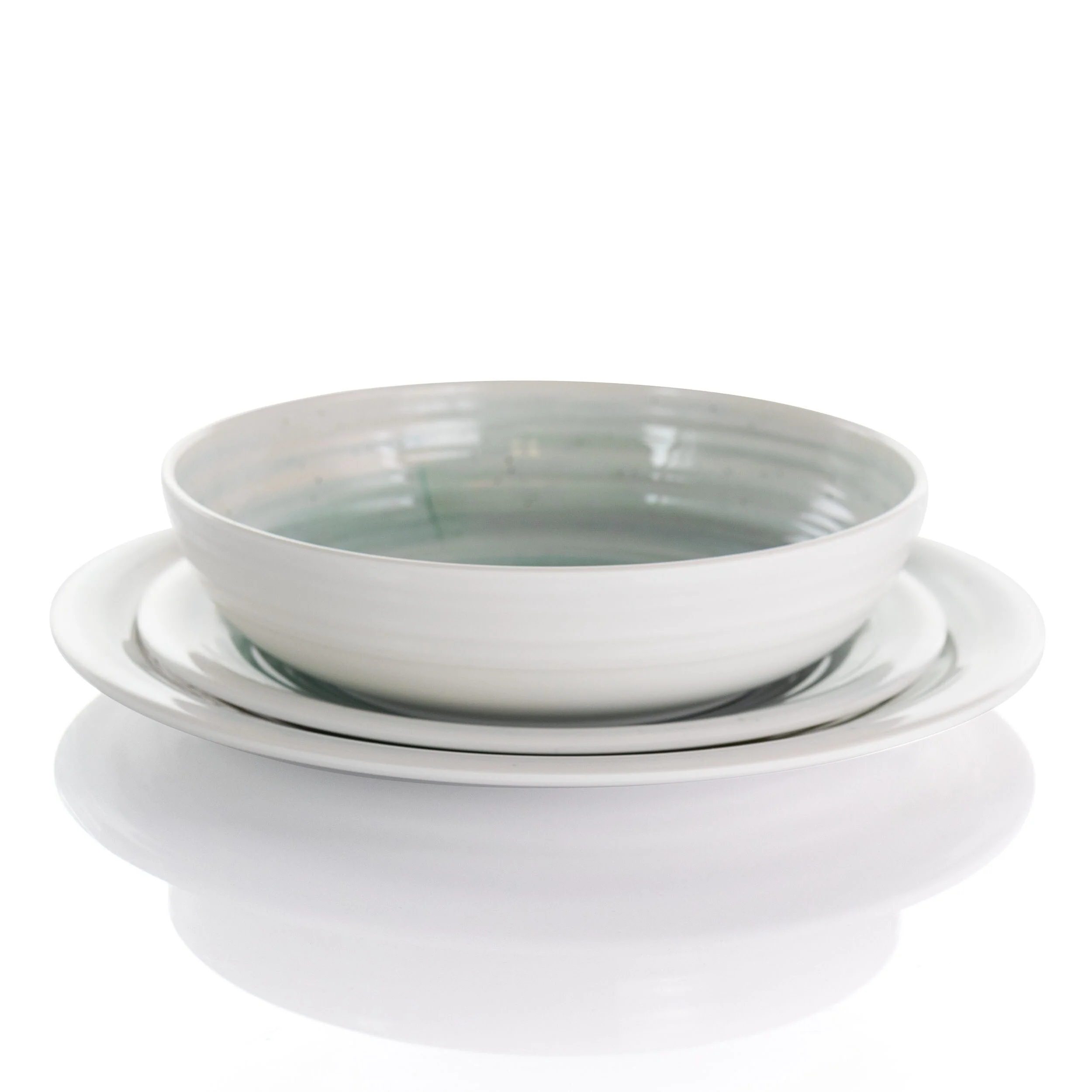 Elevate your dinner table with the Elama Potters Wheel 12 Piece Lightweight Melamine Dinnerware Set in Light Blue. The set showcases a natural speckled and swirled design, resembling a hand-spun style with a pop of light blue in the center. The ribbed texture on each plate helps keep food in place, while the shatter-resistant melamine construction ensures easy handling. Perfect for outdoor gatherings, this set is dishwasher safe (top rack only) but not microwaveable.