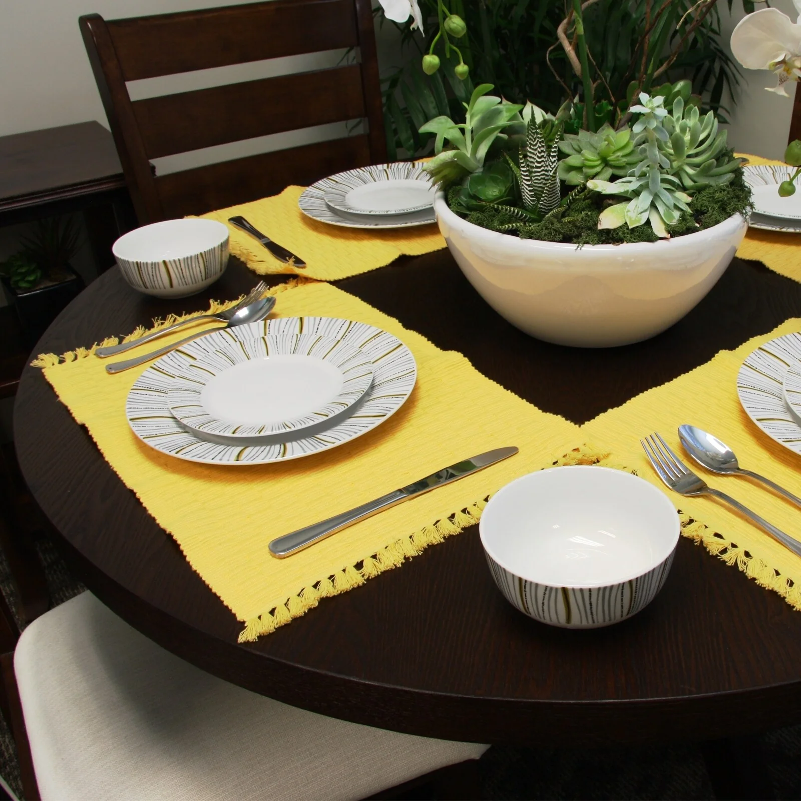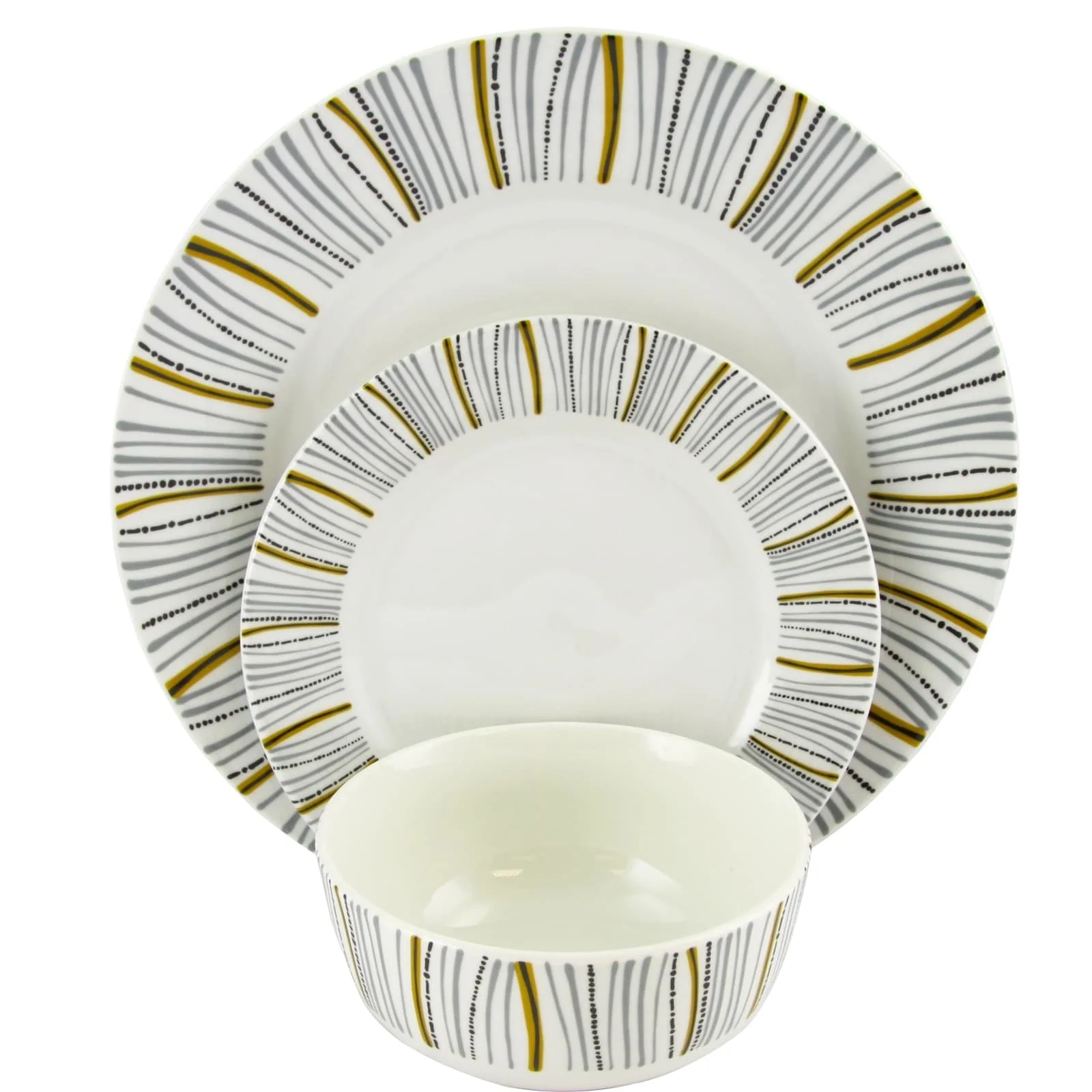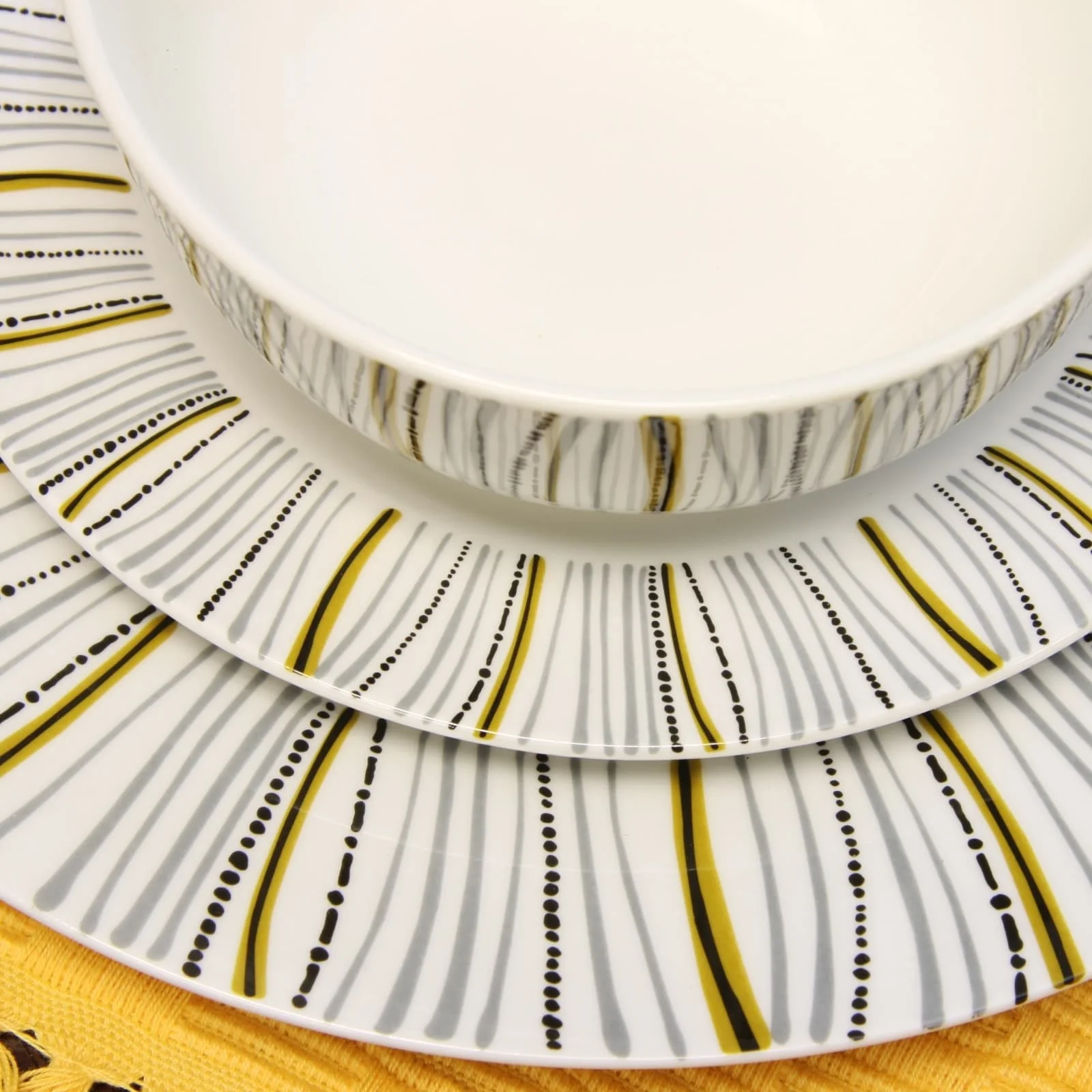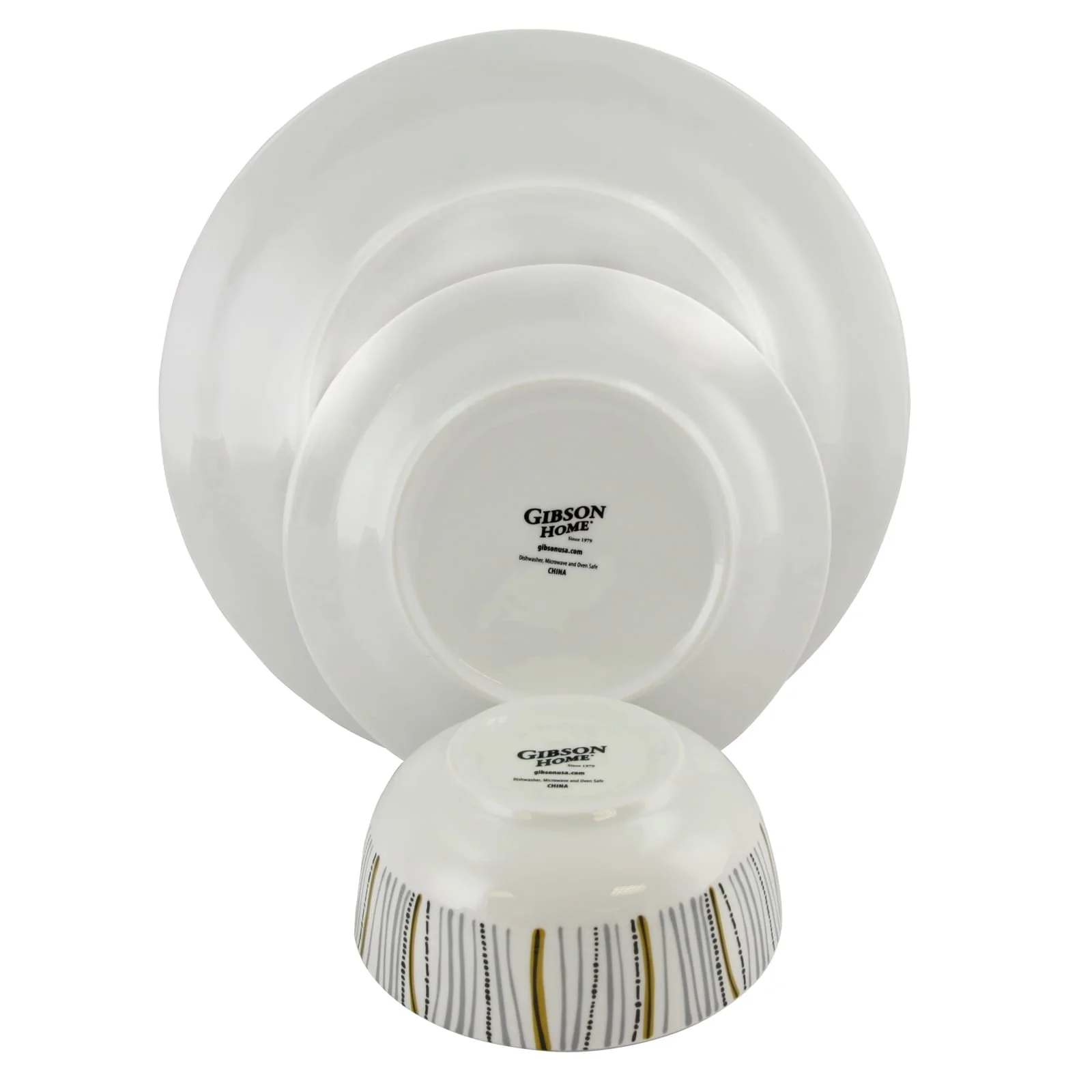 This Gibson Classic Burst 12 piece Set Has A Eye-Catching Pattern Border. This bright White Dinnerware With Colorful Trim Is Perfect For Casual, Everyday Use But Could Also Be Dressed Up For Festive Occasions. To Make Your Life Easier, this beautiful Ceramic set is Microwave and Dishwasher Safe. This set is a 12 piece set is for four which includes: Four Dinner plates in at 10.5 inches, Four Dessert plates in at 7.5 inches, and four Bowls in at 5.25 inches.Dinner Plate: 10.5' x 10.5' x 1'Dessert Plate: 7.5' x 7.5' x 1'Bowls: 5.25' x 5.25' x 2.75' Capacity: 25 FL OZ
