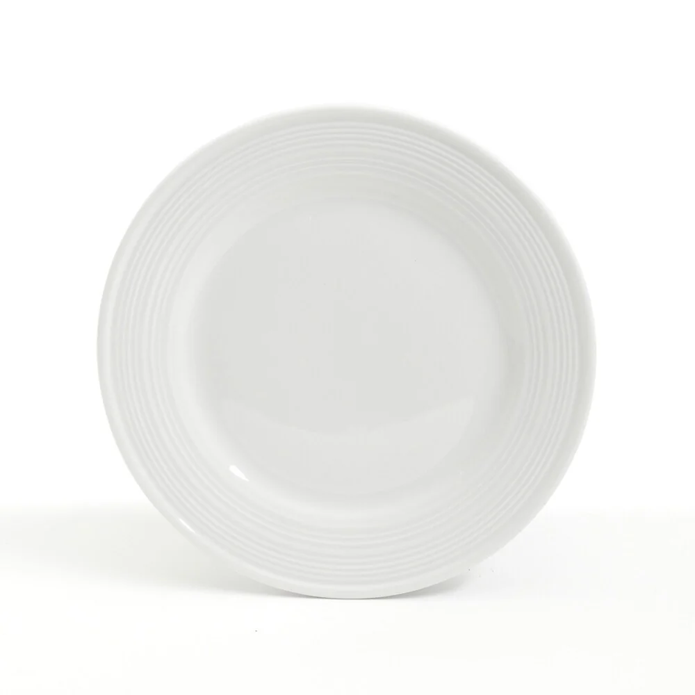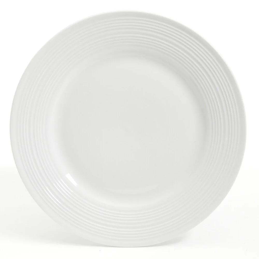 The Gibson Home Embossed Buffet 16 Piece Fine Ceramic Dinnerware Set in White adds a sleek touch to any tabletop. The rim of each piece in this stylish set features a series of concentric circles that provides this classic white dinnerware set with a contemporary look. Crafted from quality ceramic, this collection is durable enough for everyday mealtime.Set: 16 Piece DinnerwareCeramic: CeramicFinish: GlossColor: WhiteDishwasher safeMicrowave safeSet includes:Four dinner plates Four dessert plates Four 15 oz. bowlsFour 12 oz. mugsPer item measurements:Dinner plate: 10.5' diameter, 1' height, 1.55lbs. weight Dessert plate: 7.5' diameter, 0.5' height, 0.55lbs. weight Bowl: 7' diameter, 2' height, 15oz. capacity, 0.75lbs. weightMug: 4' height, 3.5' length, 2.5' width, 3' handle, 12oz. capacity, 0.85lbs. weight
