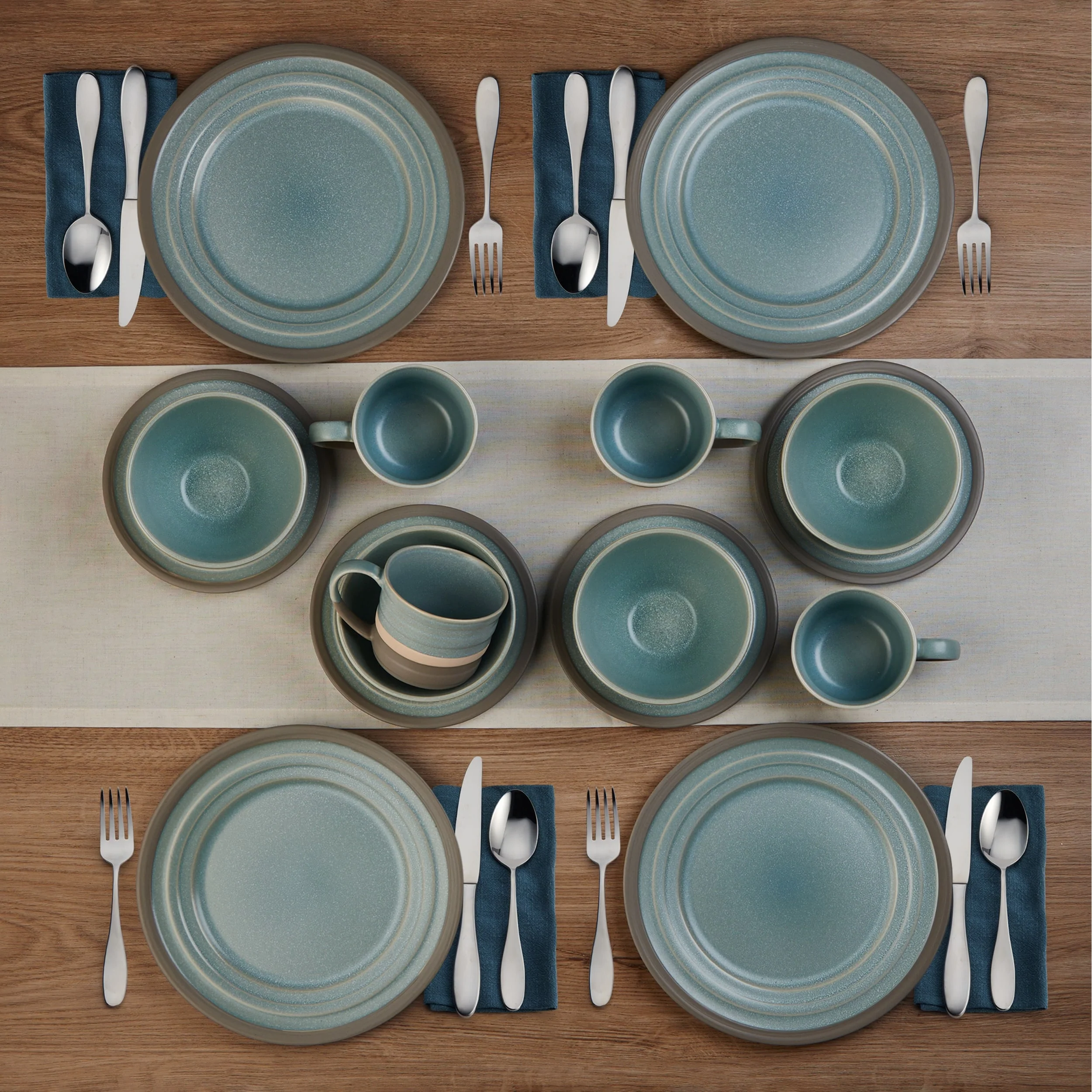 The subdued, contemporary look of this Pfaltzgraff Adina 16-Piece Dinnerware Set is an inviting presence on your casual table setting. Made of durable stoneware, this eye-catching dinnerware features a striking palette of prominent blue reactive glaze highlighted by deep gray borders, with a warm white band adding a distinct accent to the mug and bowl. 16-piece set, service for 4, includes 4 each of: 10-3/4 inch dinner plate; 7-1/2 inch salad plate; 3-1/4 inch tall 23-ounce bowl with a 5-1/2 inch diameter; 3.5-inch tall 13.5-ounce mug with a 4-inch diameter, 4.75-inch diameter with handle. Microwave and dishwasher safe.