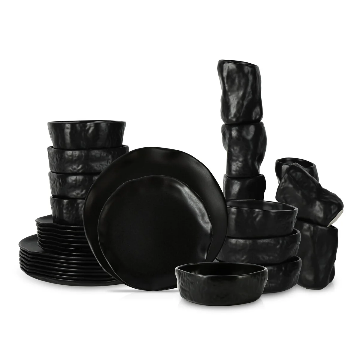 - SERVICE FOR 4 or 8: This stoneware set includes dinner plates (11.25in), salad plates (8.25in), cups (9fl.oz.) and bowls (19.8fl.oz.). There are 2 designs of cups and bowls within the same set and the unique designs of the pieces make the items hard to stack.