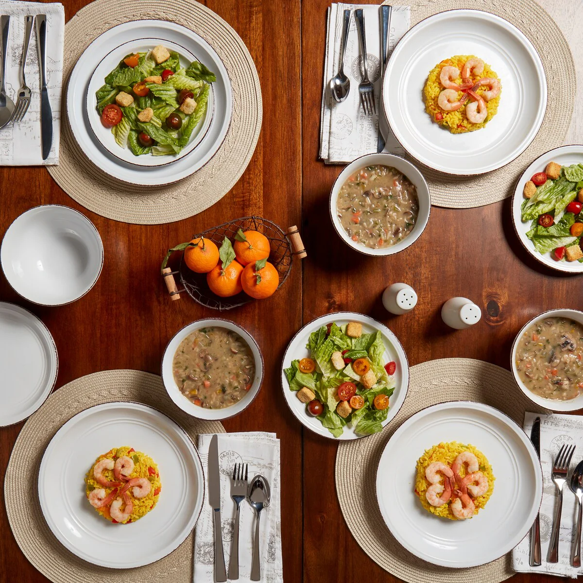 Bring the charm of vintage farmhouse style to your table with the Tabletops Gallery 12PC White Farmhouse Dinnerware Set. Crafted from high-quality stoneware, this classic semi-glazed white dinnerware set is perfect for any occasion. The water-tight seal and non-porous layer of the natural glaze make these dishes virtually impermeable to liquid, stains, and odors. Each round plate features a deep raised rim with subtle line details and a light two-tone antique rub-through in a natural earth brown, adding a touch of rustic elegance. Dishwasher safe for easy cleanup, and oven-safe up to 300F (for warming only), this dinnerware set is both stylish and functional.