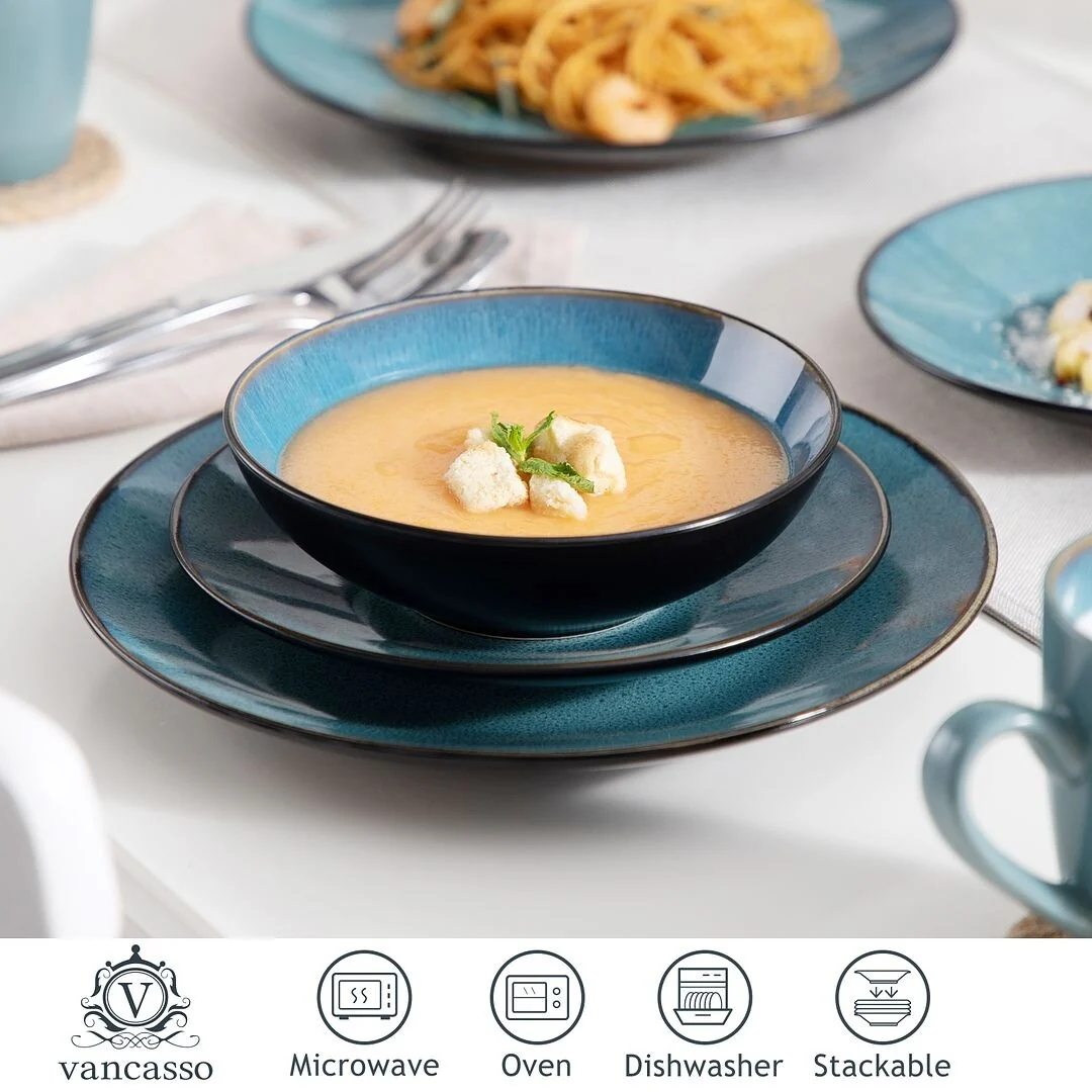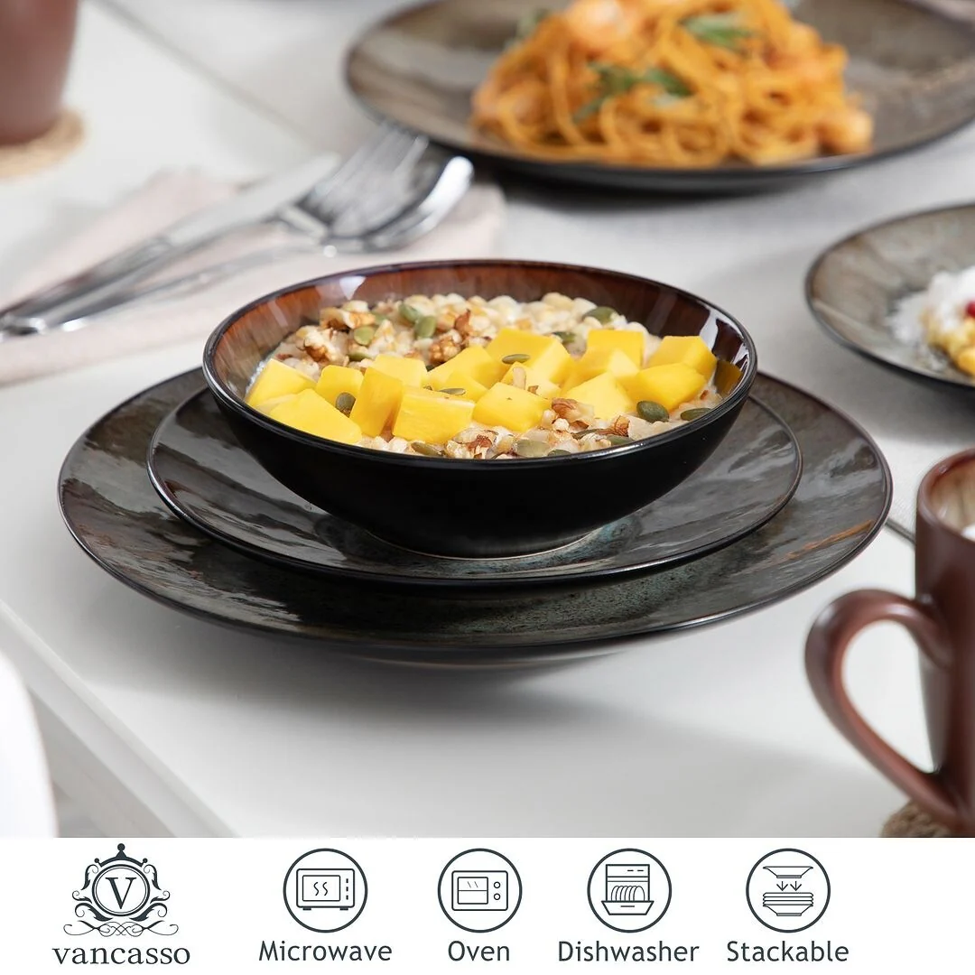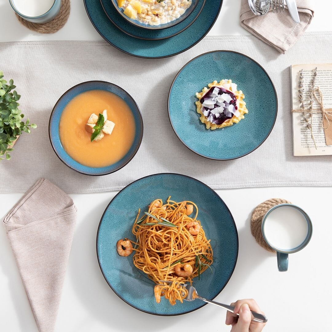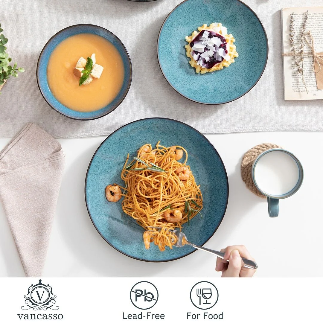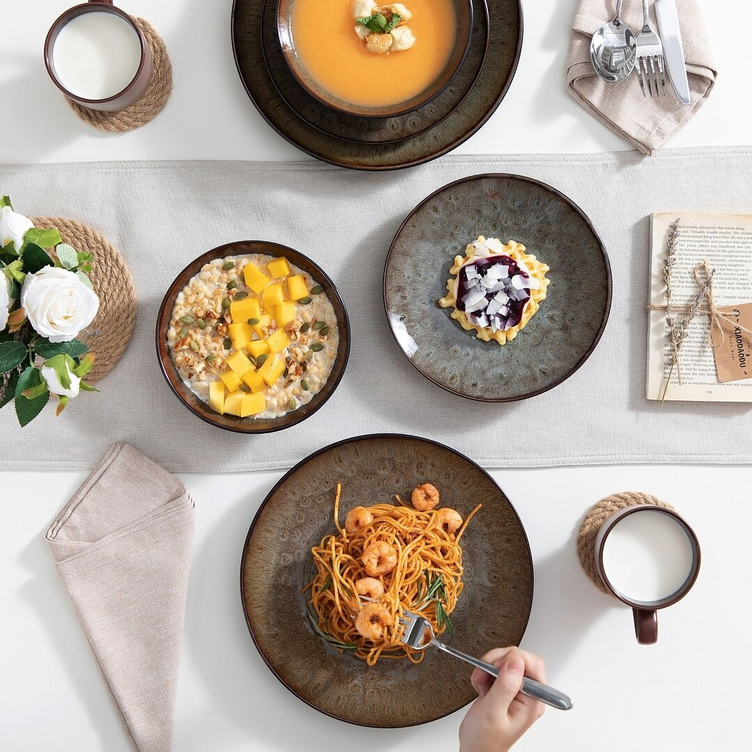 The matte black surface of the plates and bowls with black glazed edges exudes a simple and luxurious design, making every meal a special occasion. Crafted by hand, each piece has its own distinct shape and texture, adding to the set's charm. This set is made of sturdy stoneware and is available in green, brown, and blue. It is dishwasher, freezer, and microwave safe, and the non-glazed bottom provides durability and prevents slipping.