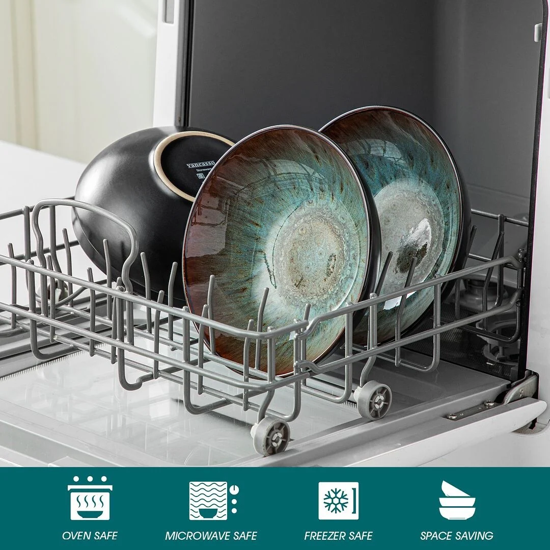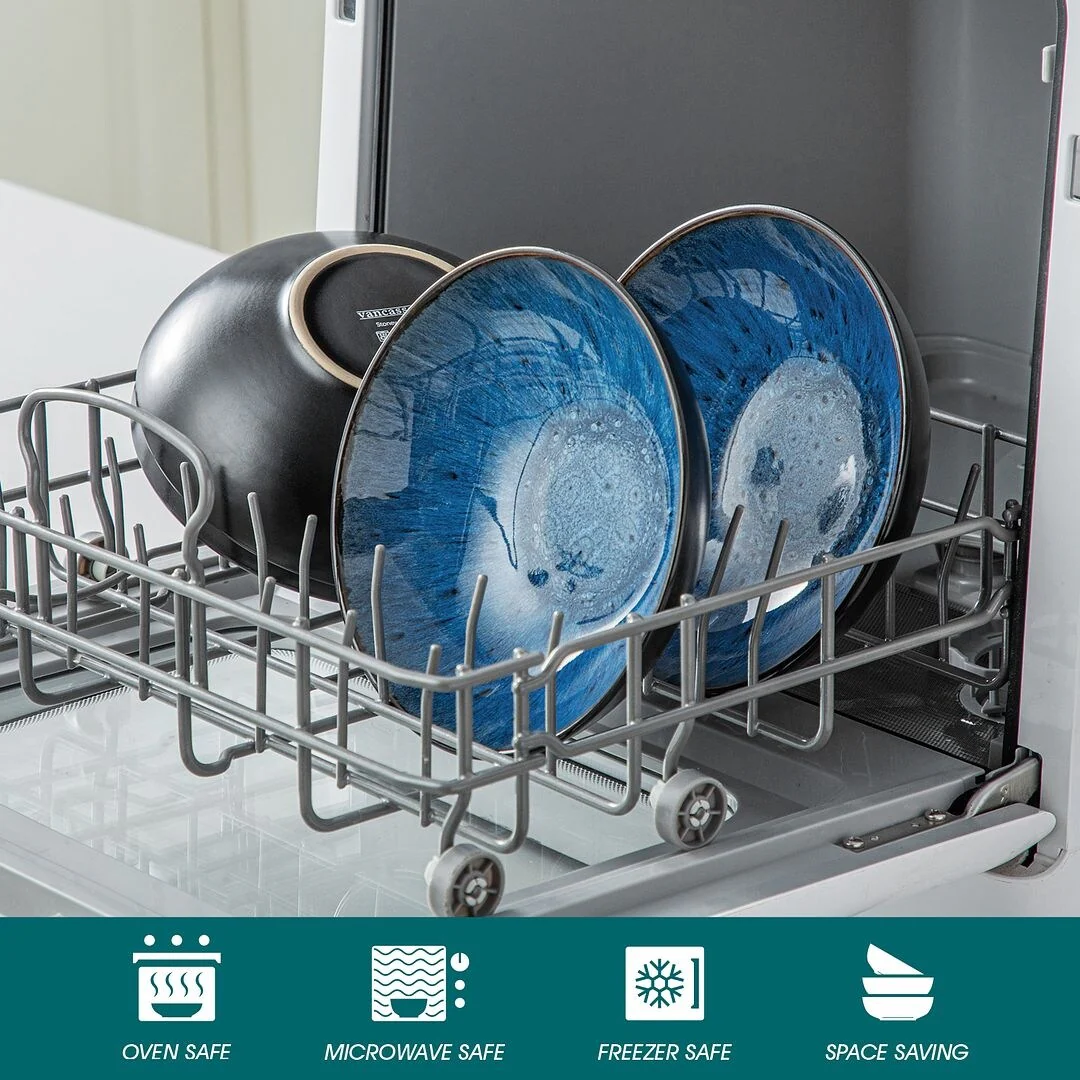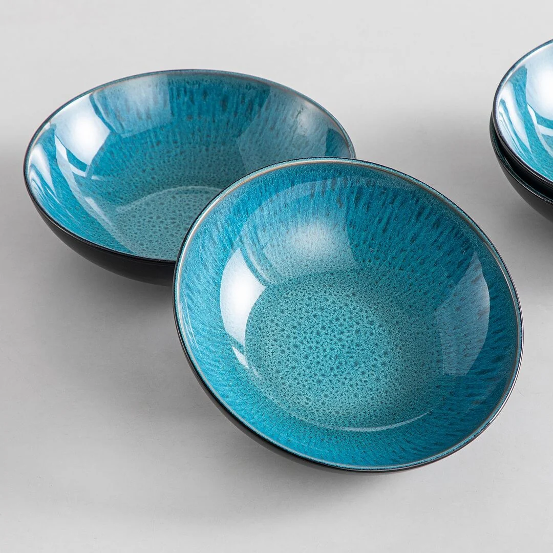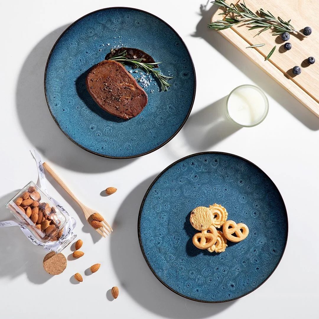 The matte black surface of the plates and bowls with black glazed edges exudes a simple and luxurious design, making every meal a special occasion. Crafted by hand, each piece has its own distinct shape and texture, adding to the set's charm. This set is made of sturdy stoneware and is available in green, brown, and blue. It is dishwasher, freezer, and microwave safe, and the non-glazed bottom provides durability and prevents slipping.