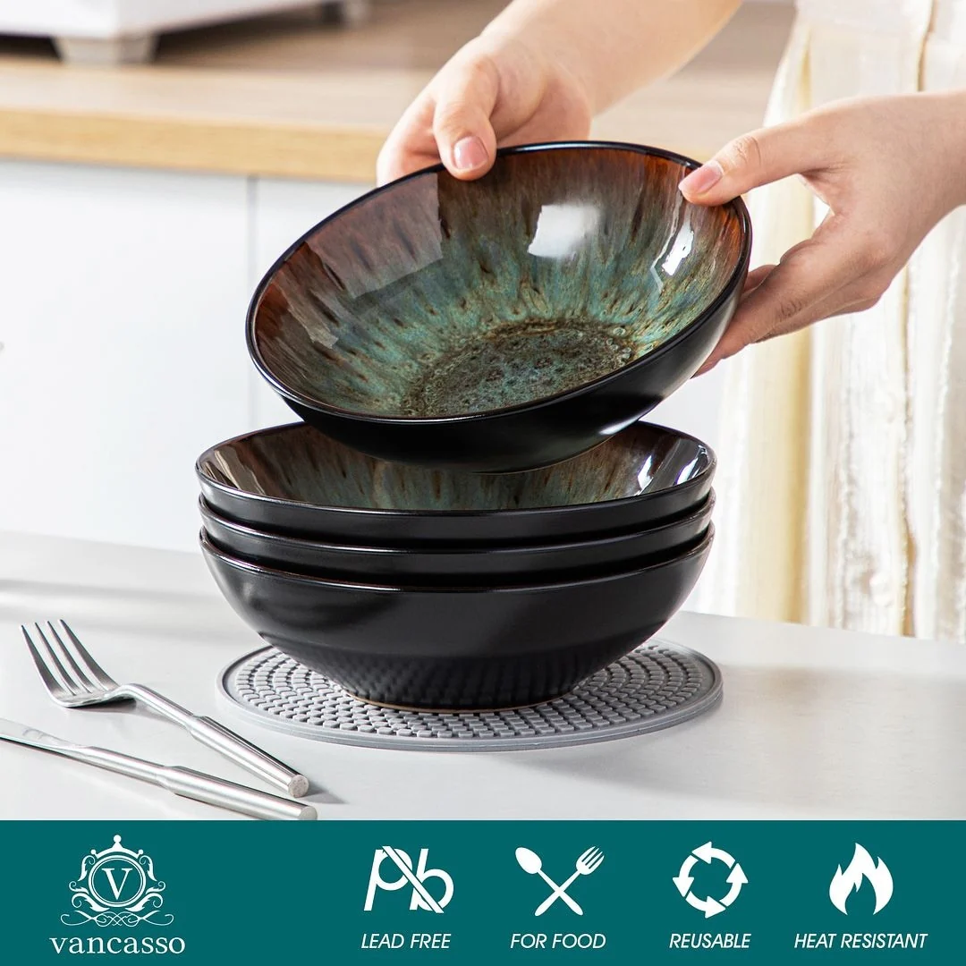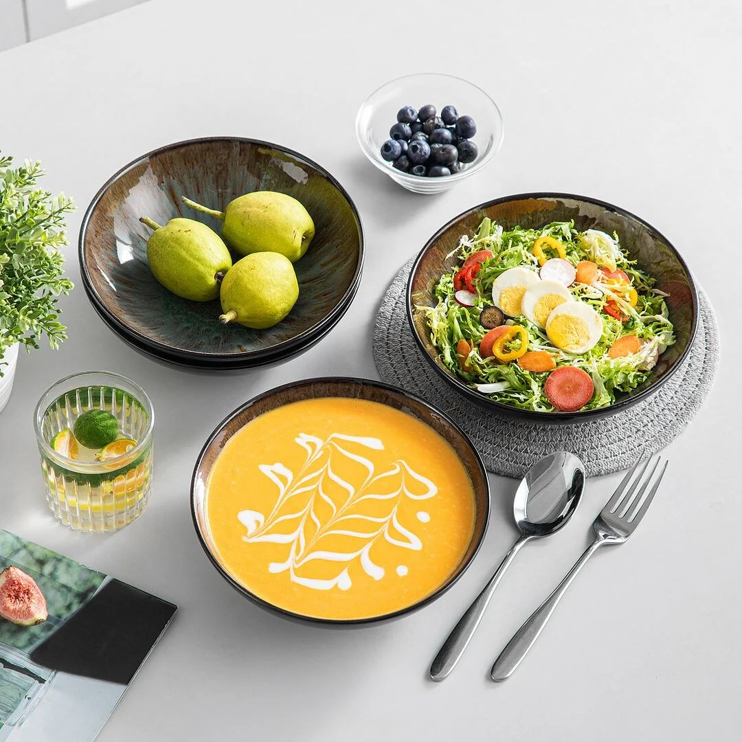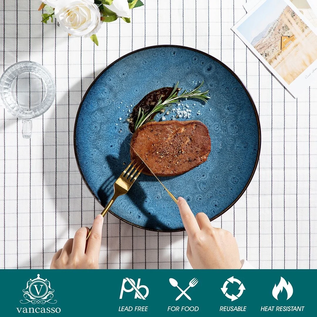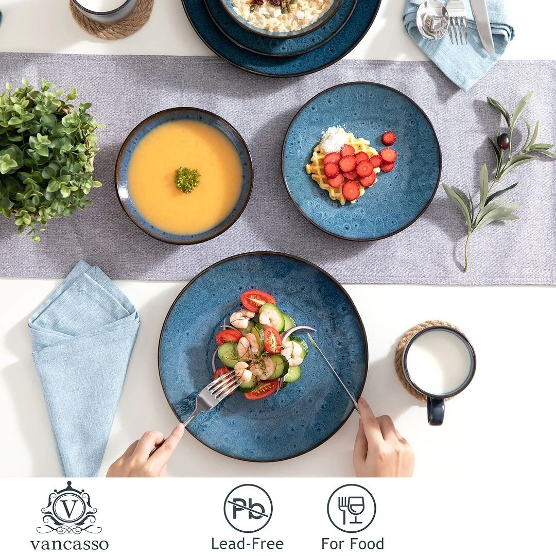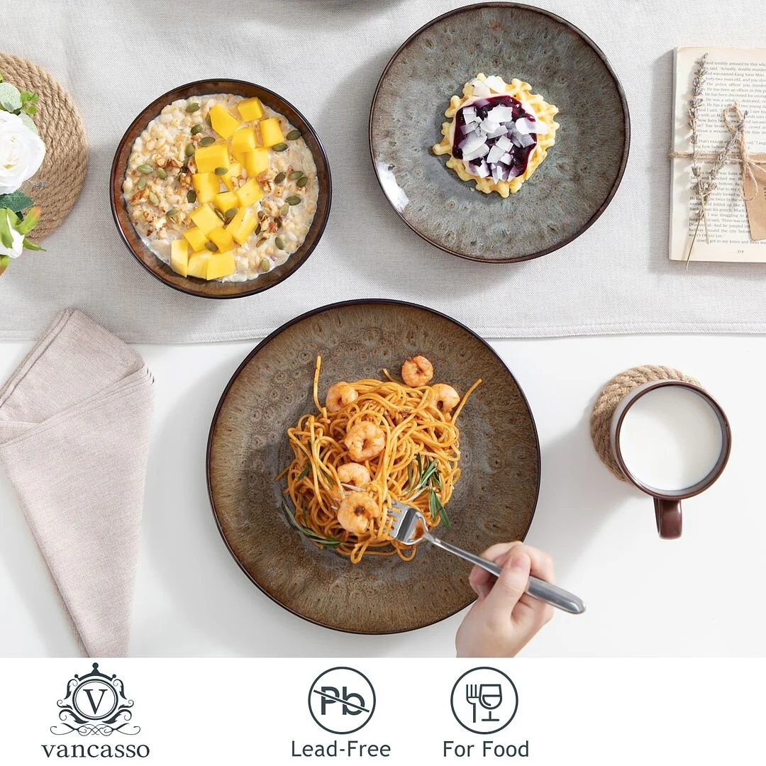 The matte black surface of the plates and bowls with black glazed edges exudes a simple and luxurious design, making every meal a special occasion. Crafted by hand, each piece has its own distinct shape and texture, adding to the set's charm. This set is made of sturdy stoneware and is available in green, brown, and blue. It is dishwasher, freezer, and microwave safe, and the non-glazed bottom provides durability and prevents slipping.