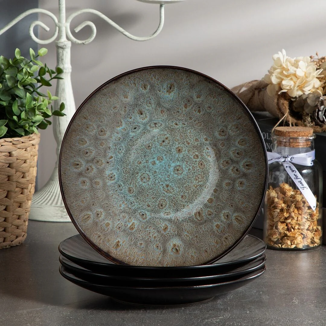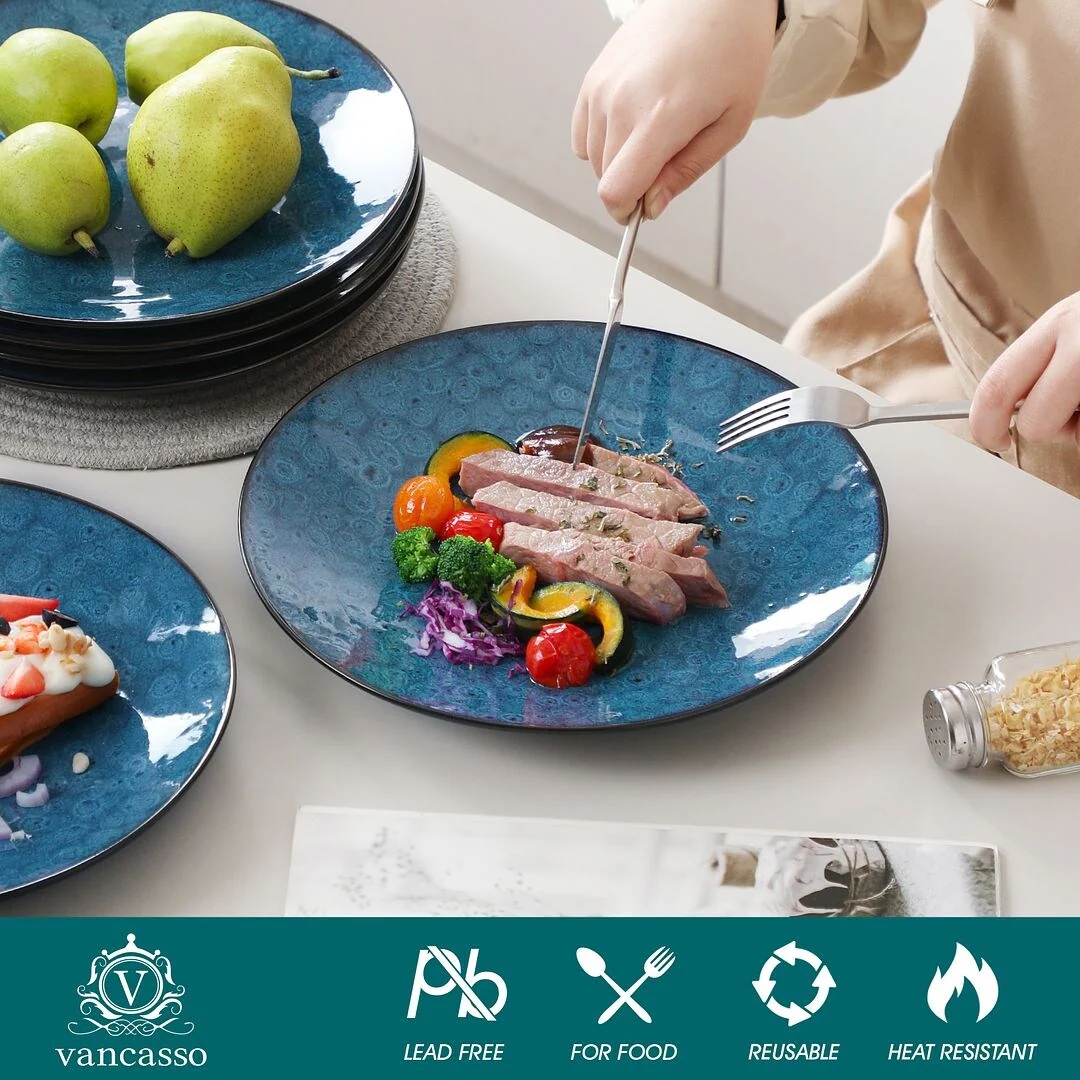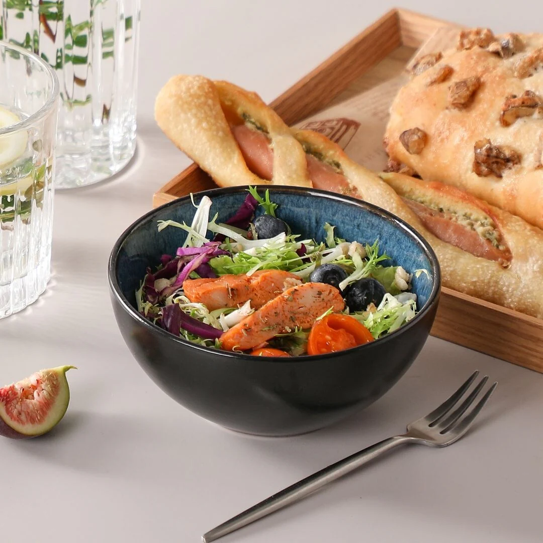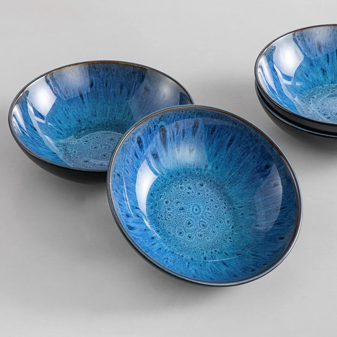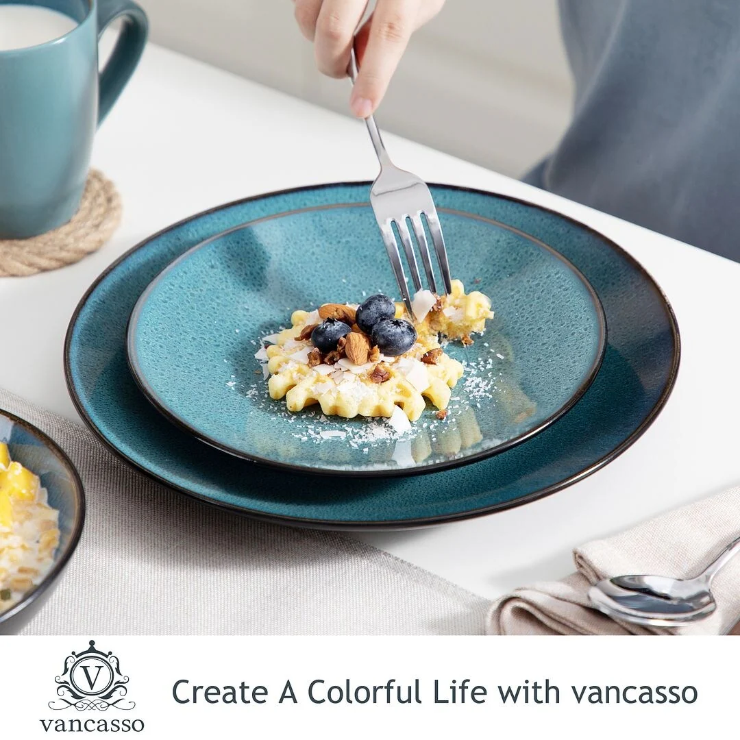 The matte black surface of the plates and bowls with black glazed edges exudes a simple and luxurious design, making every meal a special occasion. Crafted by hand, each piece has its own distinct shape and texture, adding to the set's charm. This set is made of sturdy stoneware and is available in green, brown, and blue. It is dishwasher, freezer, and microwave safe, and the non-glazed bottom provides durability and prevents slipping.